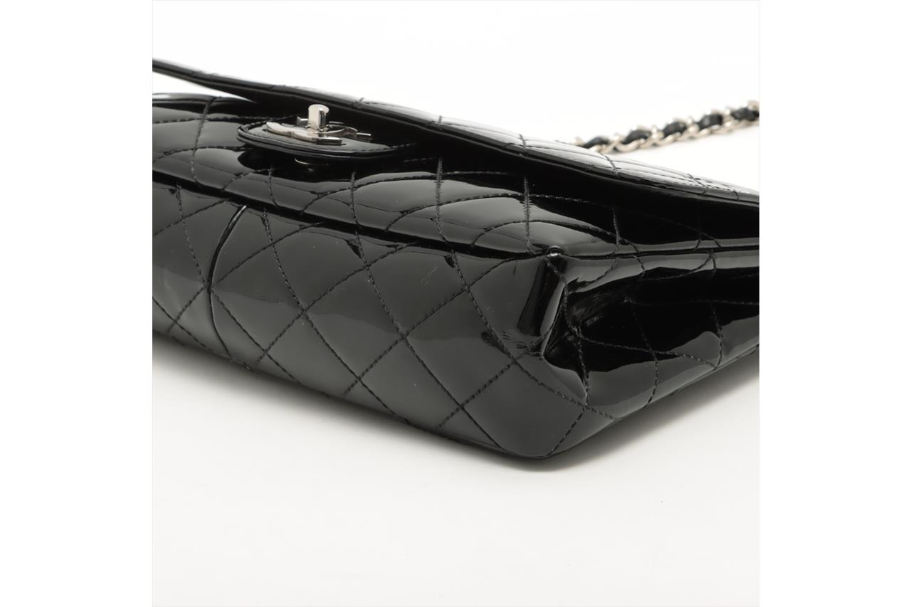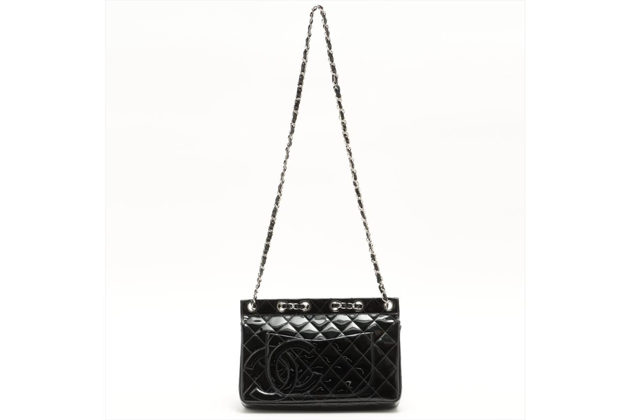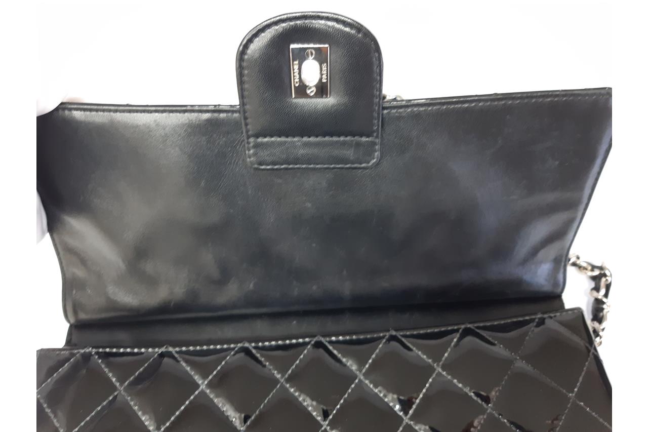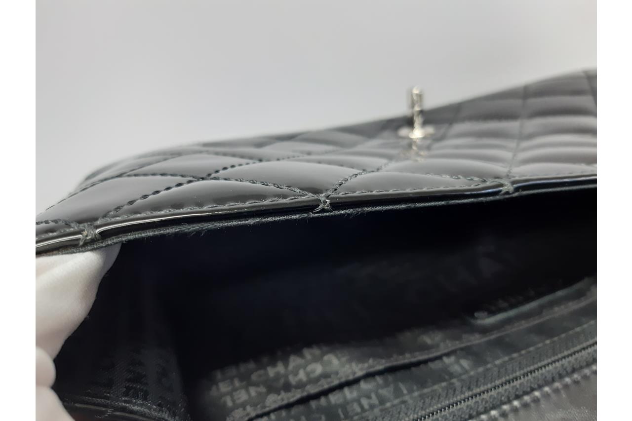 Chanel Classic Chain through Flap Supermodel diamond quilted in bag in black patent Leather with a rear pocket. Silver-tone hardware, logo printed black nylon interior lining with zipped and patch pockets. Flap with classic CC turnlock closure on front. Approximate dimensions: 30.5cm(L) x 20.5cm(H) x 7cm(D), 57cm single chain and 27cm double strap heights. With Entrupy Certificate of Authenticity. (Pre-owned)
