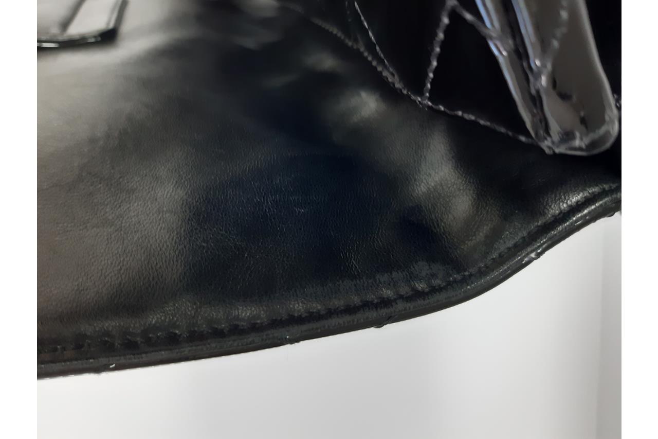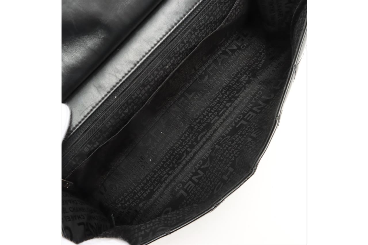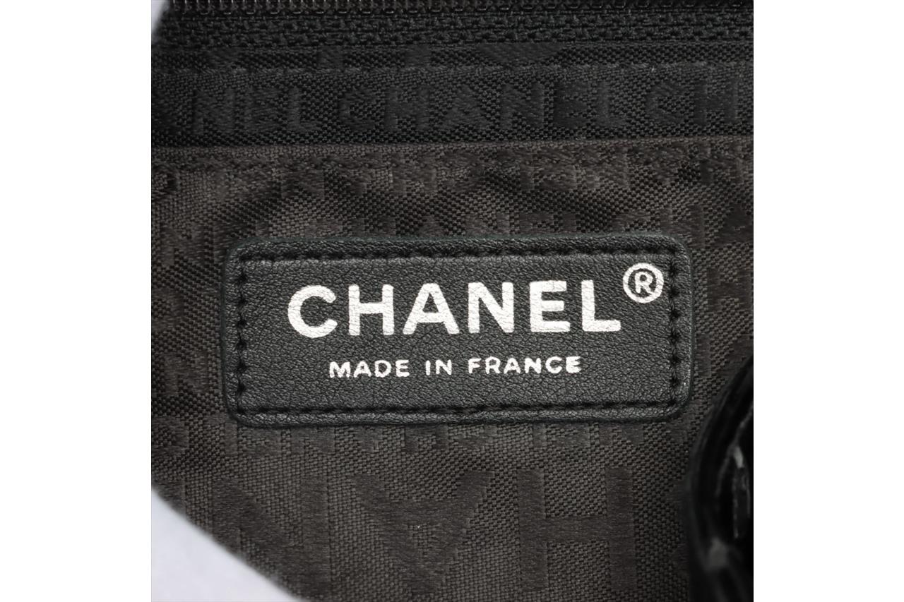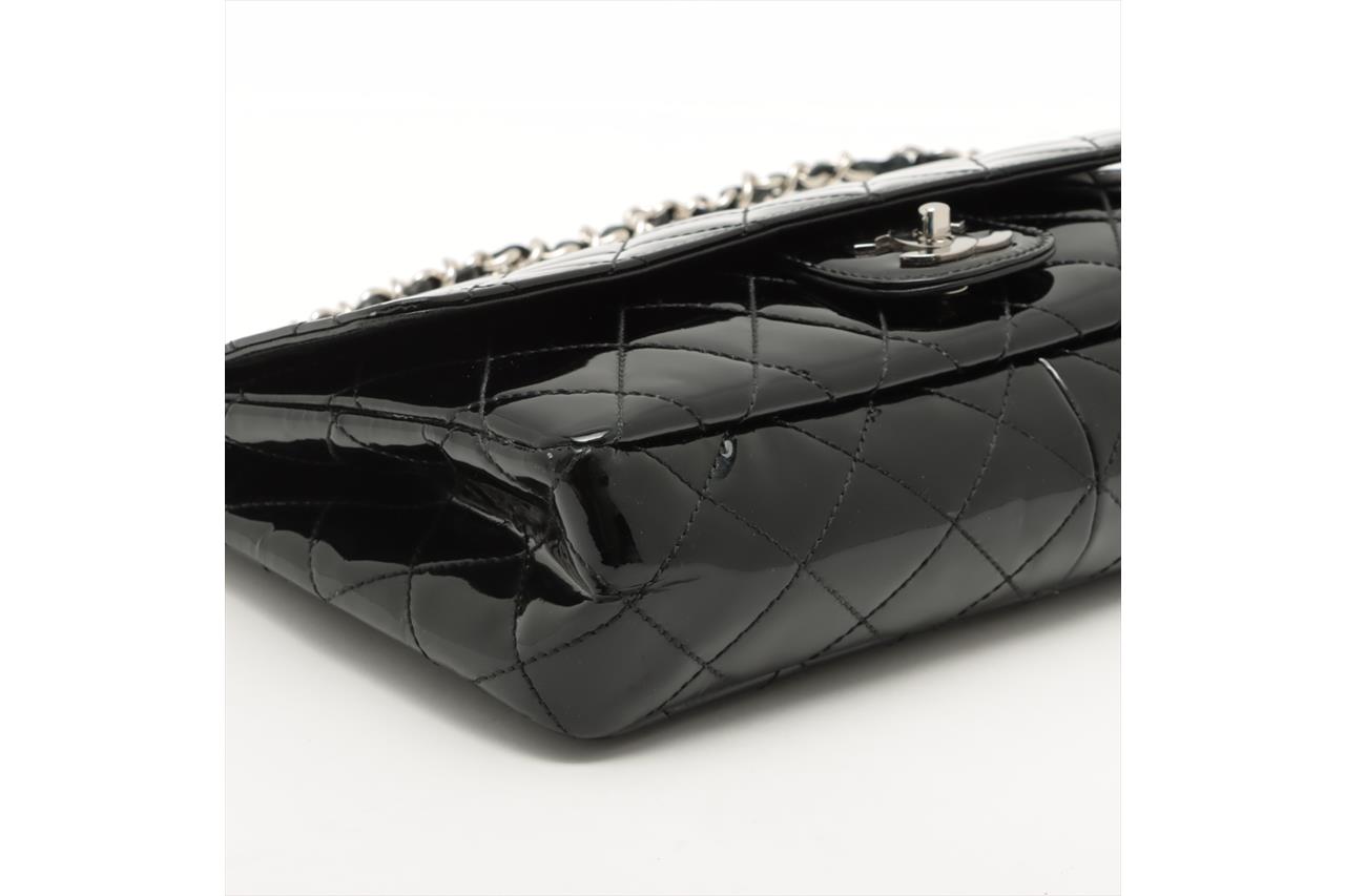 Chanel Classic Chain through Flap Supermodel diamond quilted in bag in black patent Leather with a rear pocket. Silver-tone hardware, logo printed black nylon interior lining with zipped and patch pockets. Flap with classic CC turnlock closure on front. Approximate dimensions: 30.5cm(L) x 20.5cm(H) x 7cm(D), 57cm single chain and 27cm double strap heights. With Entrupy Certificate of Authenticity. (Pre-owned)