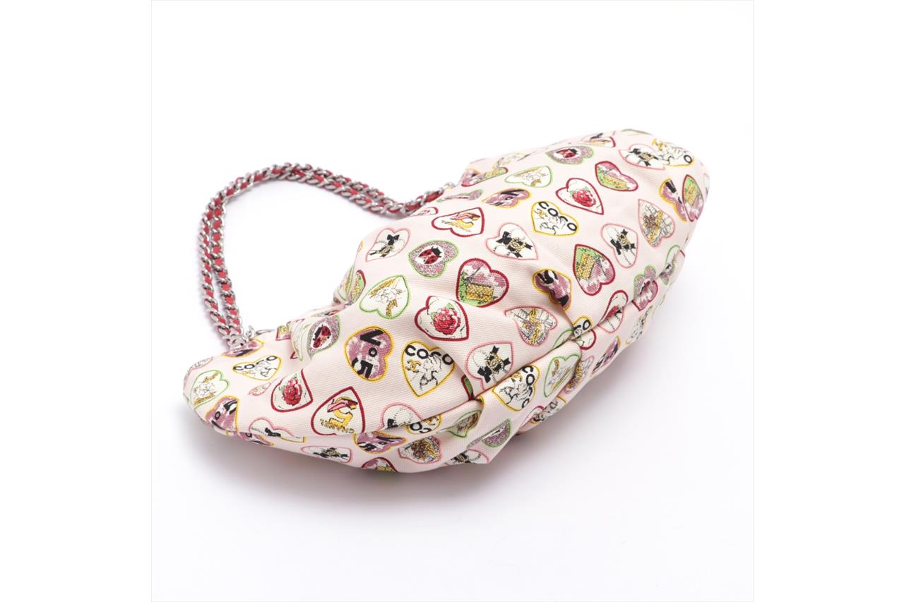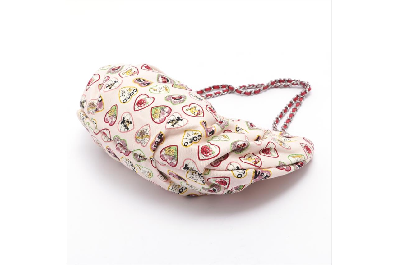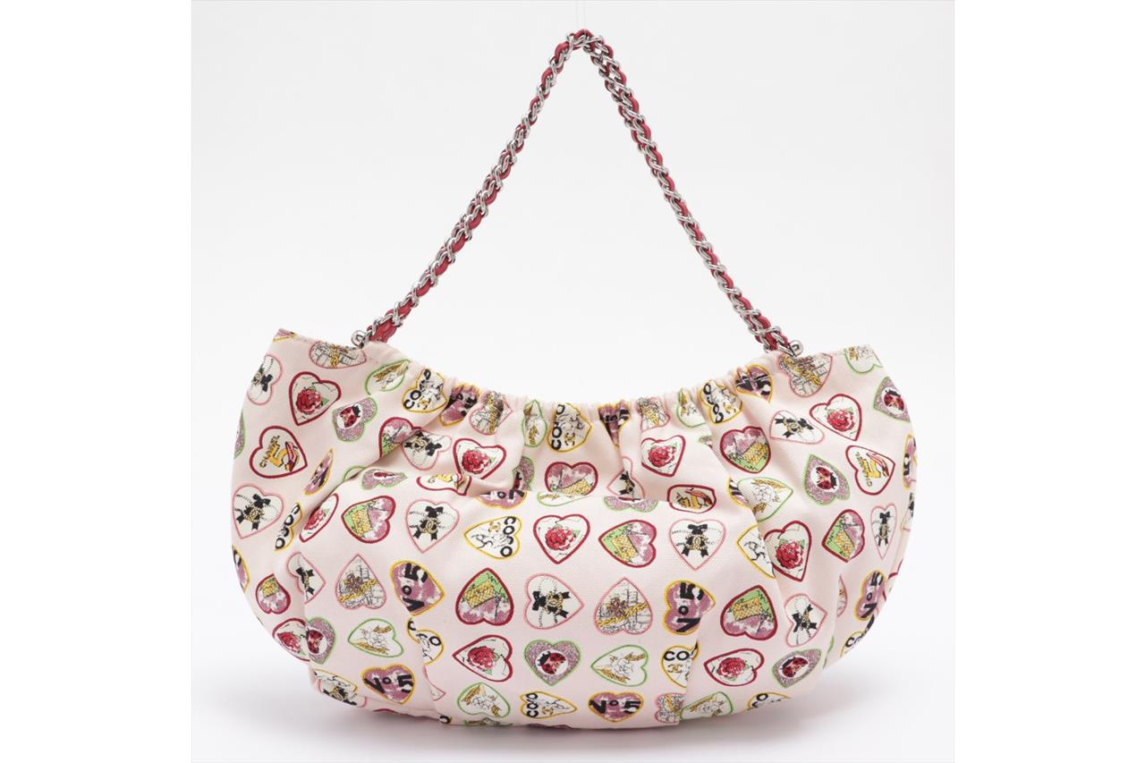 Chanel Heart Charm Motif Hobo Bag. Circa 2005-2006. Pastel pink canvas with colourful heart charm pattern. The hearts include motifs of Chanel classics. Silver-tone hardware, chain link, fuchsia leather threaded dual shoulder straps, elasticated top and CC charm. Approximate dimensions: 32cm (L) x 19cm (H) x 8cm (D). With original Chanel authenticity card and dust bag. With Entrupy Certificate of Authenticity (Pre-owned).