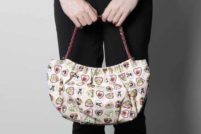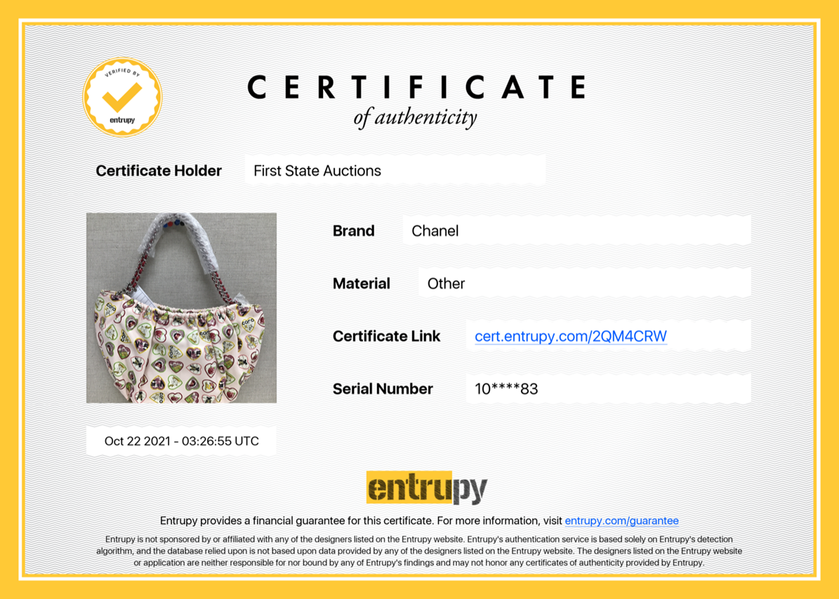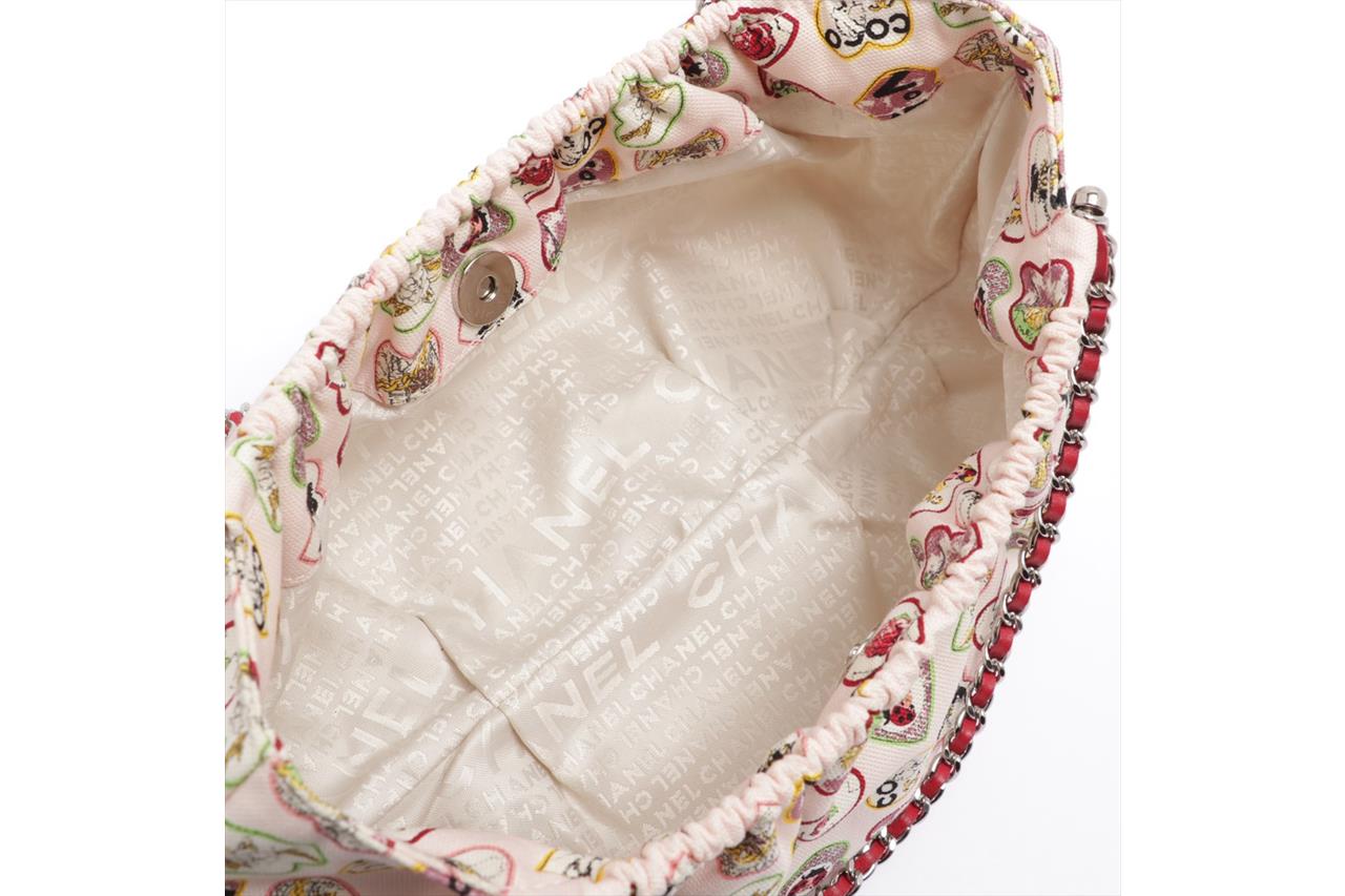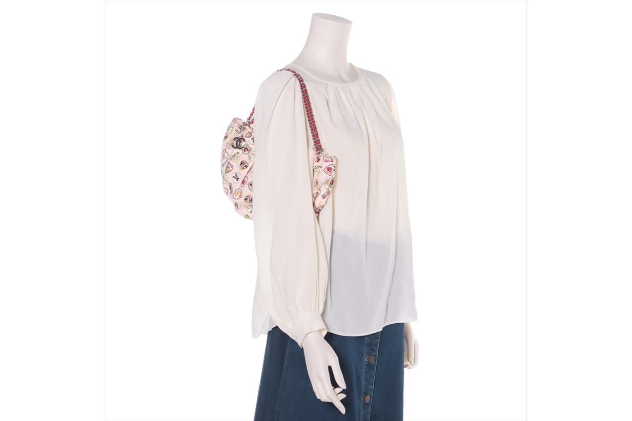 Chanel Heart Charm Motif Hobo Bag. Circa 2005-2006. Pastel pink canvas with colourful heart charm pattern. The hearts include motifs of Chanel classics. Silver-tone hardware, chain link, fuchsia leather threaded dual shoulder straps, elasticated top and CC charm. Approximate dimensions: 32cm (L) x 19cm (H) x 8cm (D). With original Chanel authenticity card and dust bag. With Entrupy Certificate of Authenticity (Pre-owned).