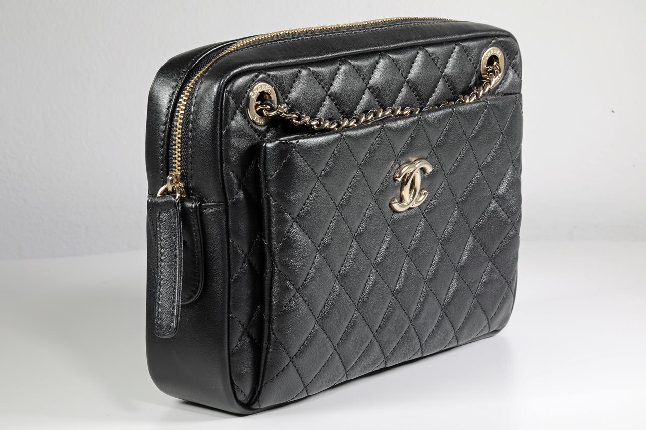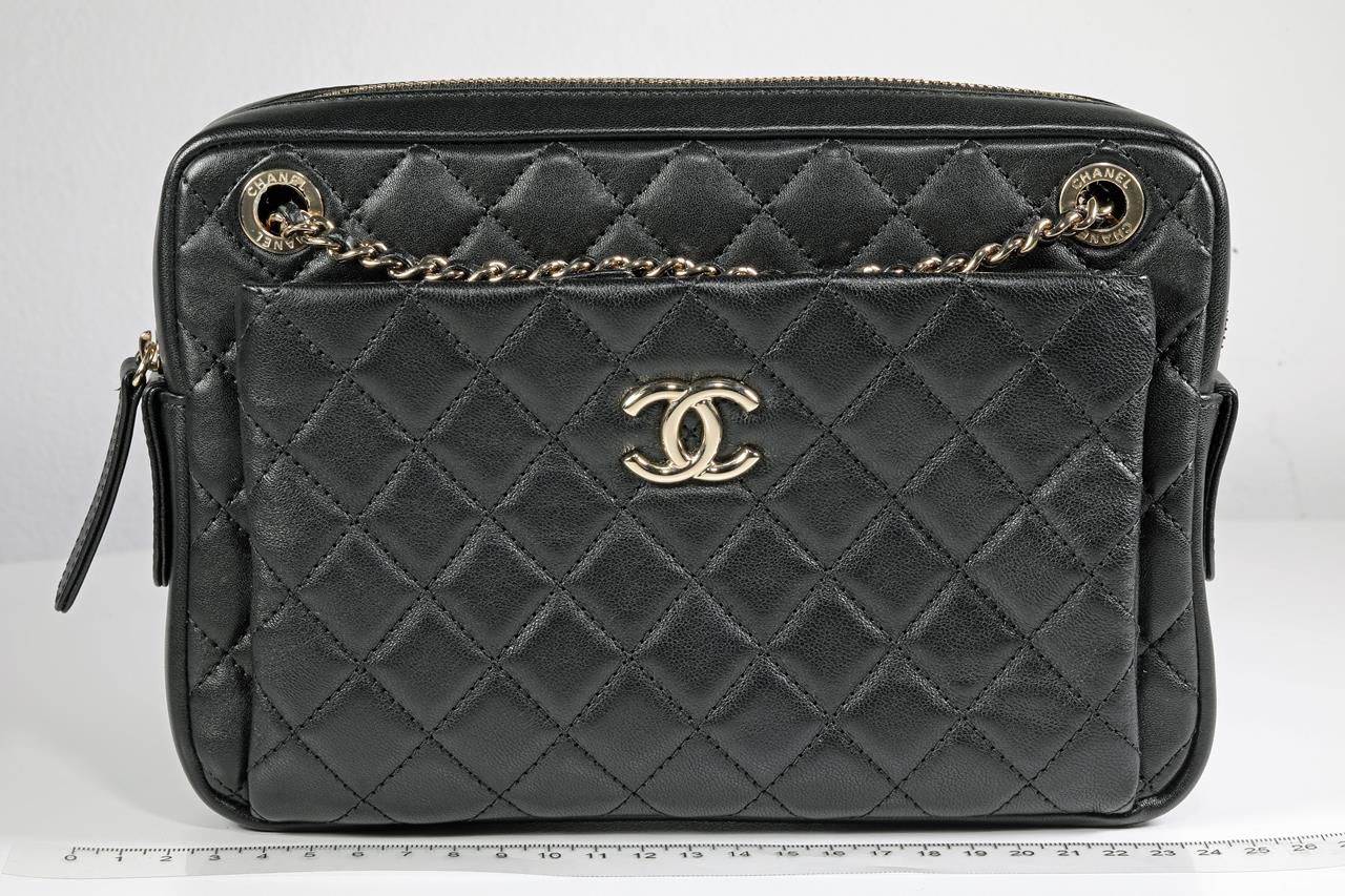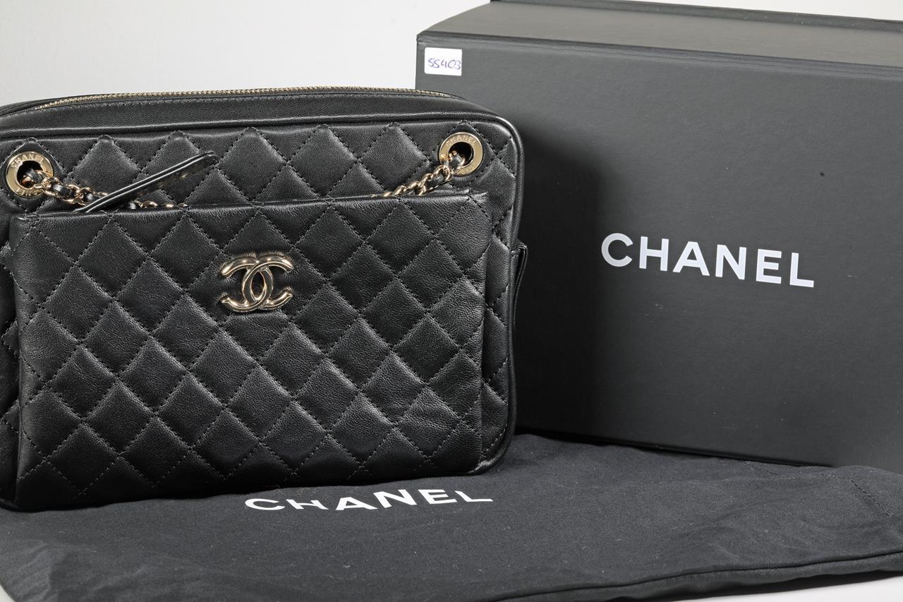 Chanel handbag with diamond quilted black leather with gold tone hardware, internal logo stamp, internal zip pocket and front zip pouch. Dimensions: 22.5 x 15.6 x 6cm. Chanel authenticity card, Entrupy certificate of authenticity, With copy of Chanel receipt, dustbag and Chanel box. (As New)