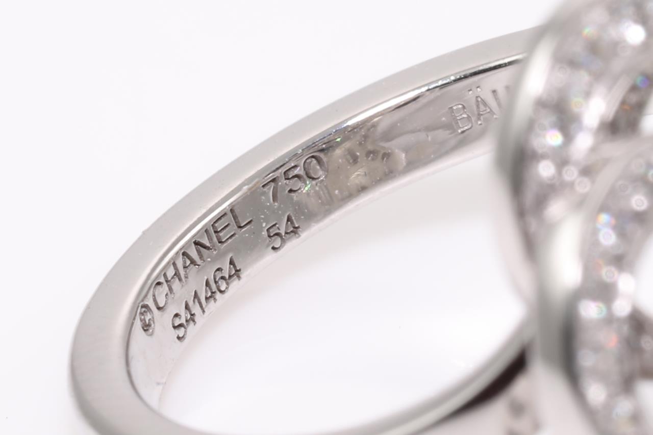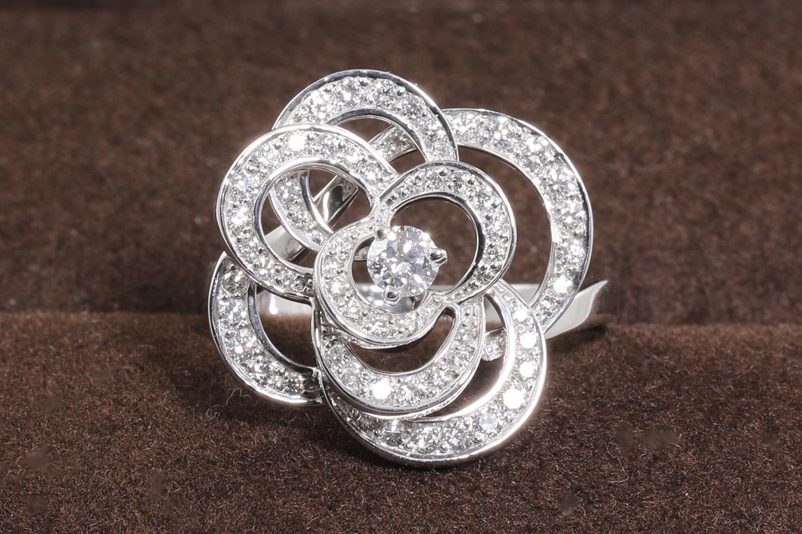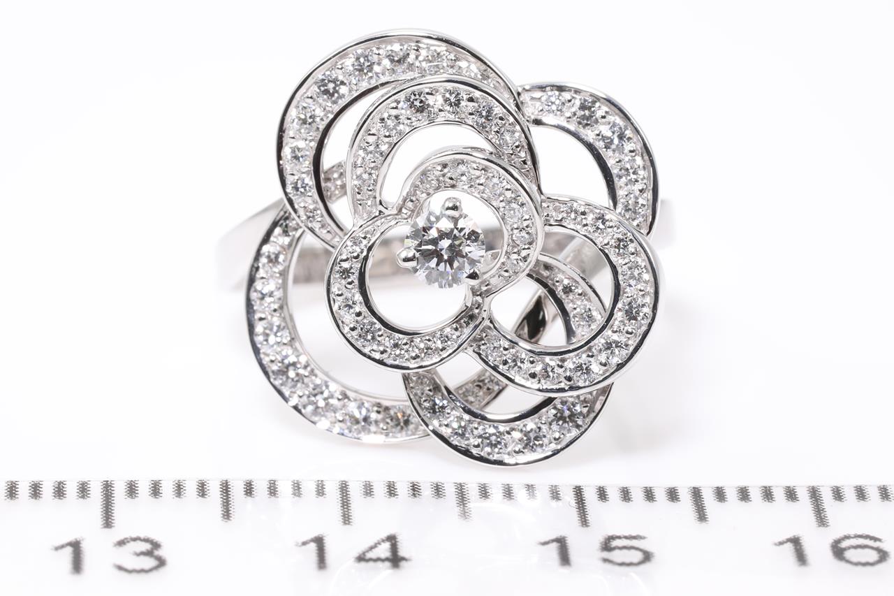 Chanel Fil De Camelia Diamond ring medium version. Diamonds totalling approximately 0.72cts (Estimated grading: F VS). Design ref# J2579. 18ct white gold. With certificate #414483. Ring size N. Weight: 6g (Pre-owned)