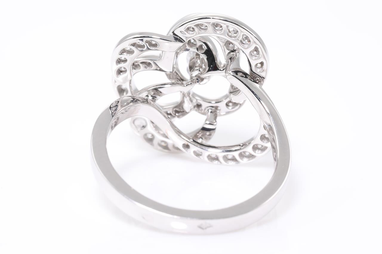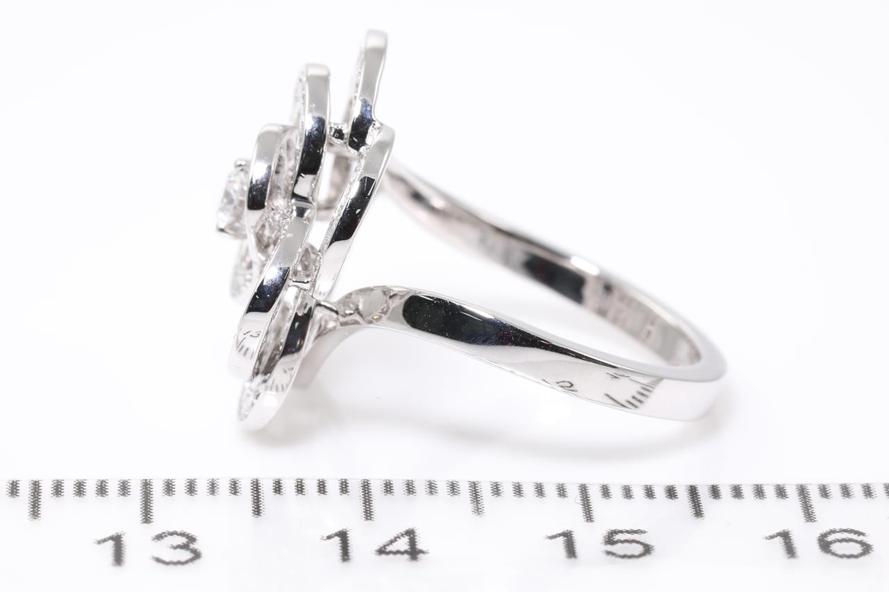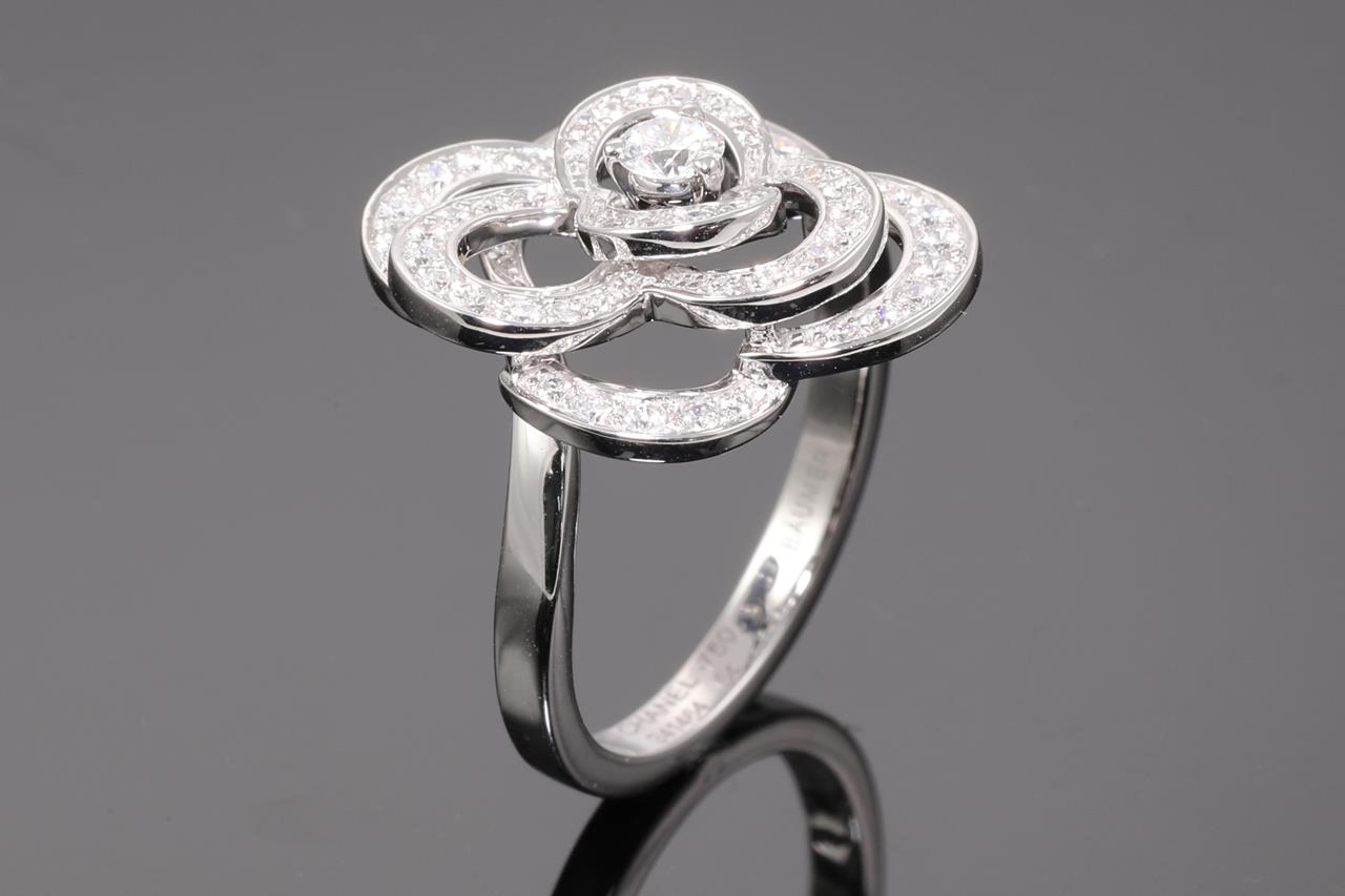 Chanel Fil De Camelia Diamond ring medium version. Diamonds totalling approximately 0.72cts (Estimated grading: F VS). Design ref# J2579. 18ct white gold. With certificate #414483. Ring size N. Weight: 6g (Pre-owned)