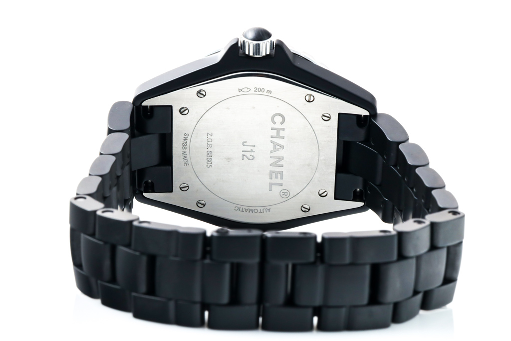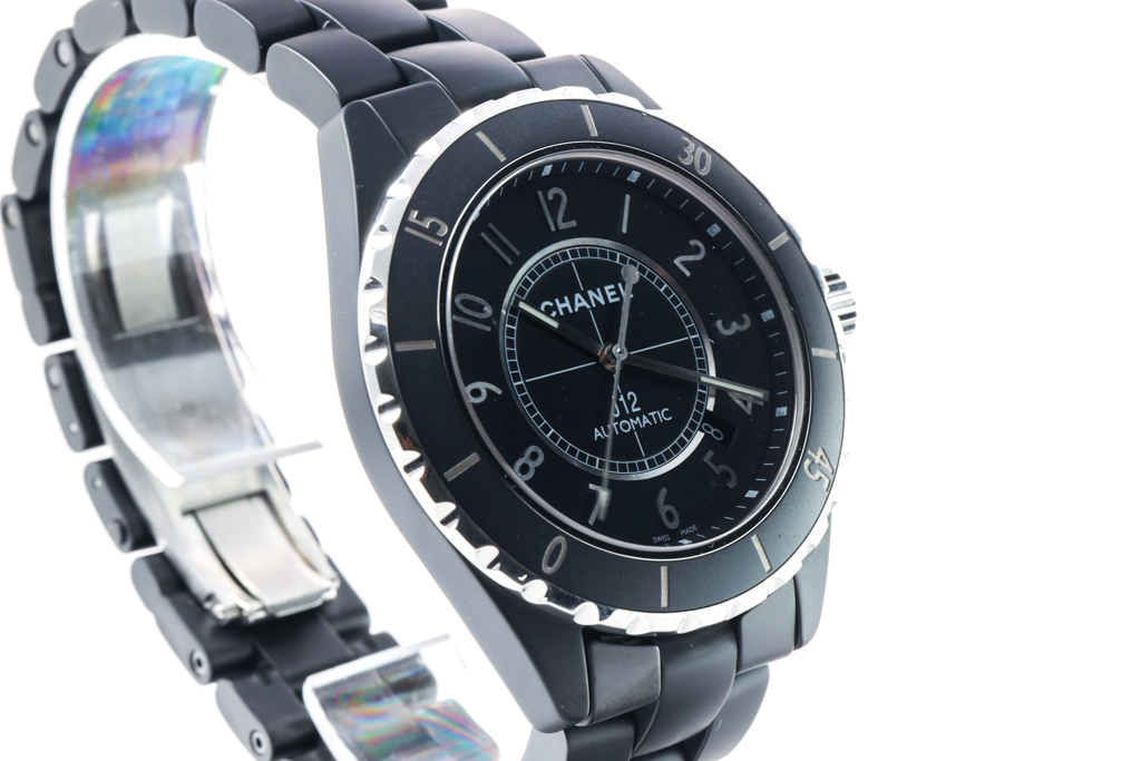 Chanel J12 ceramic automatic mens watch. Black dial, date, case diameter: 42mm, wrist size: 19.5cm, Swiss made. Ref# H3131. With Chanel black ceramic bracelet and clasp. With Certificate of Authenticity, Chanel International Warranty Card dated 02/2015 and Chanel box 3 month FSA warranty. (Pre-owned)