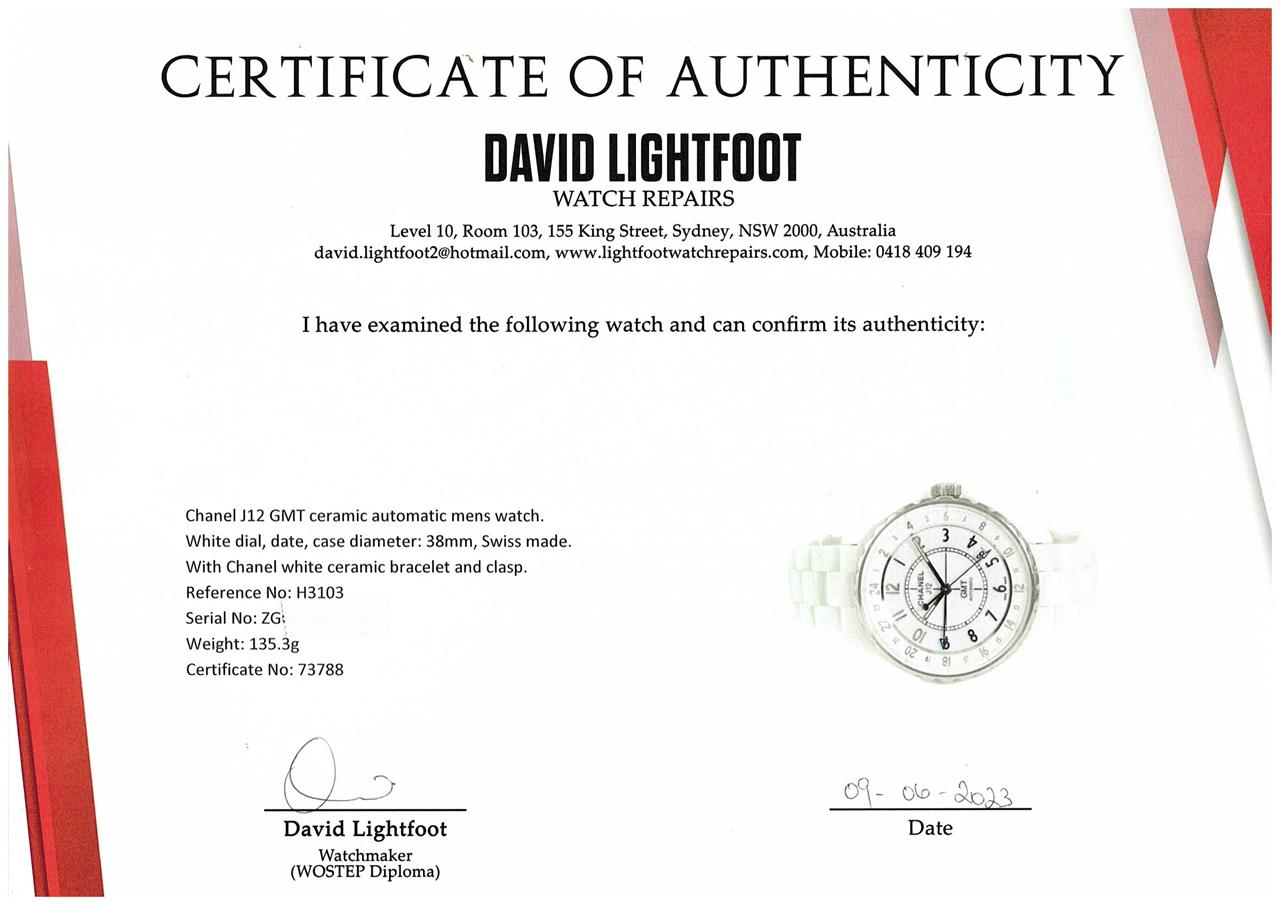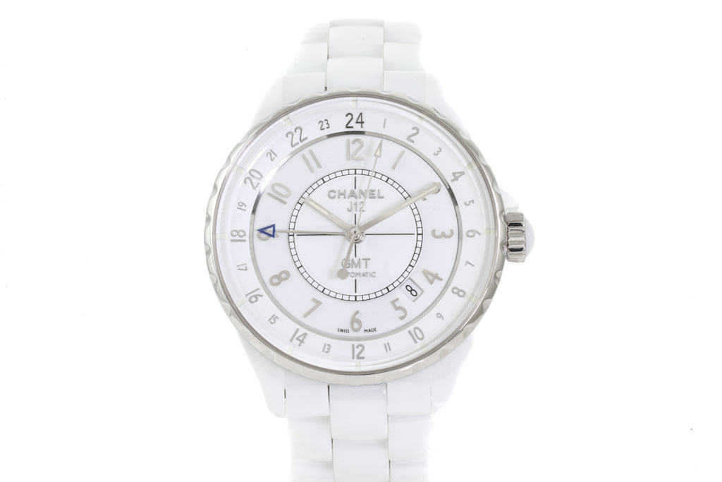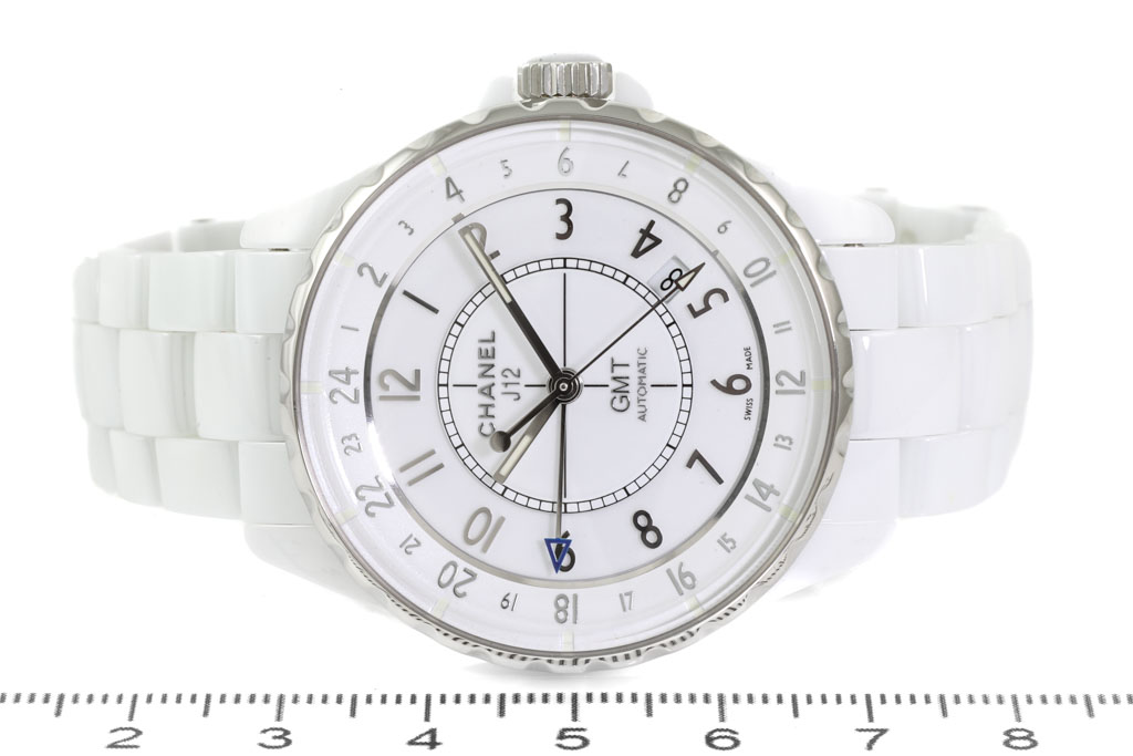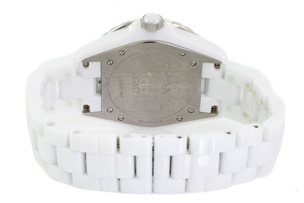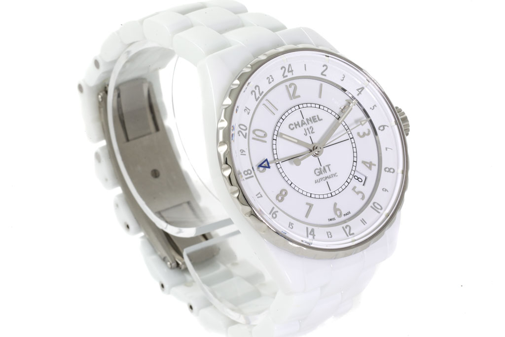 Chanel J12 GMT ceramic automatic mens watch. White dial, date, case diameter: 38mm, wrist size: 17cm, Swiss made. Ref# H3103. With Chanel white ceramic bracelet and clasp. With Certificate of Authenticity. 3 month FSA warranty. (Pre-owned)