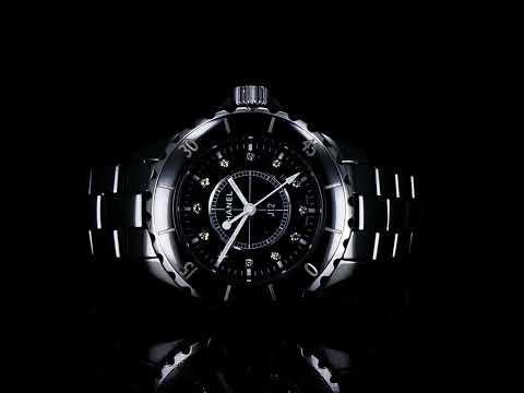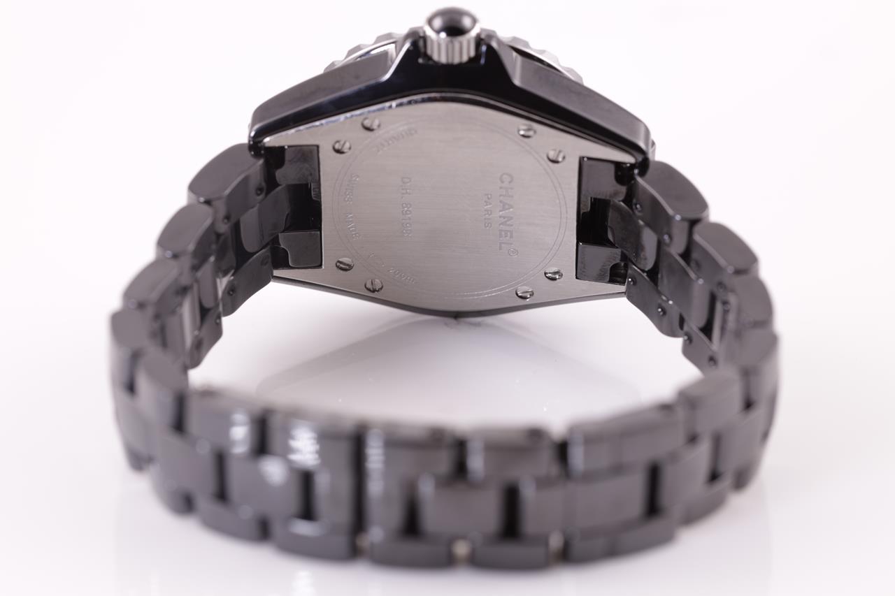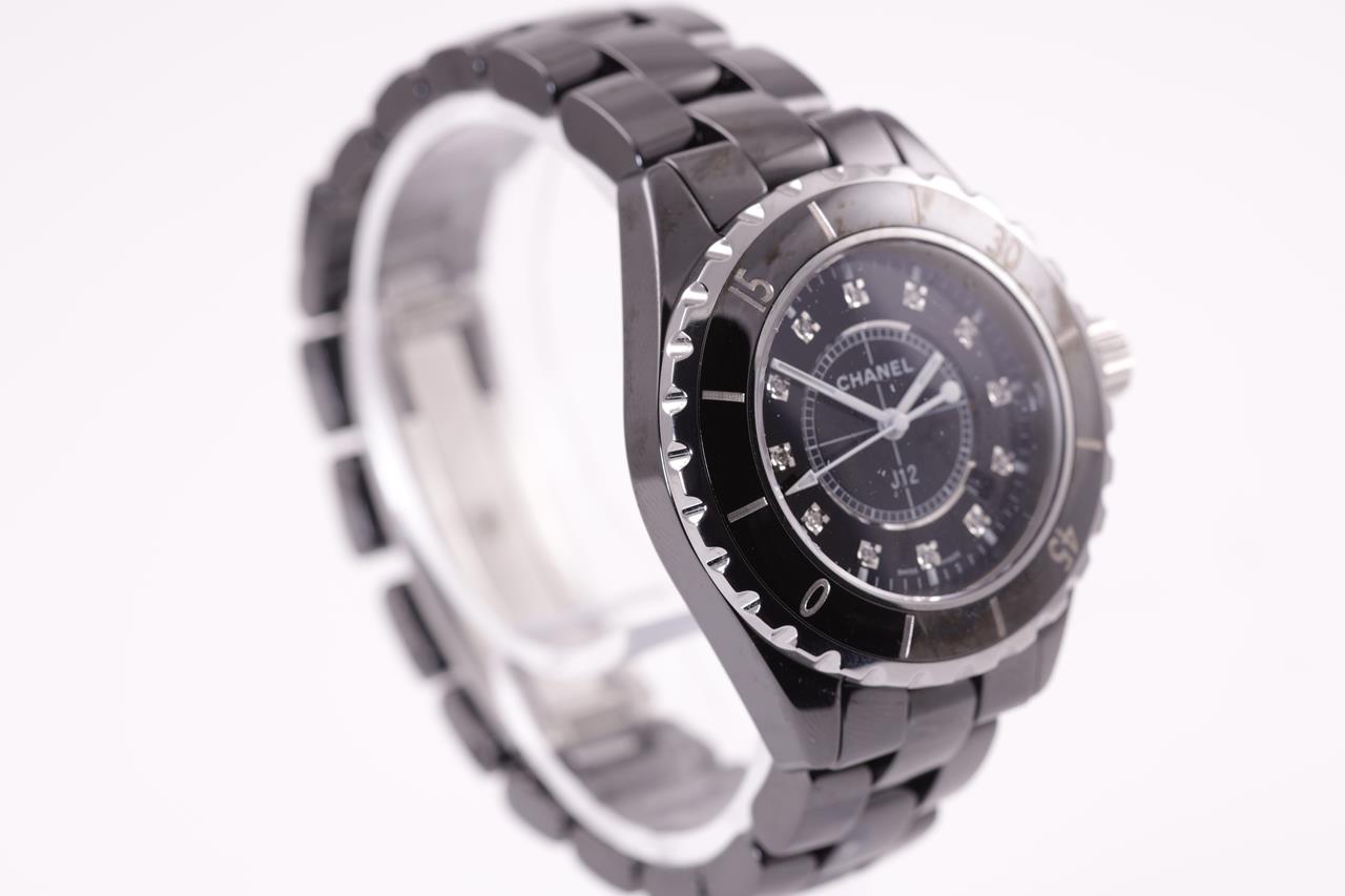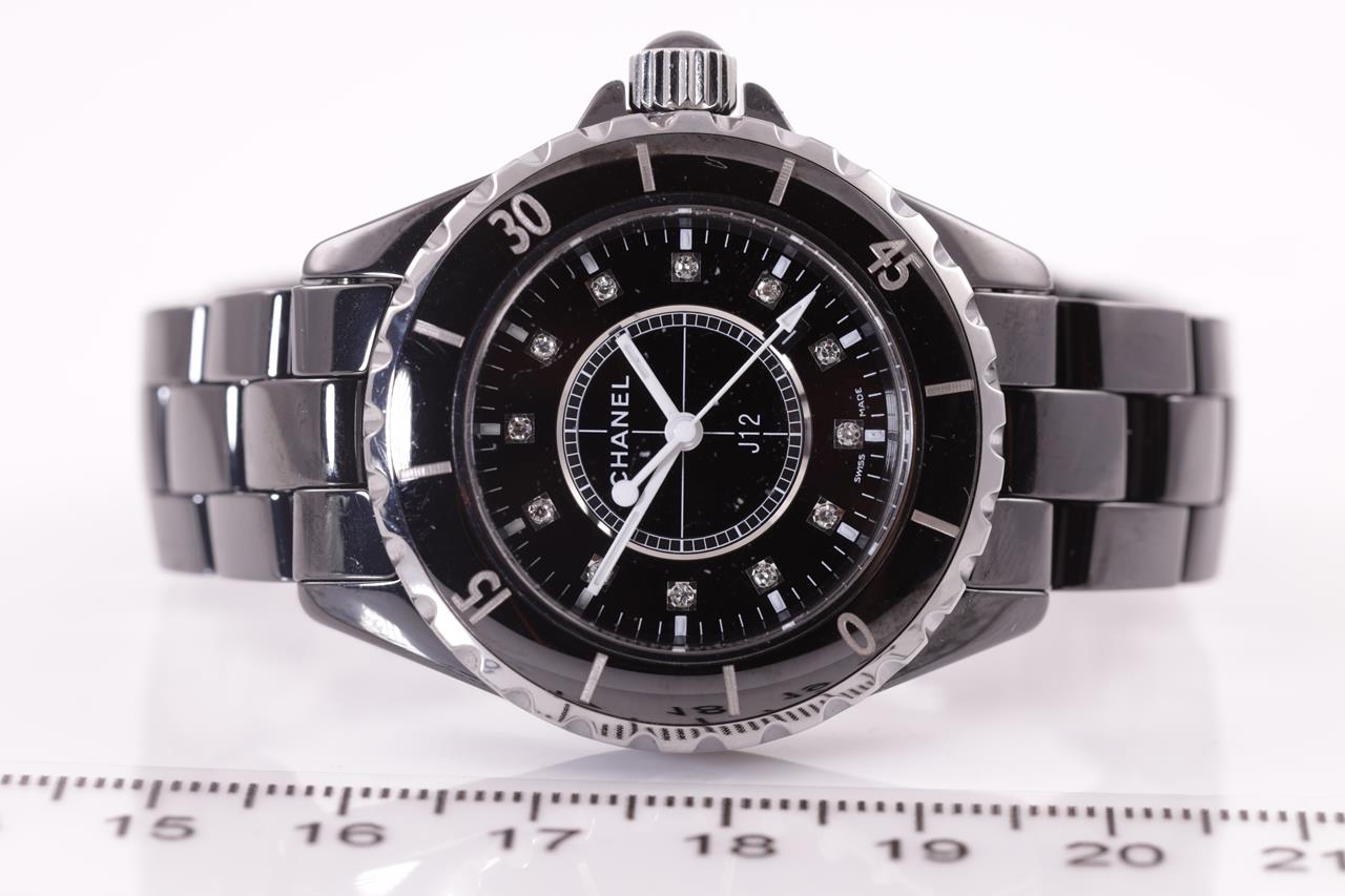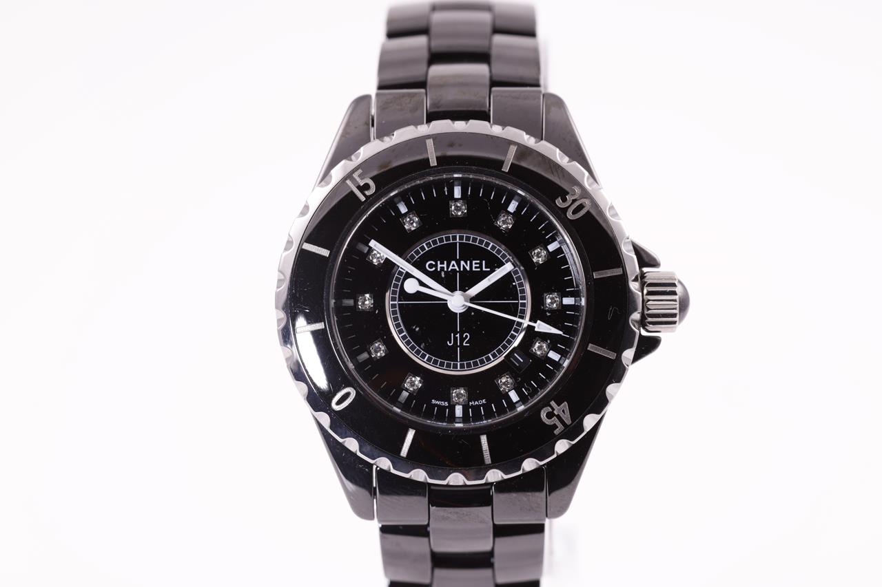 Chanel J12 black ceramic quartz ladies watch. Black dial, Diamond indicators, case diameter: 33mm, wrist size: 16cm, Swiss made. Ref# H1625. With Chanel black ceramic bracelet and clasp. With certificate of authenticity, Chanel certificate card dated 21/08/2005 and Chanel box. 3 month FSA warranty. (Pre-owned)