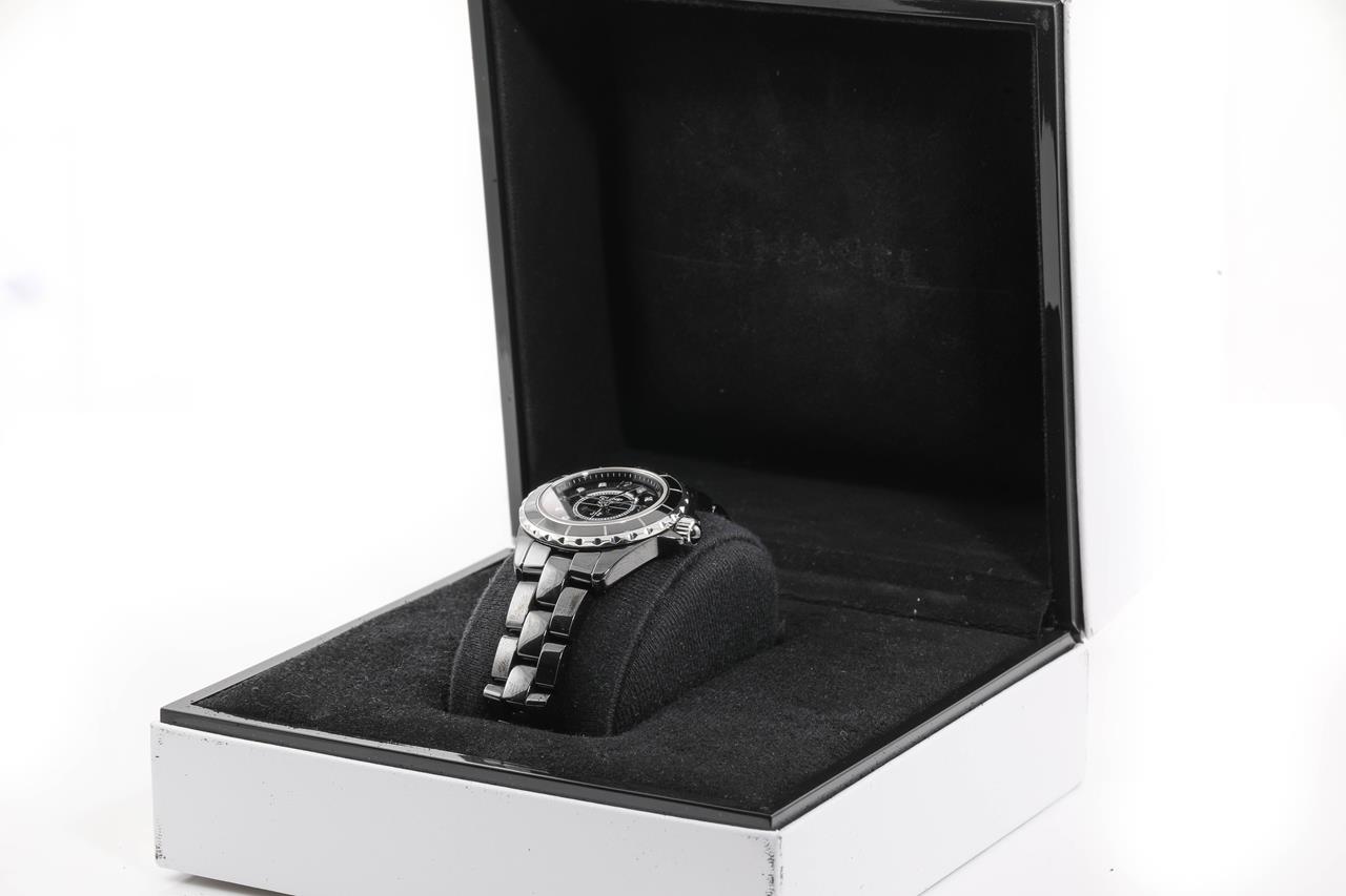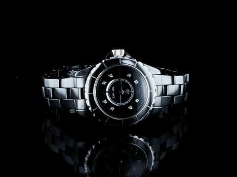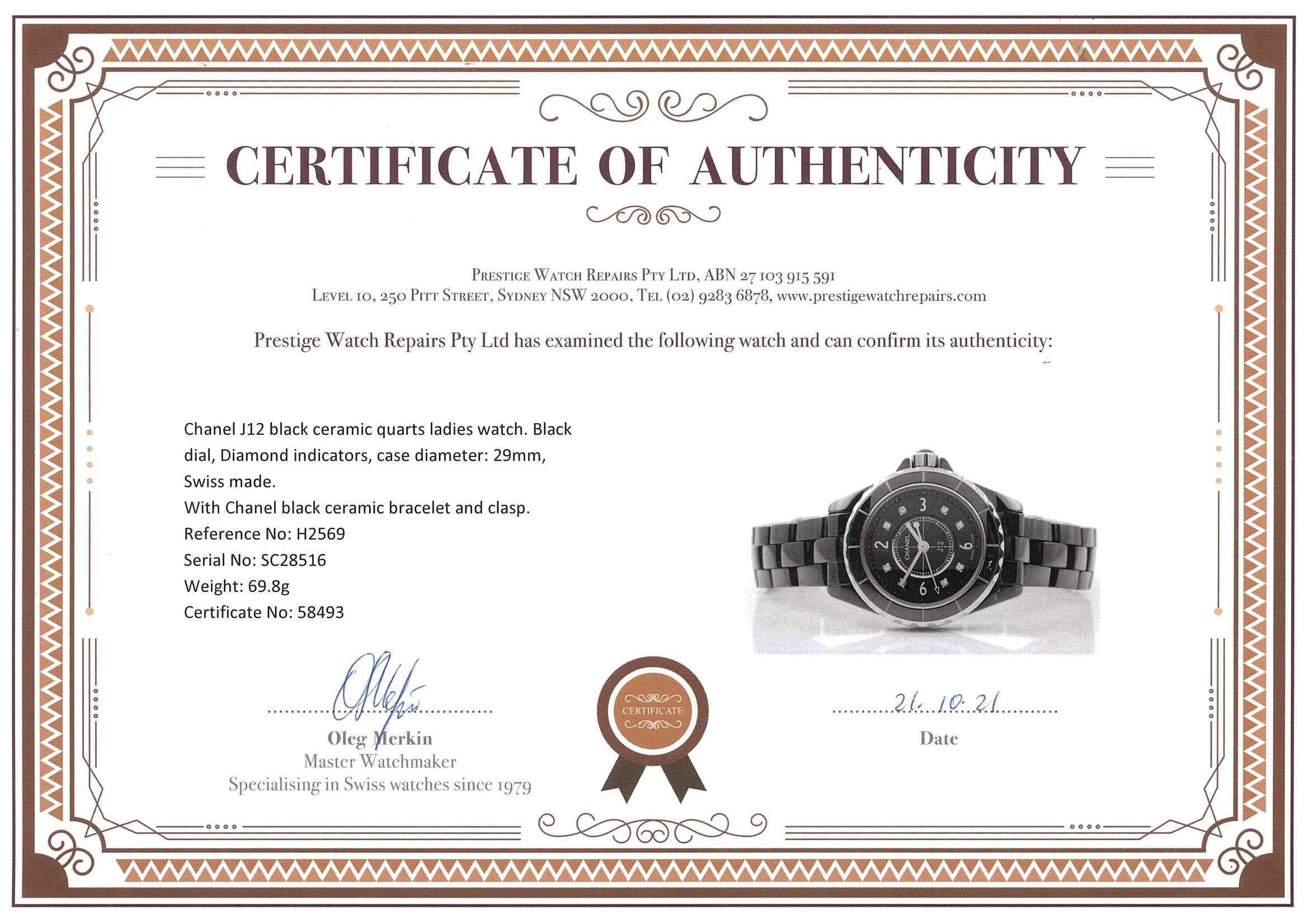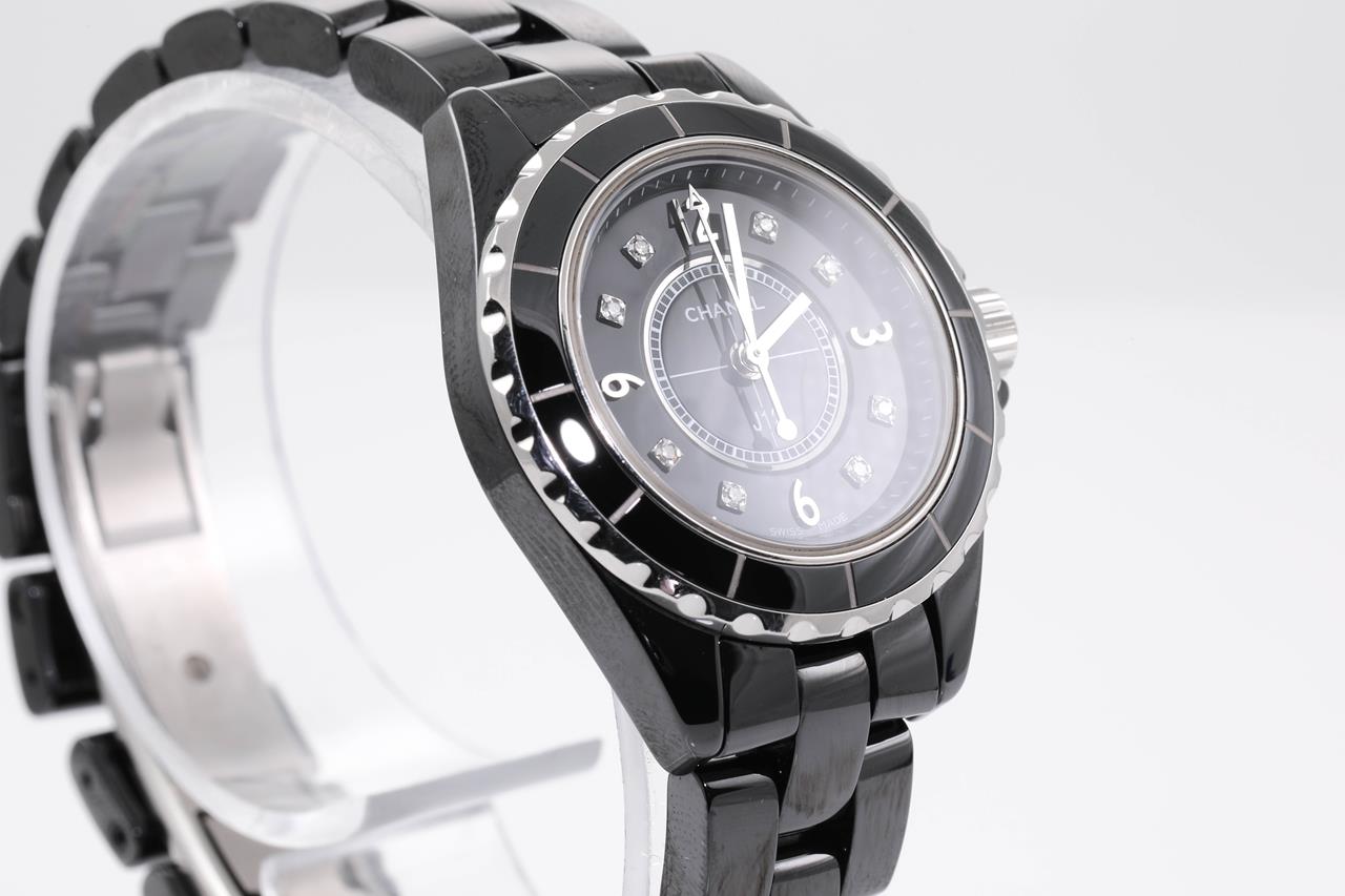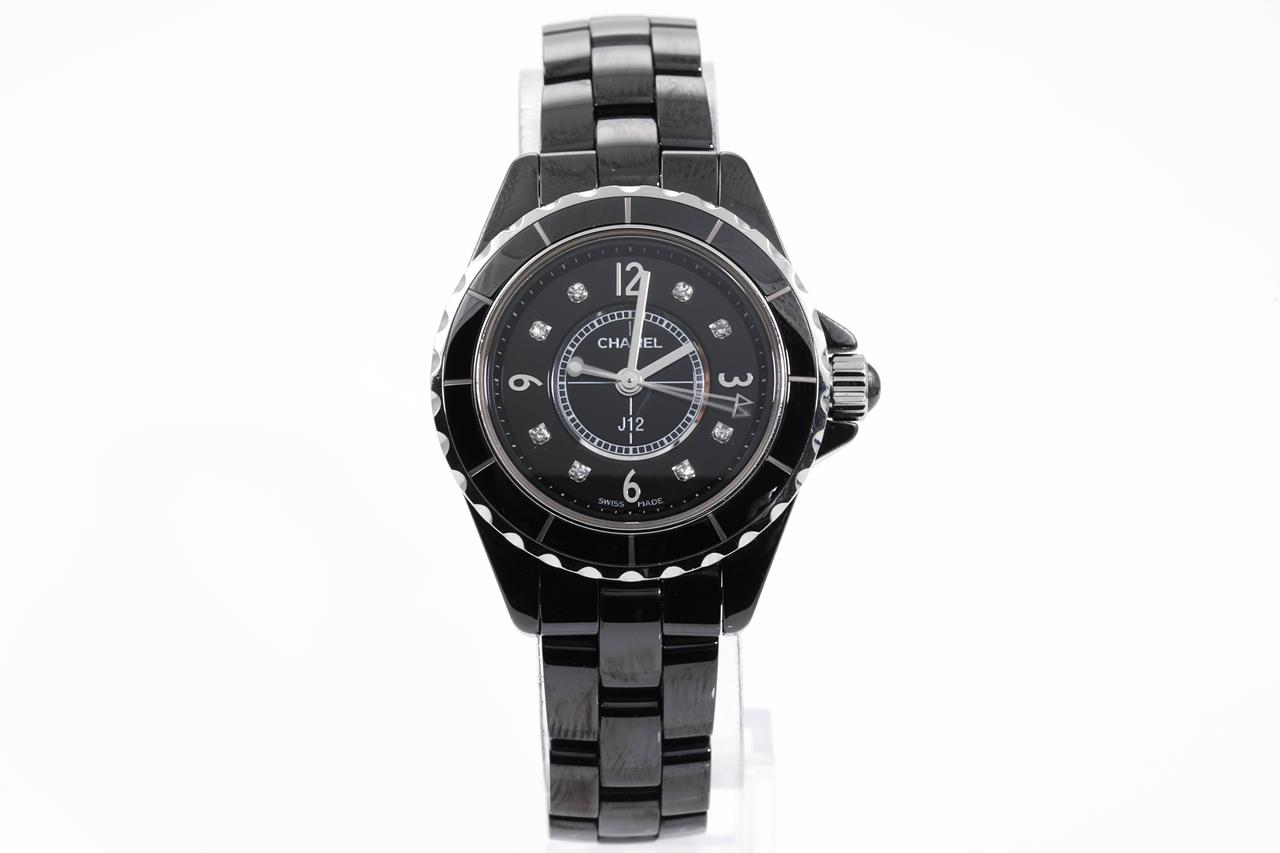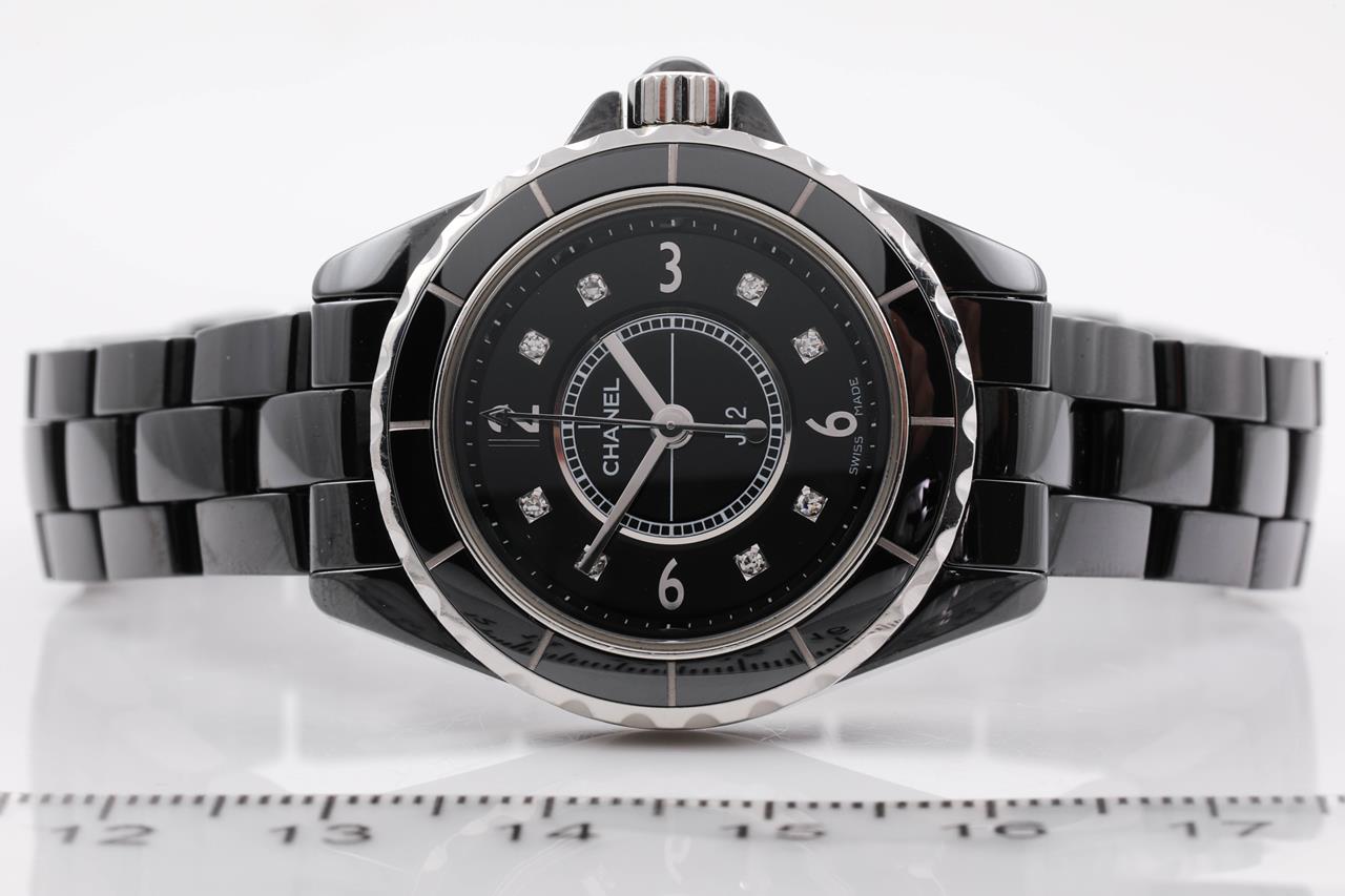 Chanel J12 black ceramic quartz ladies watch. Black dial, Diamond indicators, case diameter: 29mm, wrist size: 16cm, Swiss made. Ref# H2569. With Chanel black ceramic bracelet and clasp. With certificate of authenticity, Chanel certificate of authenticity card dated 09/11/2010 and Chanel box. 3 month FSA warranty. (Pre-owned)