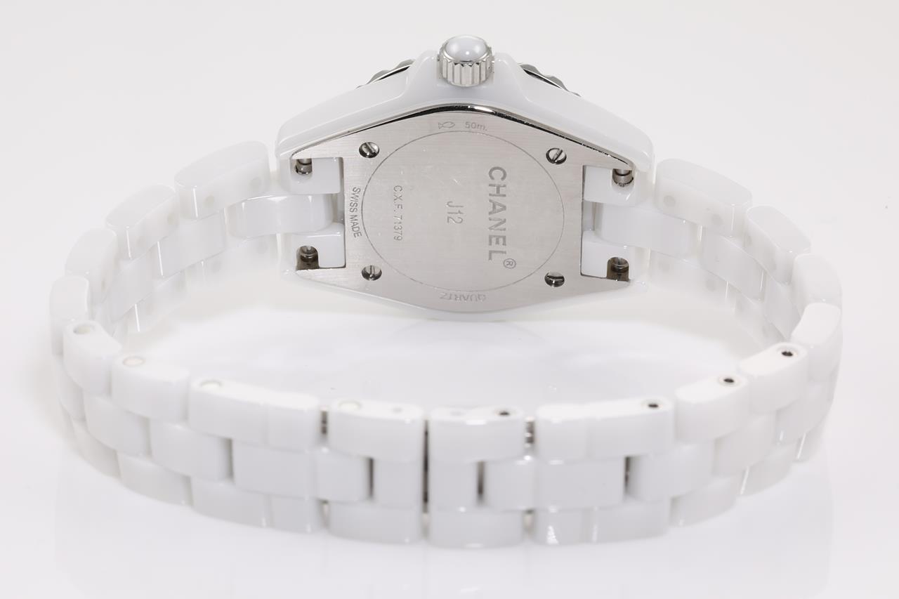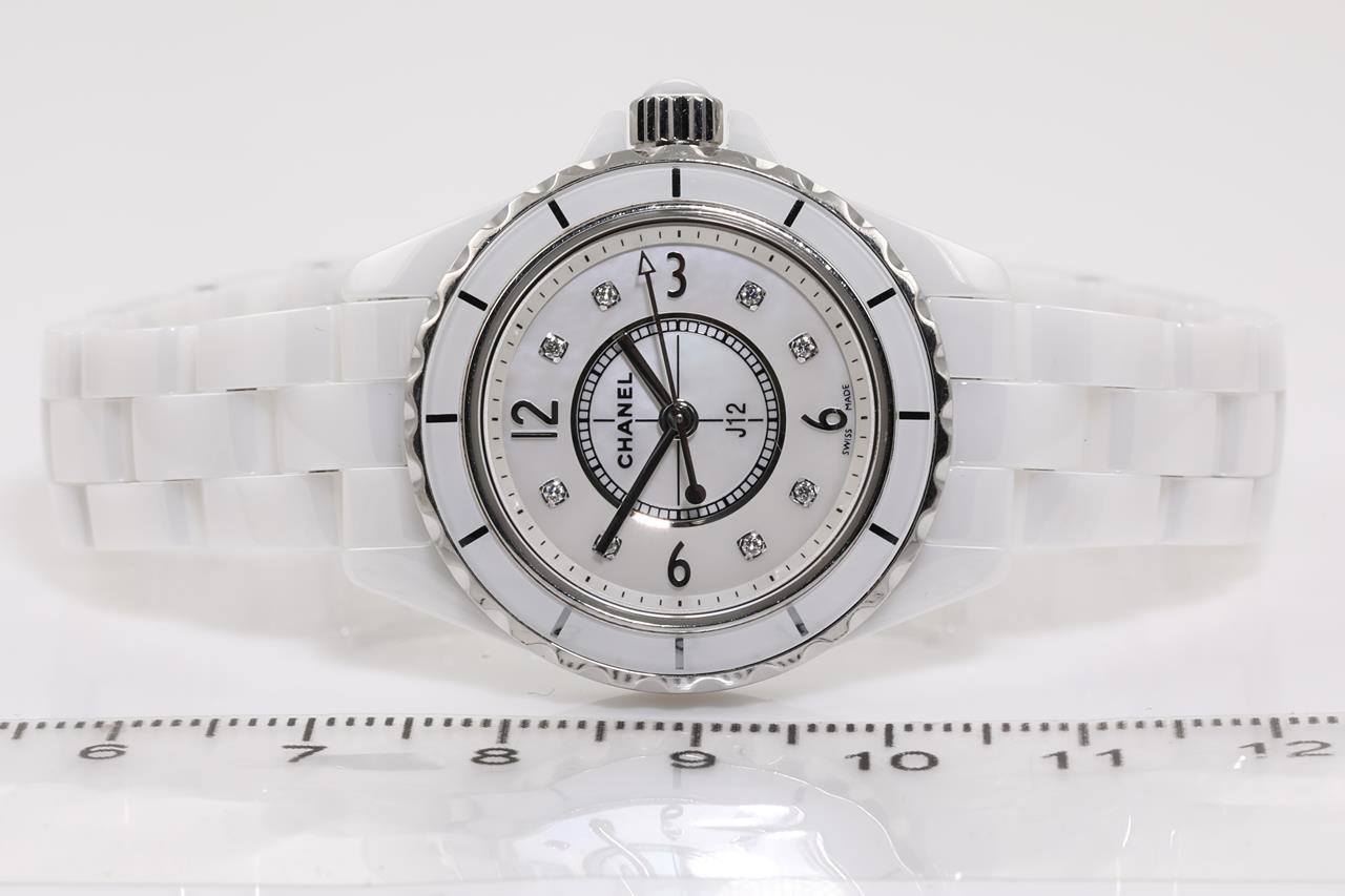 Chanel J12 ceramic quartz ladies watch. Mother of Pearl dial, Diamond indicators, case diameter: 29mm, wrist size: 16cm, Swiss made. Ref# H2570. With Chanel ceramic bracelet and clasp. With Certificate of Authenticity and Chanel box. 3 month FSA warranty. (Pre-owned)