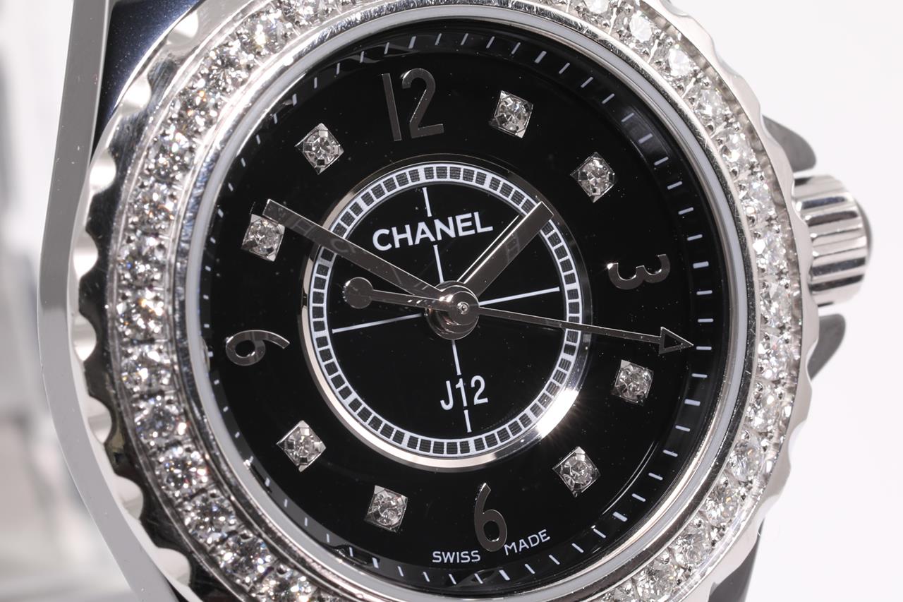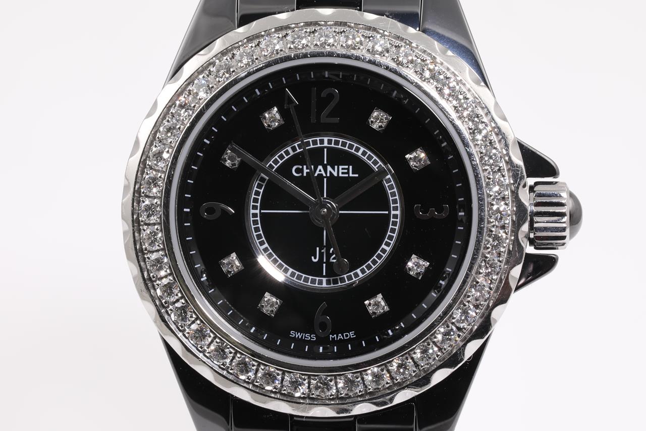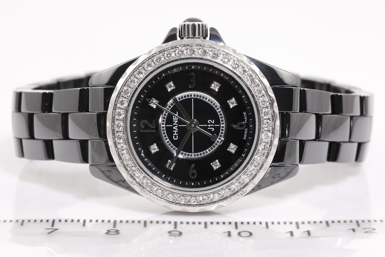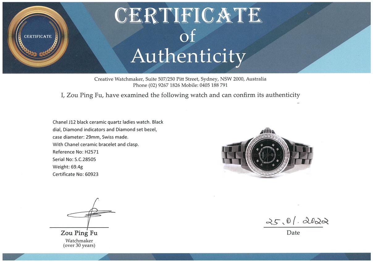 Chanel J12 black ceramic quartz ladies watch. Black dial, Diamond indicators and Diamond set bezel, case diameter: 29mm, wrist size: 16cm, Swiss made. Ref# H2571. With Chanel ceramic bracelet and clasp. With Certificate of Authenticity, Chanel Certificate of Authenticity Card and Chanel box. 3 month FSA warranty. (Pre-owned)