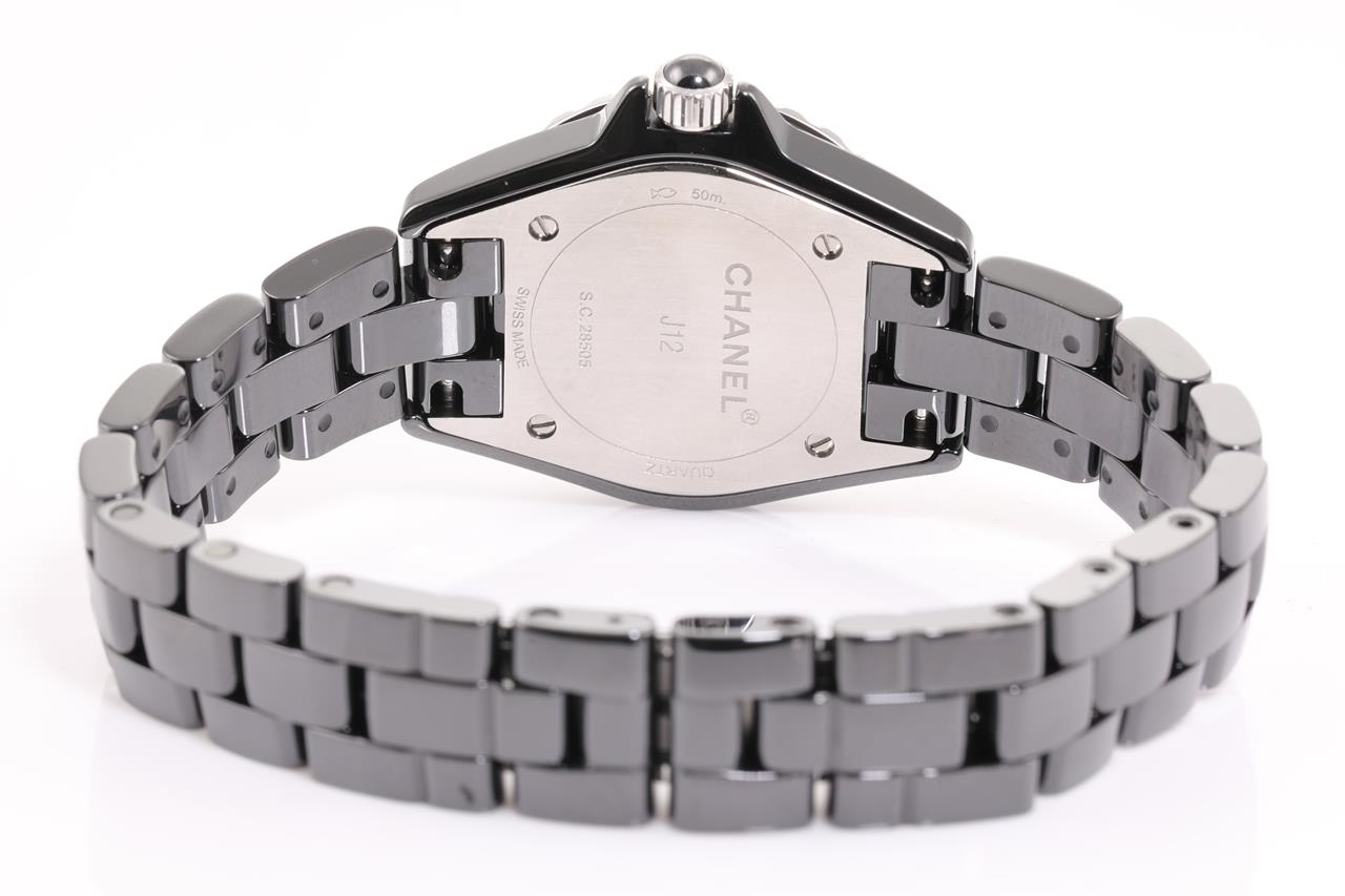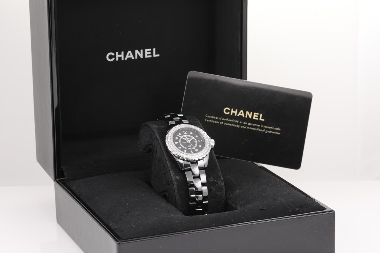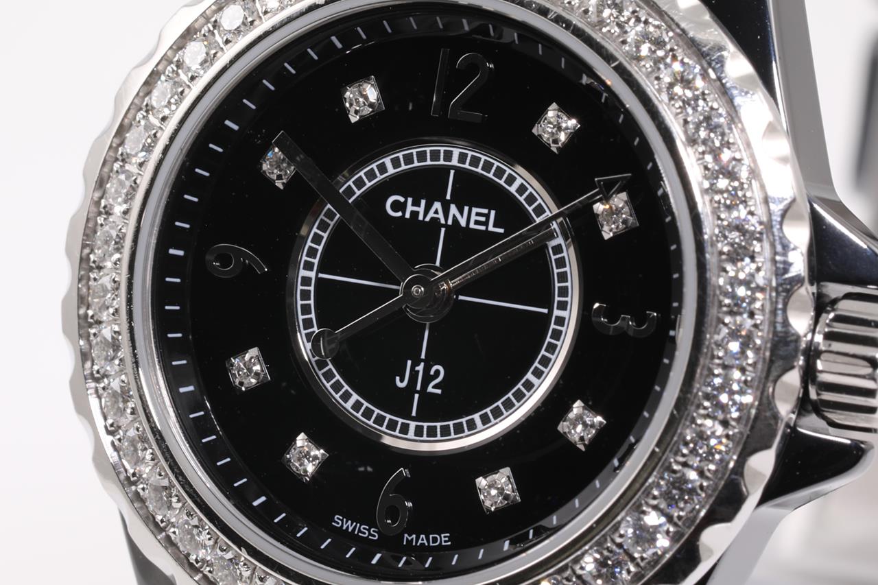 Chanel J12 black ceramic quartz ladies watch. Black dial, Diamond indicators and Diamond set bezel, case diameter: 29mm, wrist size: 16cm, Swiss made. Ref# H2571. With Chanel ceramic bracelet and clasp. With Certificate of Authenticity, Chanel Certificate of Authenticity Card and Chanel box. 3 month FSA warranty. (Pre-owned)
