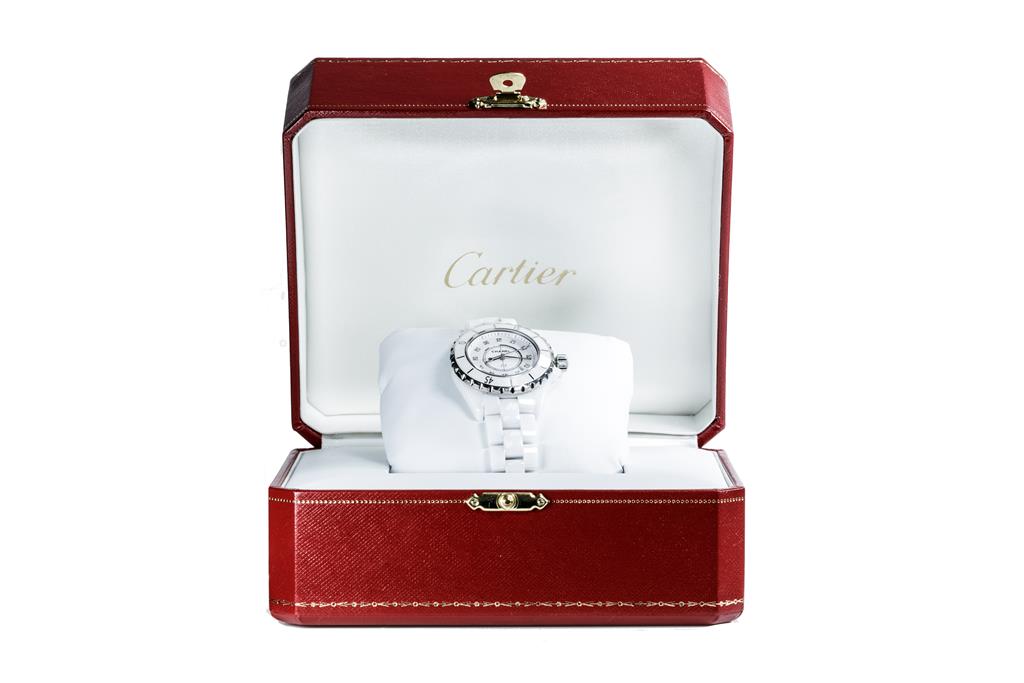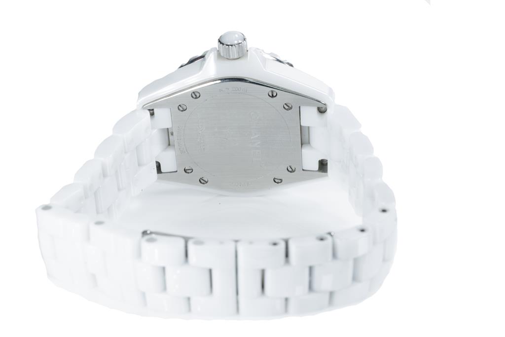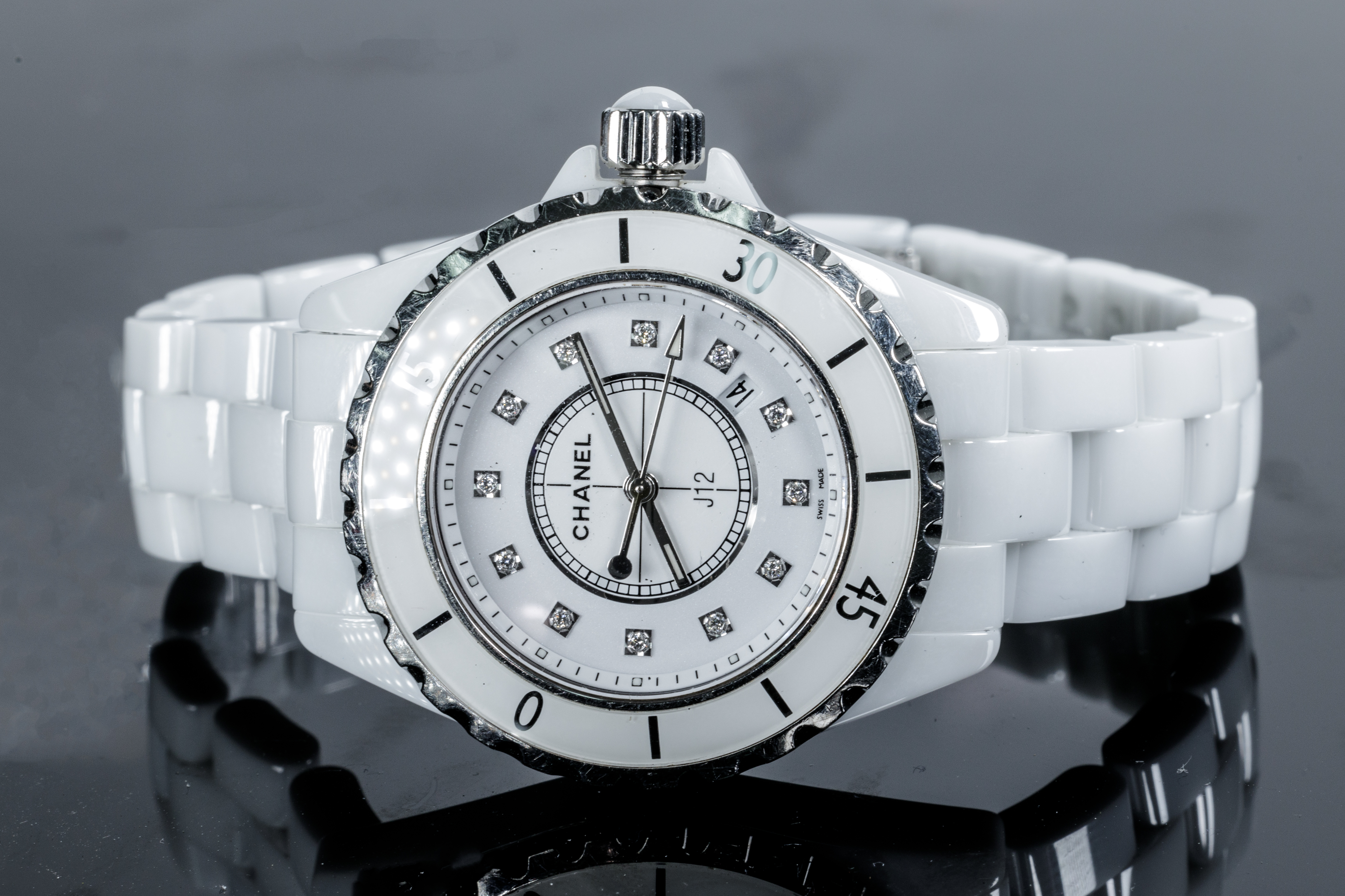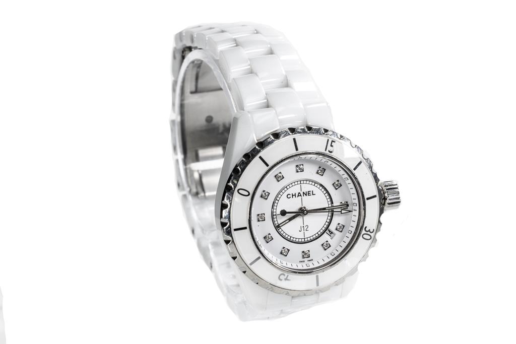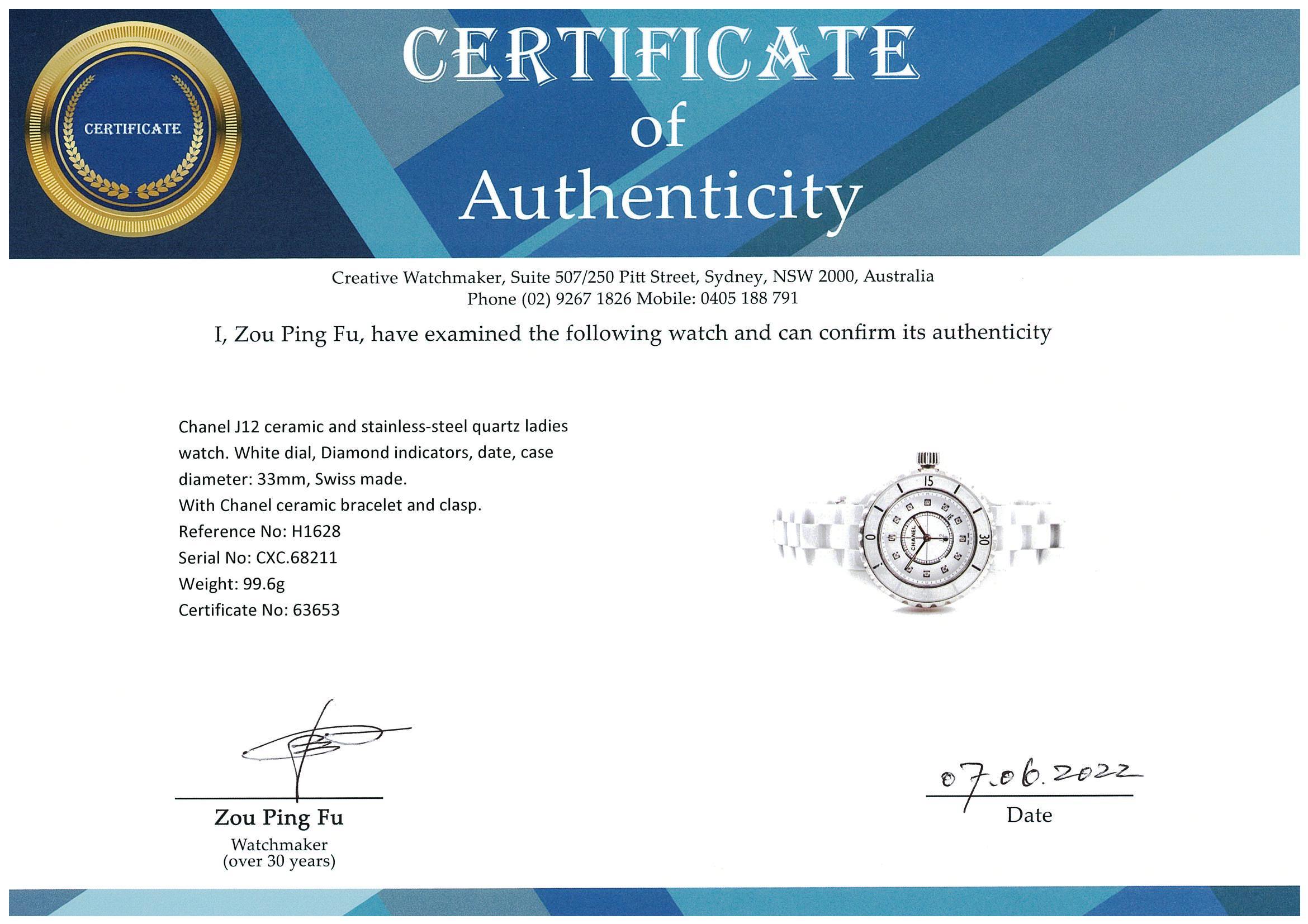 Chanel J12 ceramic and stainless steel quartz ladies watch. White dial, Diamond indicators, date, case diameter: 33mm, wrist size: 17cm, Swiss made. Ref# H1628. With Chanel ceramic bracelet and clasp. With Certificate of Authenticity and Chanel box. 3 month FSA warranty. (Pre-owned)