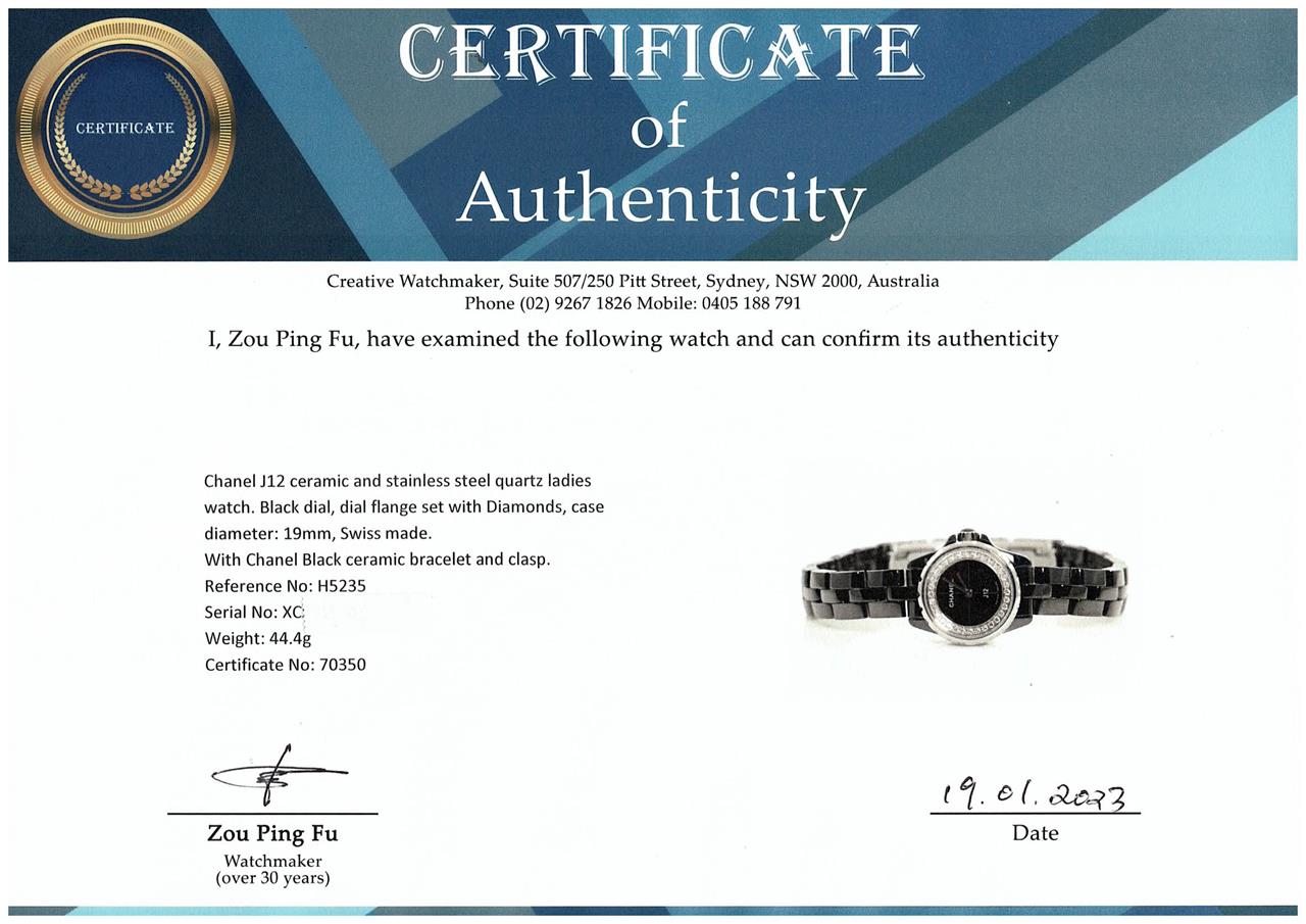 Chanel J12 ceramic and stainless steel quartz ladies watch. Black dial, dial flange set with Diamonds, case diameter: 19mm, wrist size: 16.5cm, Swiss made. Ref# H5235. With Chanel Black ceramic bracelet and clasp. With Certificate of Authenticity, With Chanel card dated 08/04/2018 and Chanel box. 3 month FSA warranty (Pre-owned)