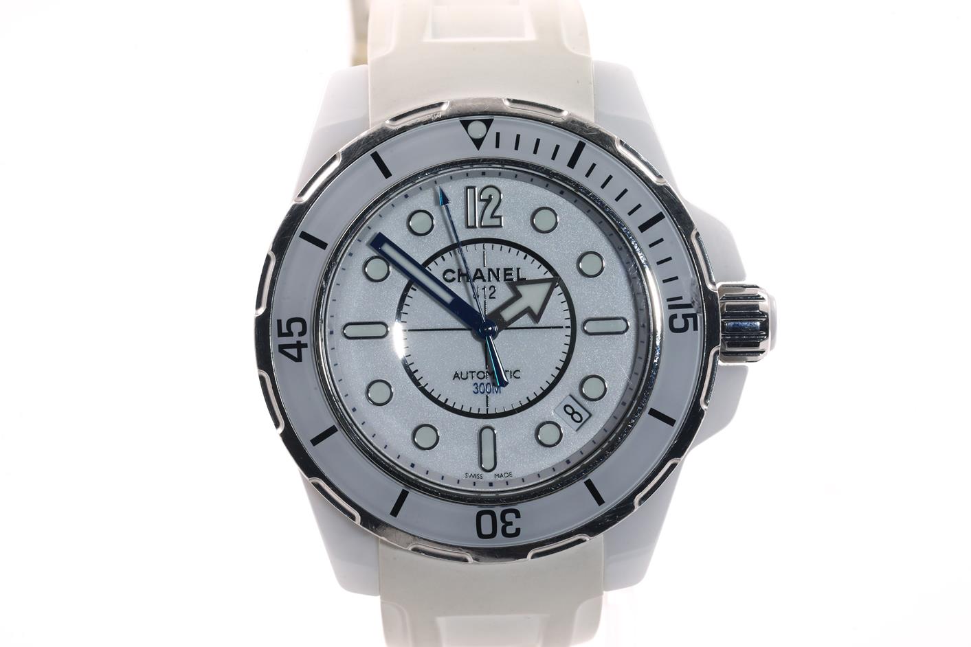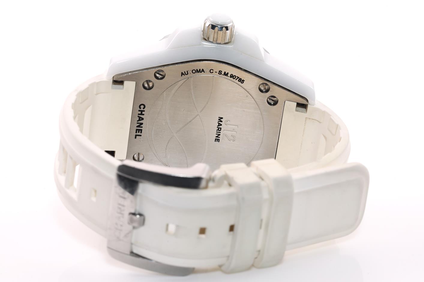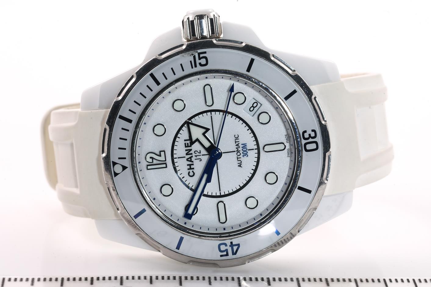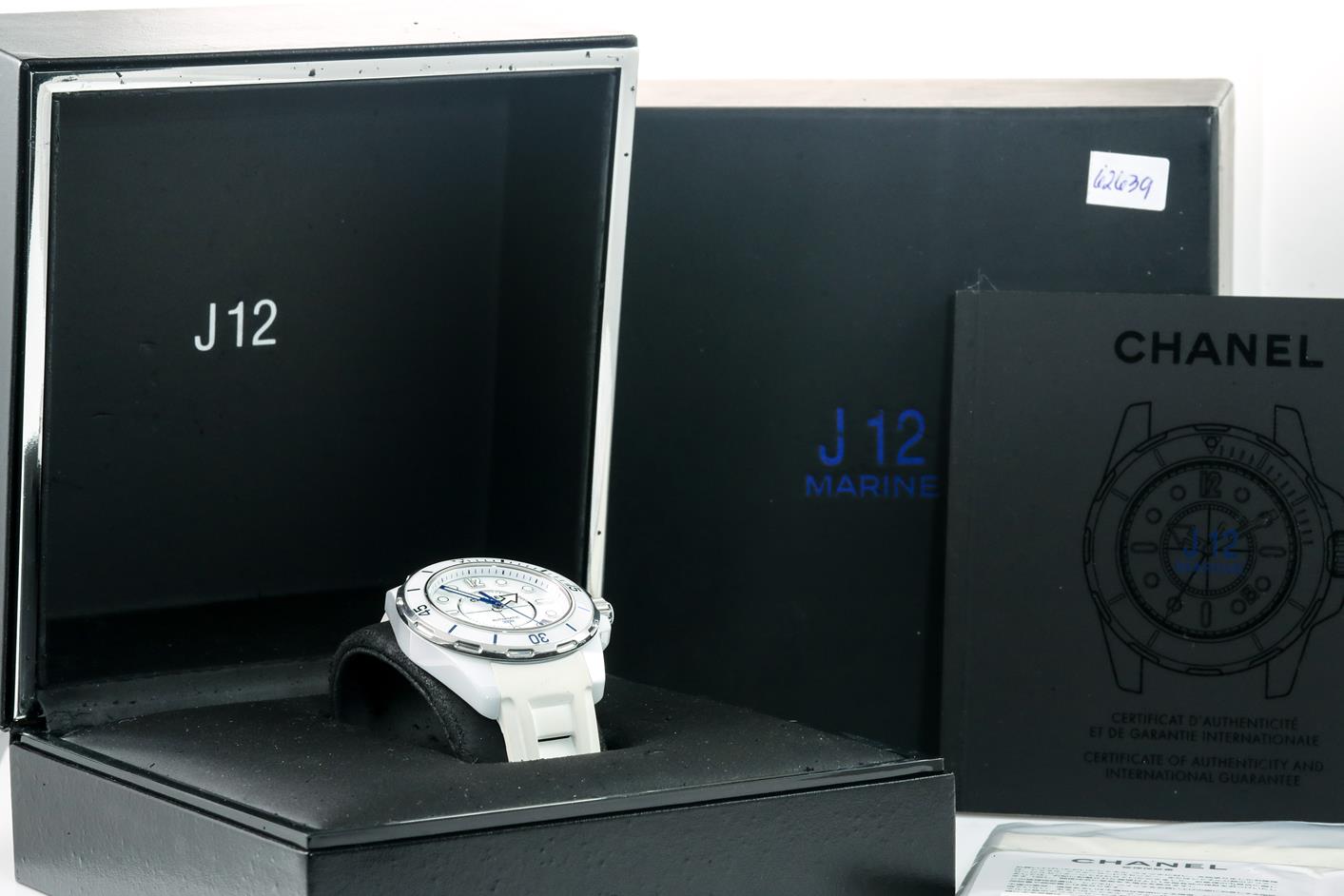 Chanel J12 Marine ceramic automatic mens watch. White dial, date, case diameter: 38mm, length: 19cm, Swiss made. Ref# H2560. With Chanel white rubber strap and buckle. With Certificate of Authenticity, Chanel International Guarantee Certificate Card dated 04/06/2010 and Chanel box. 3 month FSA warranty. (Pre-owned)