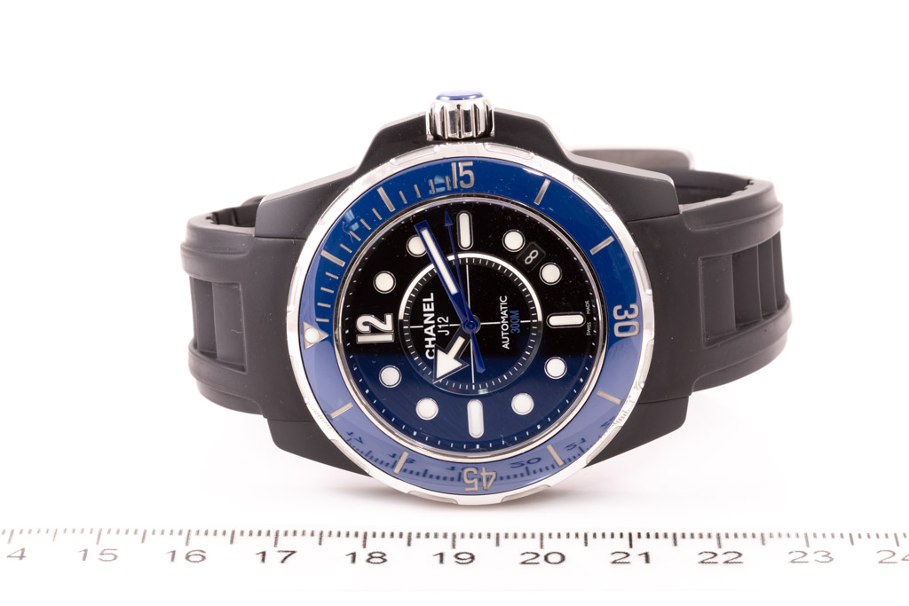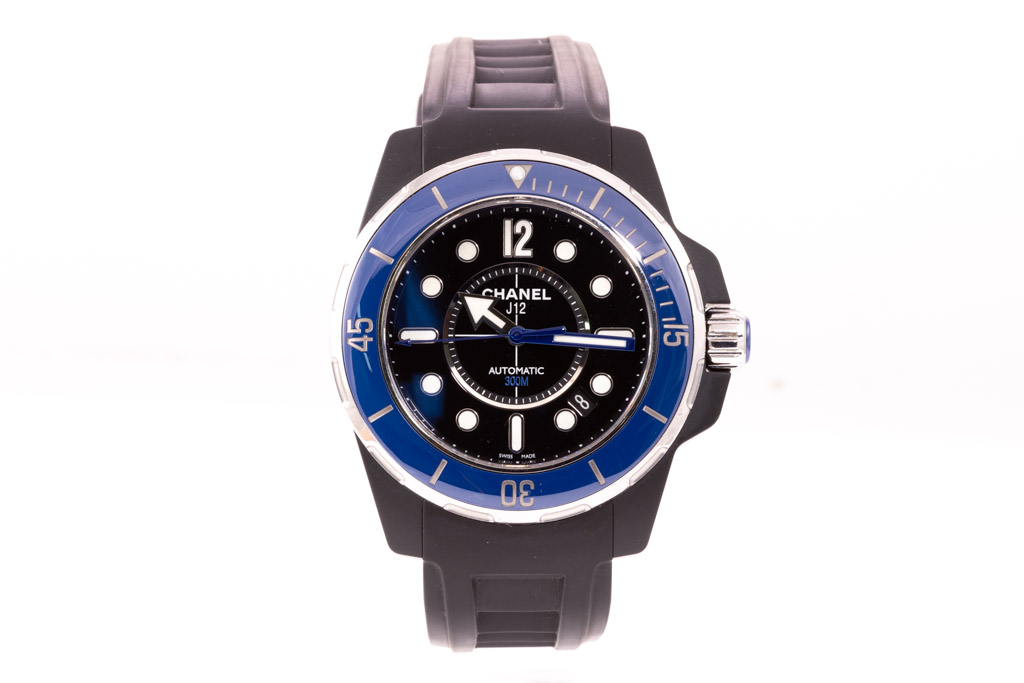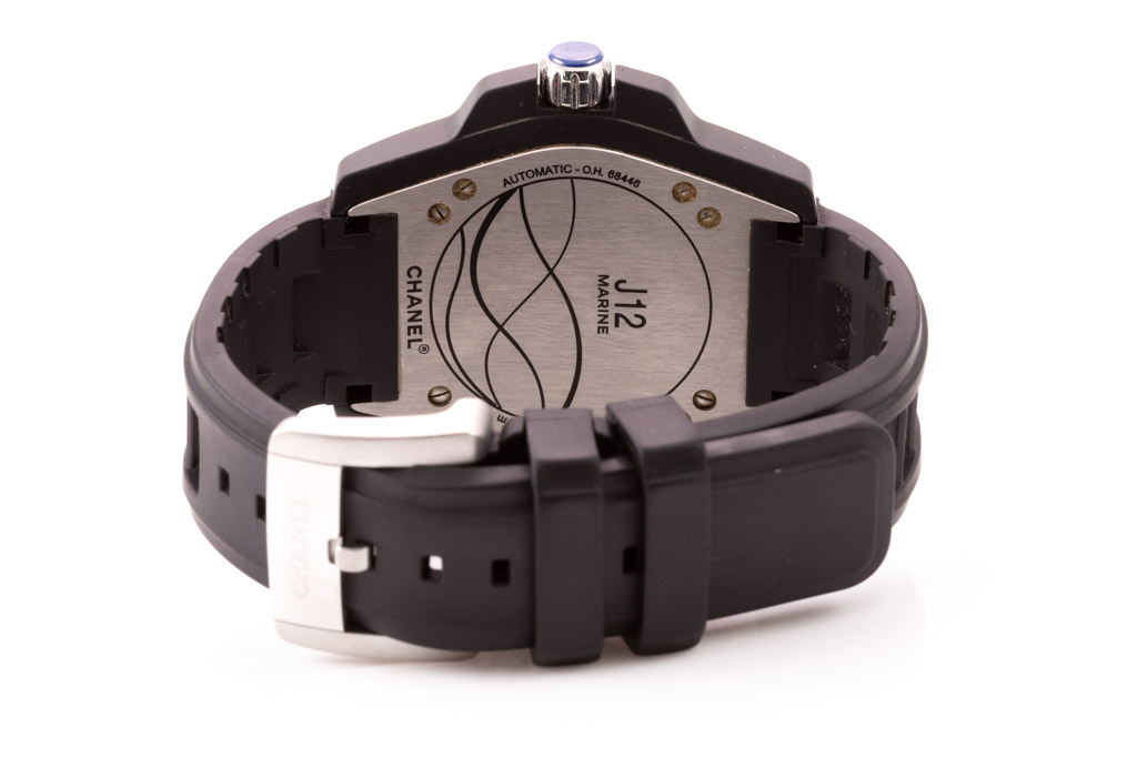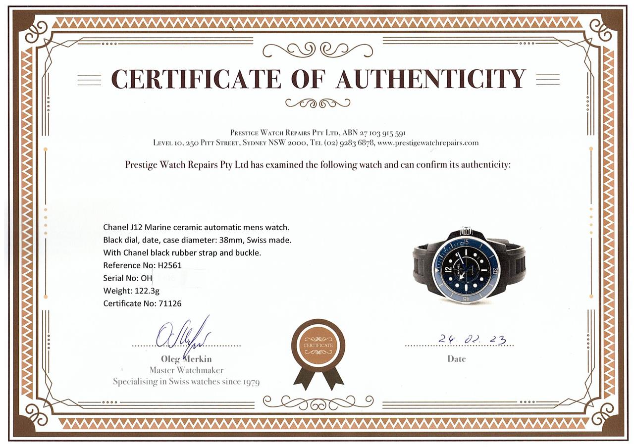 Chanel J12 Marine ceramic automatic men's watch. Black dial, date, case diameter: 38mm, strap length: 21cm, Swiss made. Ref# H2561. With Chanel black rubber strap and buckle. With Certificate of Authenticity. 3 month FSA warranty. (Pre-owned)