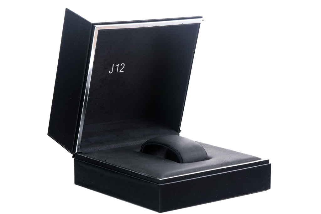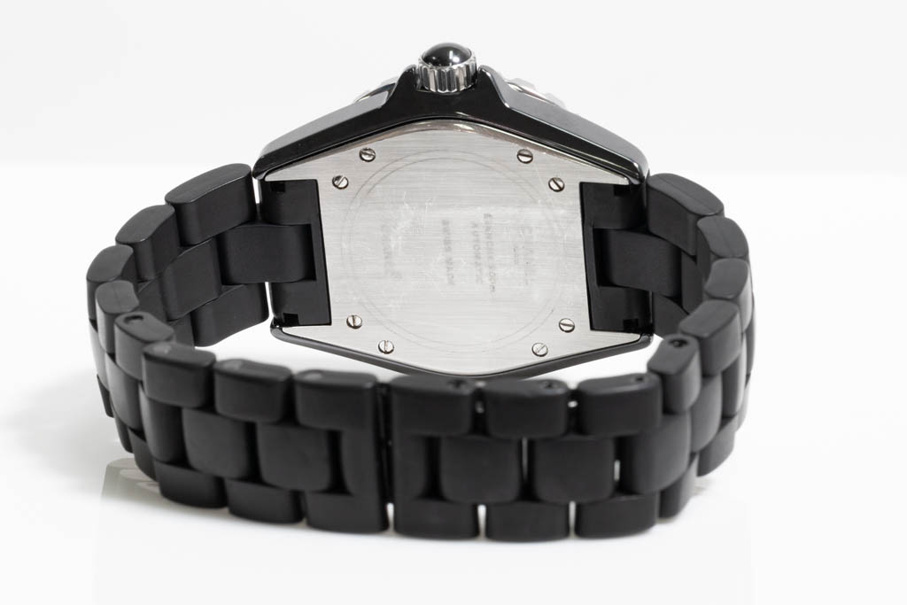 Chanel J12 stainless steel and ceramic automatic mens watch. Black dial, date, case diameter: 38mm, wrist size: 17.5cm, Swiss made. Ref# H0684. With Chanel black rubber bracelet and clasp. With Certificate of Authenticity, Channel Repair Guarantee Certificate booklet dated 20/11/2017 and Chanel box. 3 month FSA warranty. (Pre-owned)