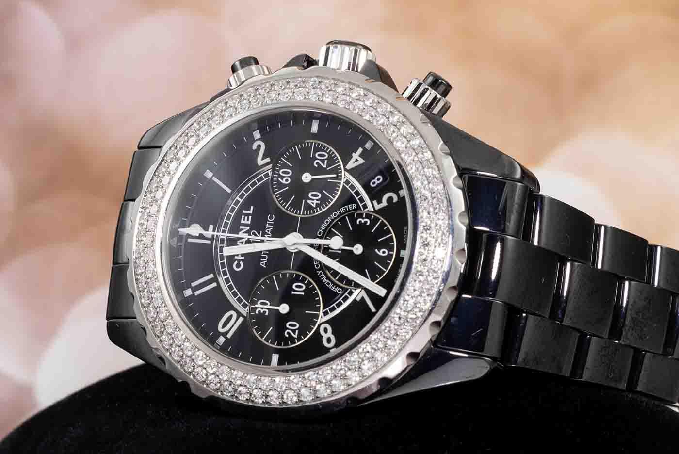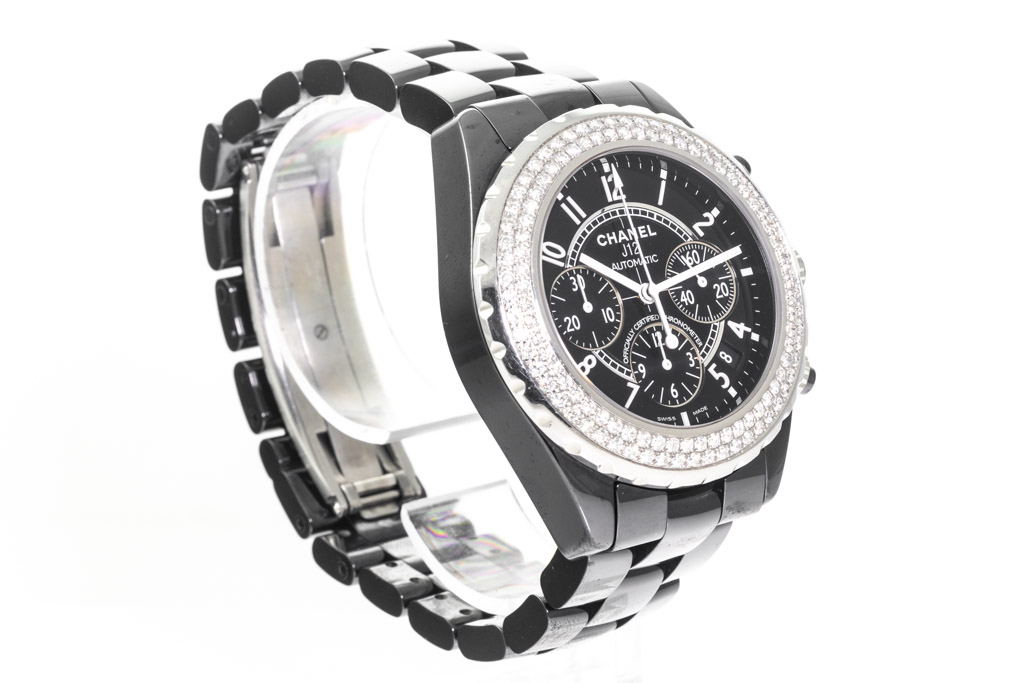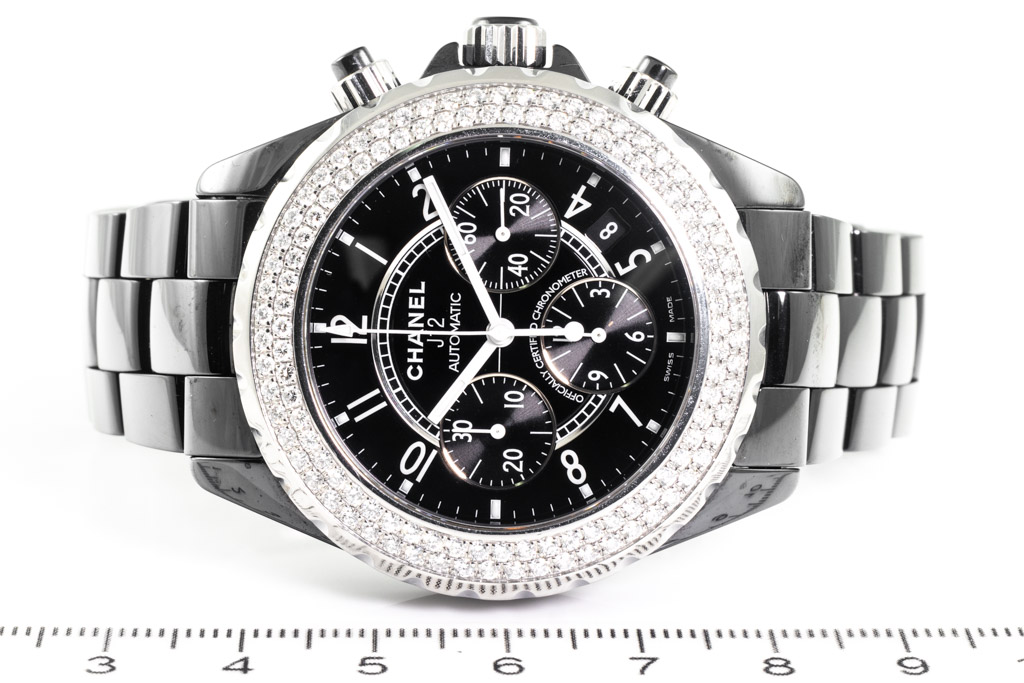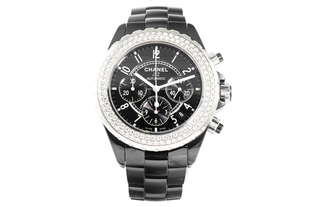 Chanel J12 ceramic automatic mens watch. Black chronograph dial, date, Diamond set bezel, case diameter: 41mm, wrist size: 19.1cm, Swiss made. Ref# H1009. With Chanel black ceramic bracelet and clasp. With Certificate of Authenticity, Chanel International Guarantee Card and Chanel box. 3 month FSA warranty. (Pre-owned)