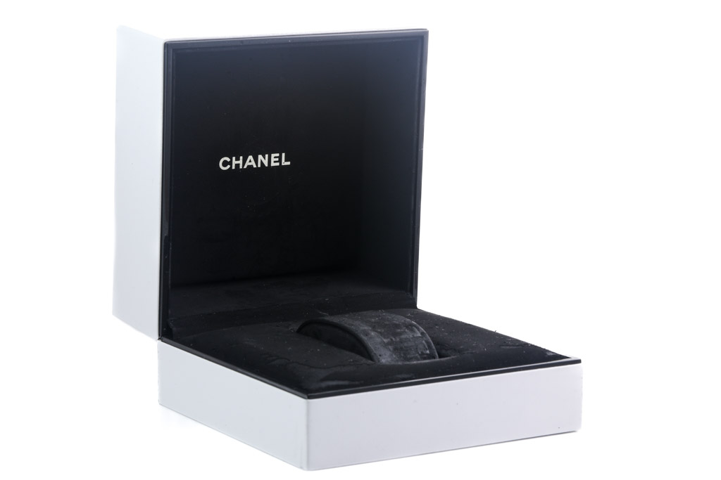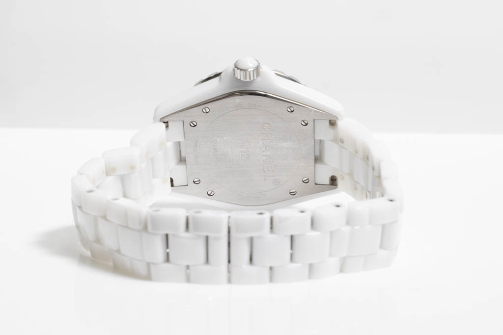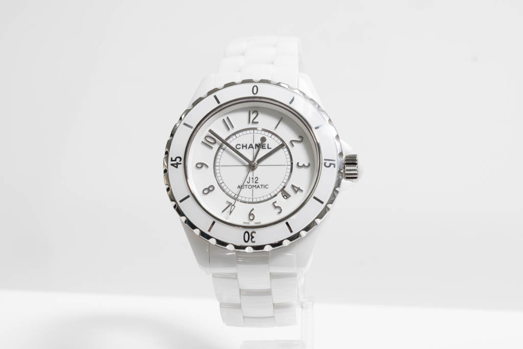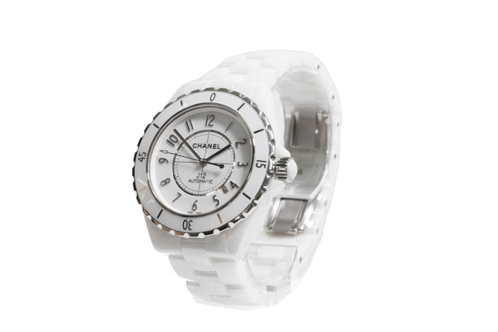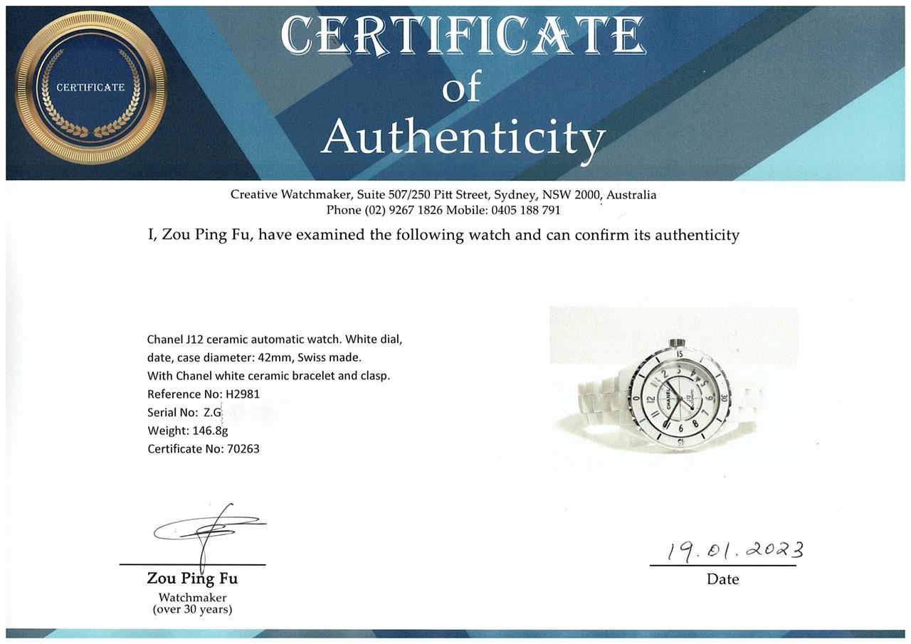 Chanel J12 ceramic automatic watch. White dial, date, case diameter: 42mm, wrist size: 19.5cm, Swiss made. Ref# H2981. With Chanel white ceramic bracelet and clasp. With Certificate of Authenticity, Chanel Certificate of Authenticity & International Guarantee card dated 04/08/2014 and Chanel box. 3 month FSA warranty (Pre-owned)