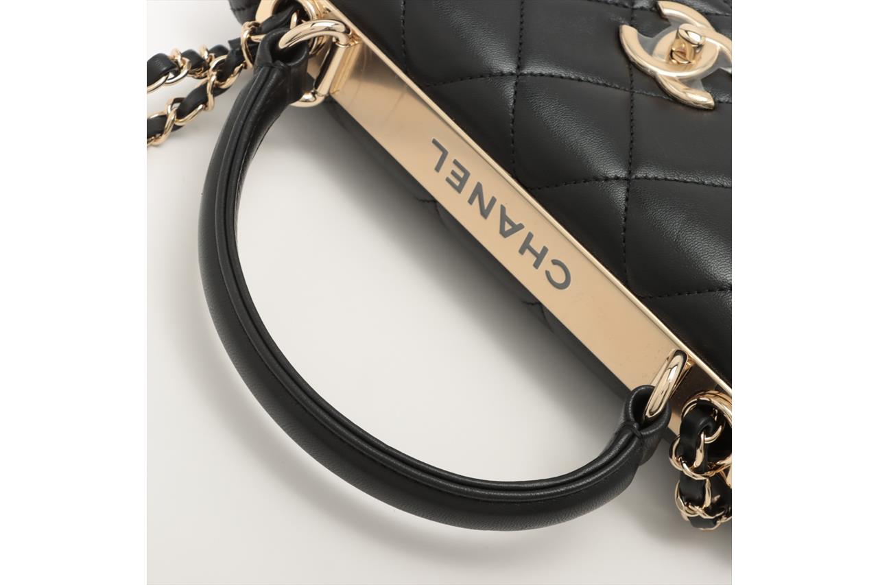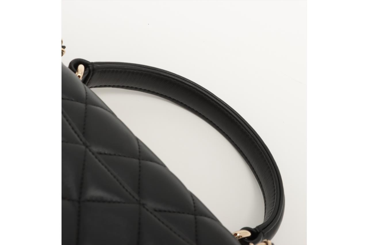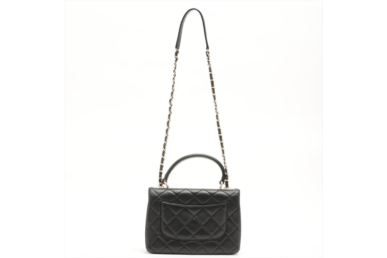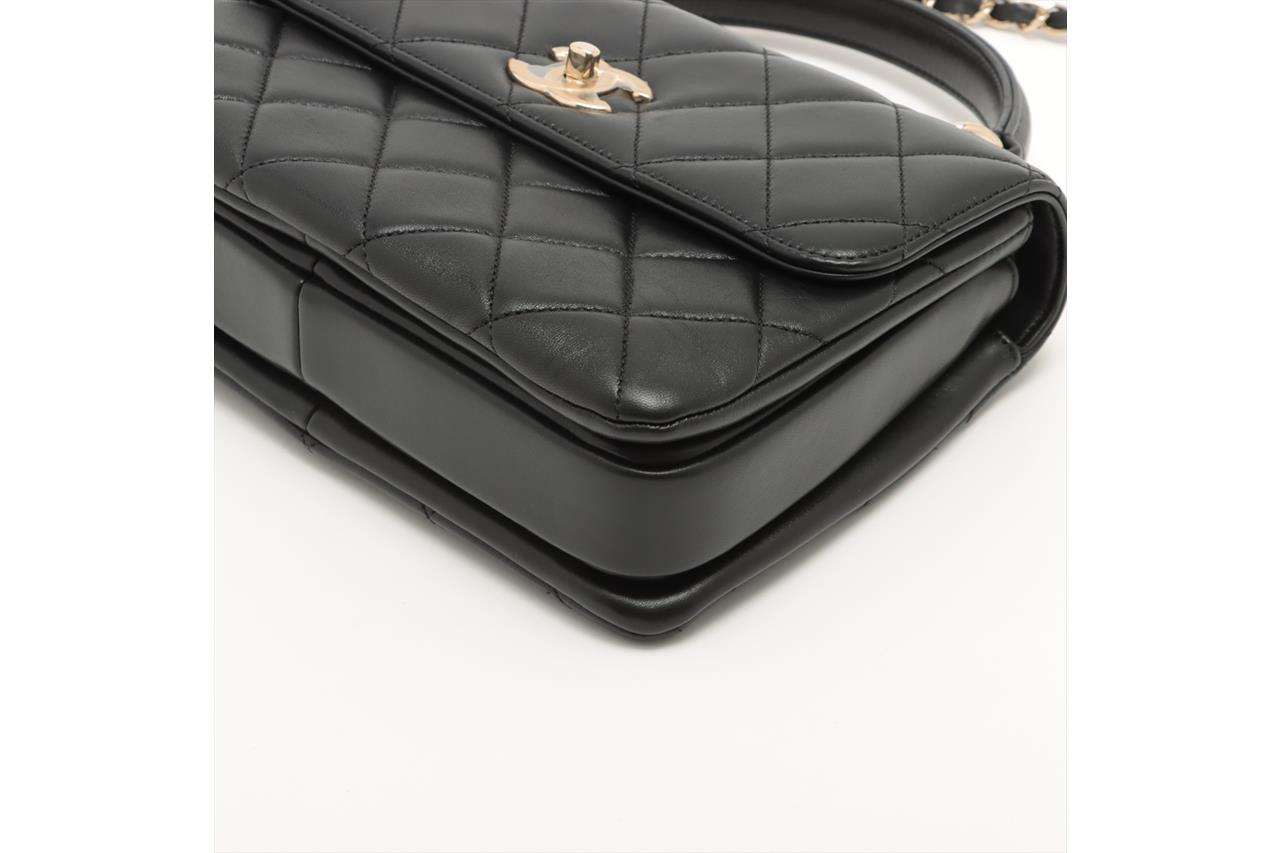 Chanel Trendy CC Top Handle Bag in black quilted lambskin. One patch pocket at back. Gold-toned hardware, black leather interior with 3 compartments, flap with turning lock closure on front. Approximate dimensions: 25cm(L) x 18.5cm(H) x 7cm(D), 11cm handle height, 48cm leather-chain strap height. Accompanied by Chanel certificate card and dust bag. With Entrupy Certificate of Authenticity. (Pre-owned)