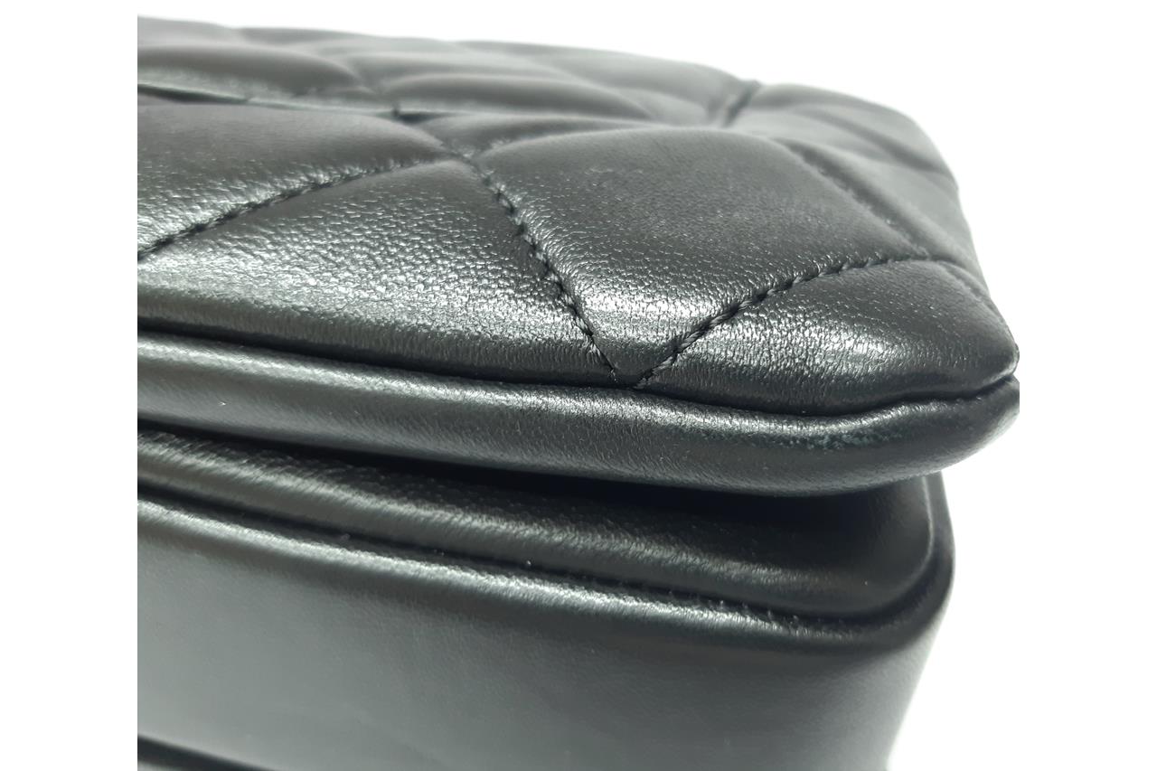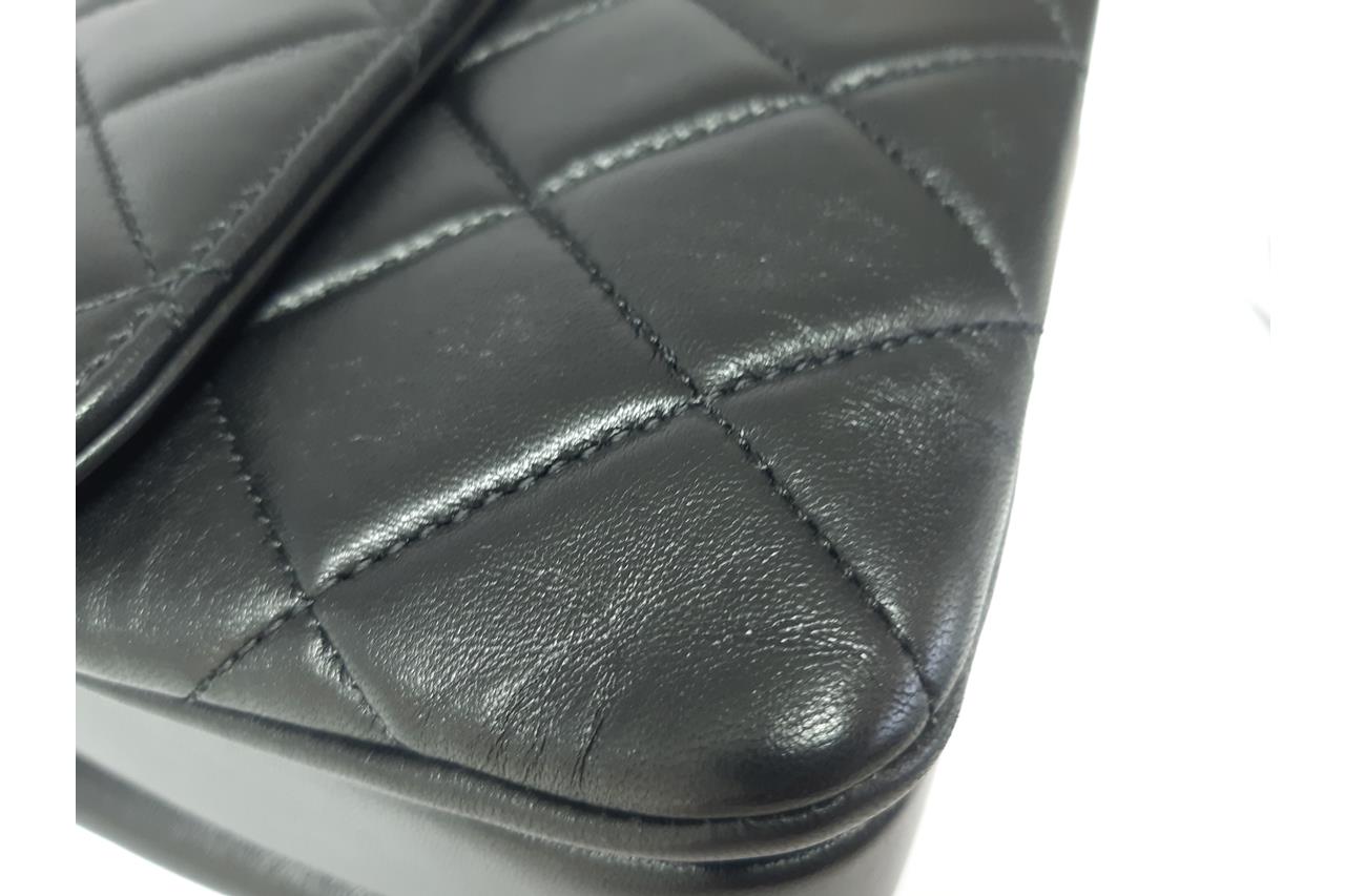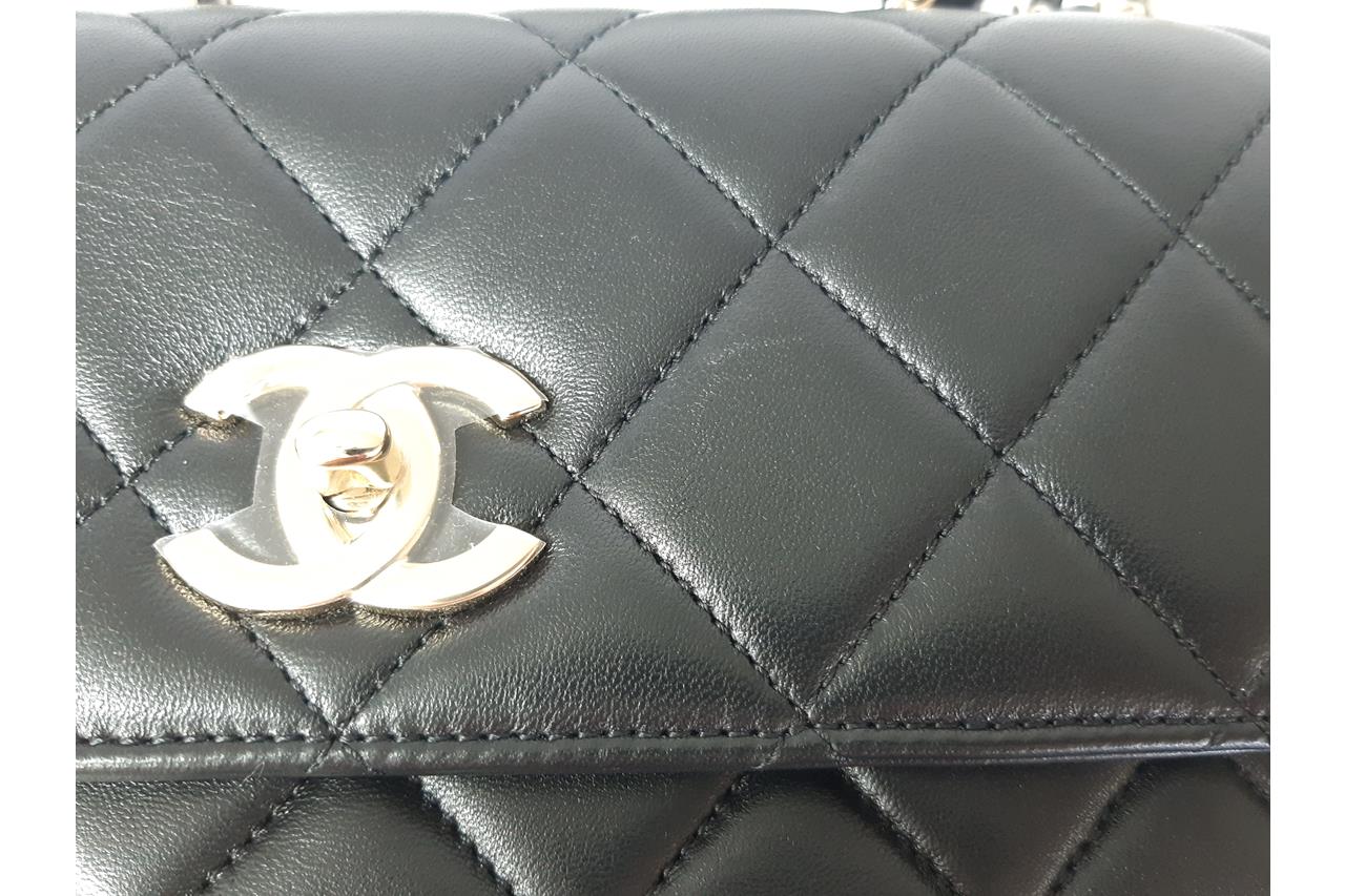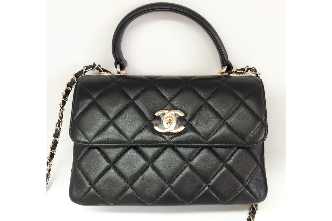 Chanel Trendy CC Top Handle Bag in black quilted lambskin. One patch pocket at back. Gold-toned hardware, black leather interior with 3 compartments, flap with turning lock closure on front. Approximate dimensions: 25cm(L) x 18.5cm(H) x 7cm(D), 11cm handle height, 48cm leather-chain strap height. Accompanied by Chanel certificate card and dust bag. With Entrupy Certificate of Authenticity. (Pre-owned)