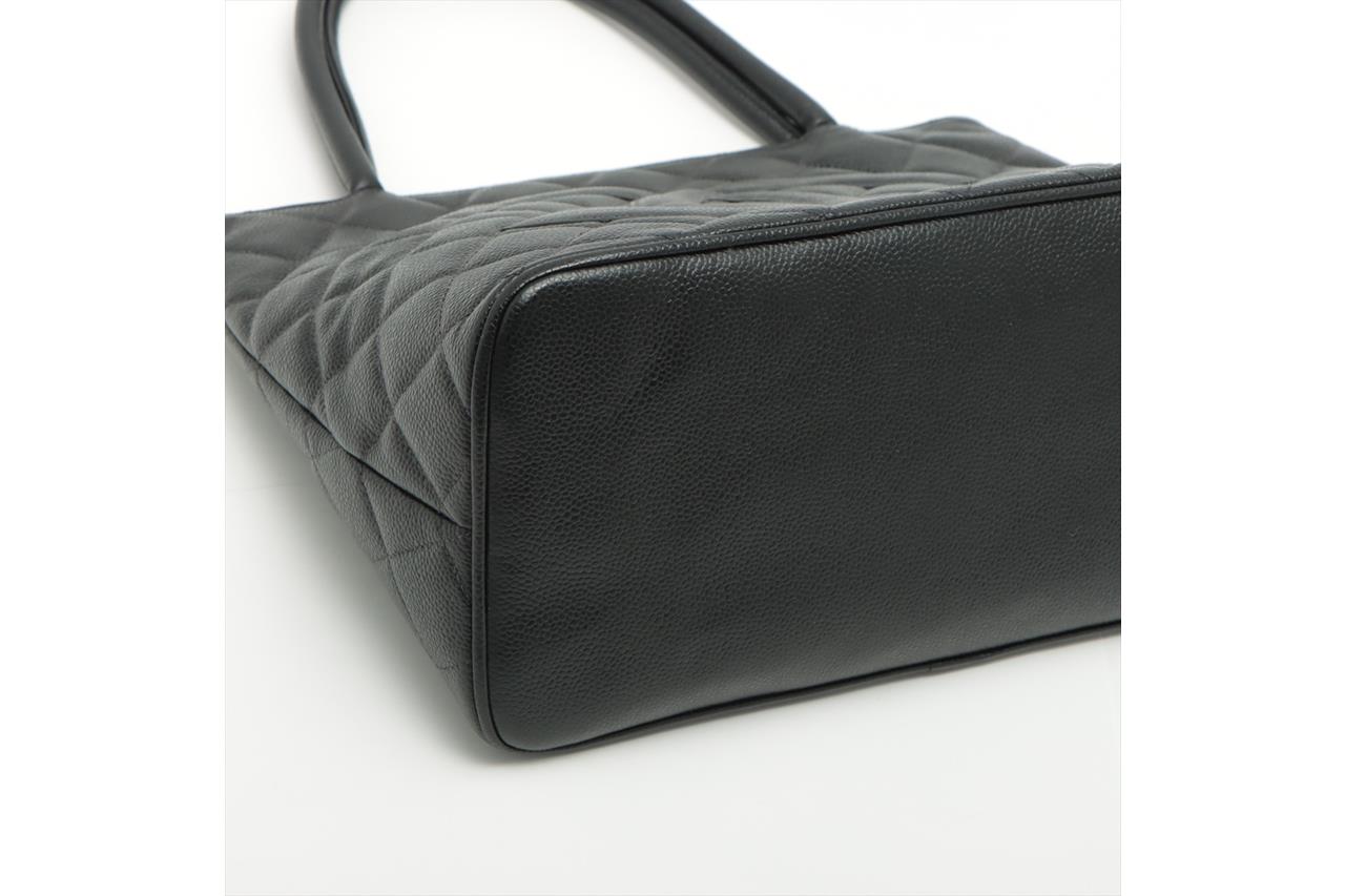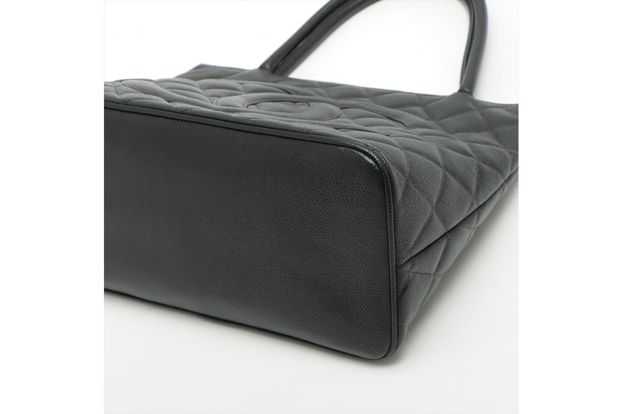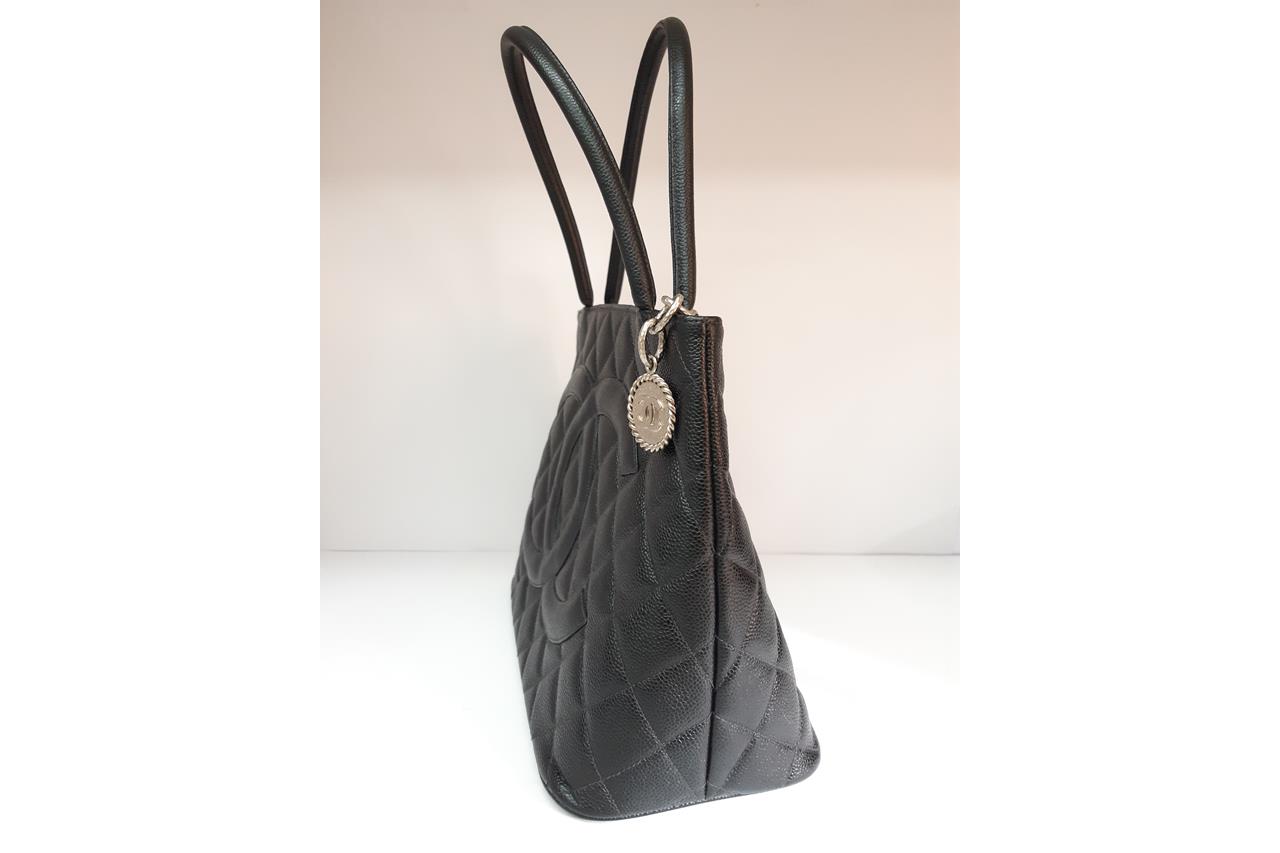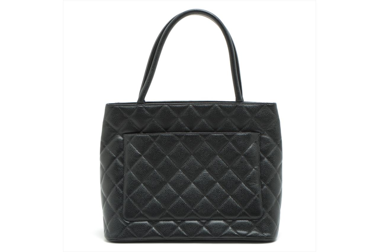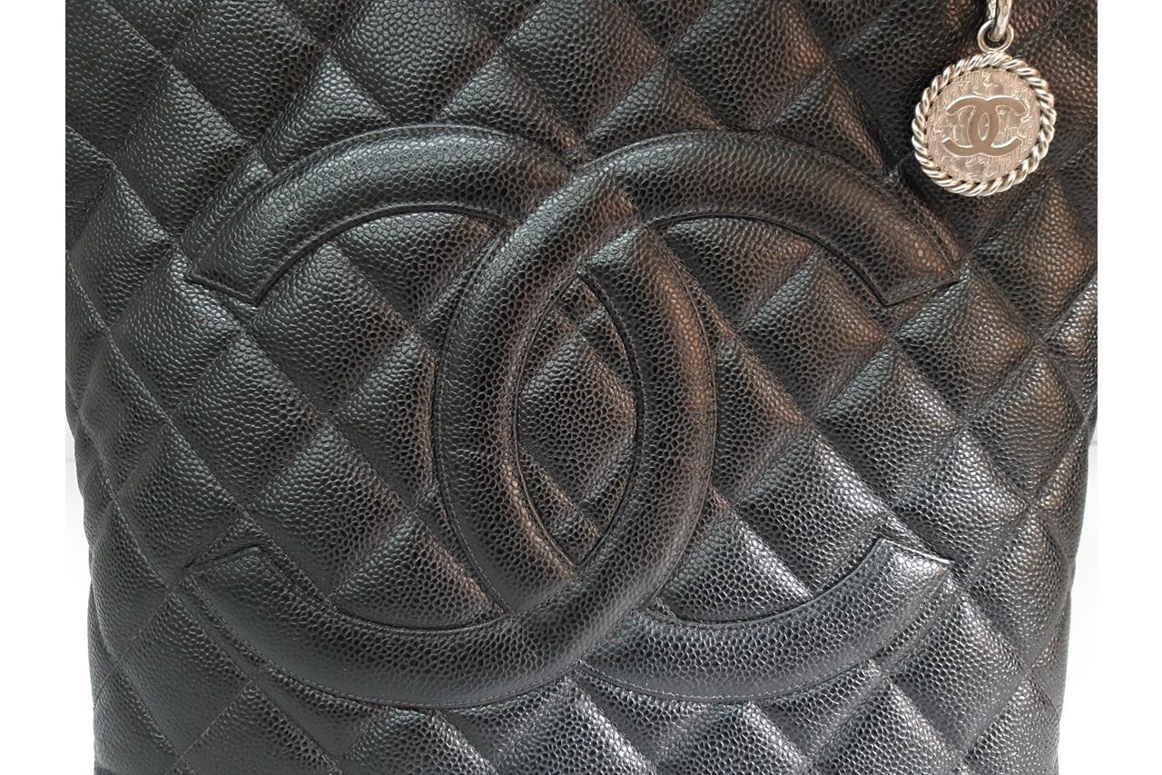 Chanel Medallion tote bag in black diamond quilted caviar Leather. Featuring signature interlocking CC logo at front, an exterior pocket at the back, silver-tone hardware, top zip closure. It opens to a leather lined interior with zipped and patch pockets. Approximate dimensions: 32cm (L) x 25cm (H) x 15cm (D), and 15cm handle drop. Accompanied by Chanel certificate card and booklet. With Entrupy Certificate of Authenticity. (Pre-owned)