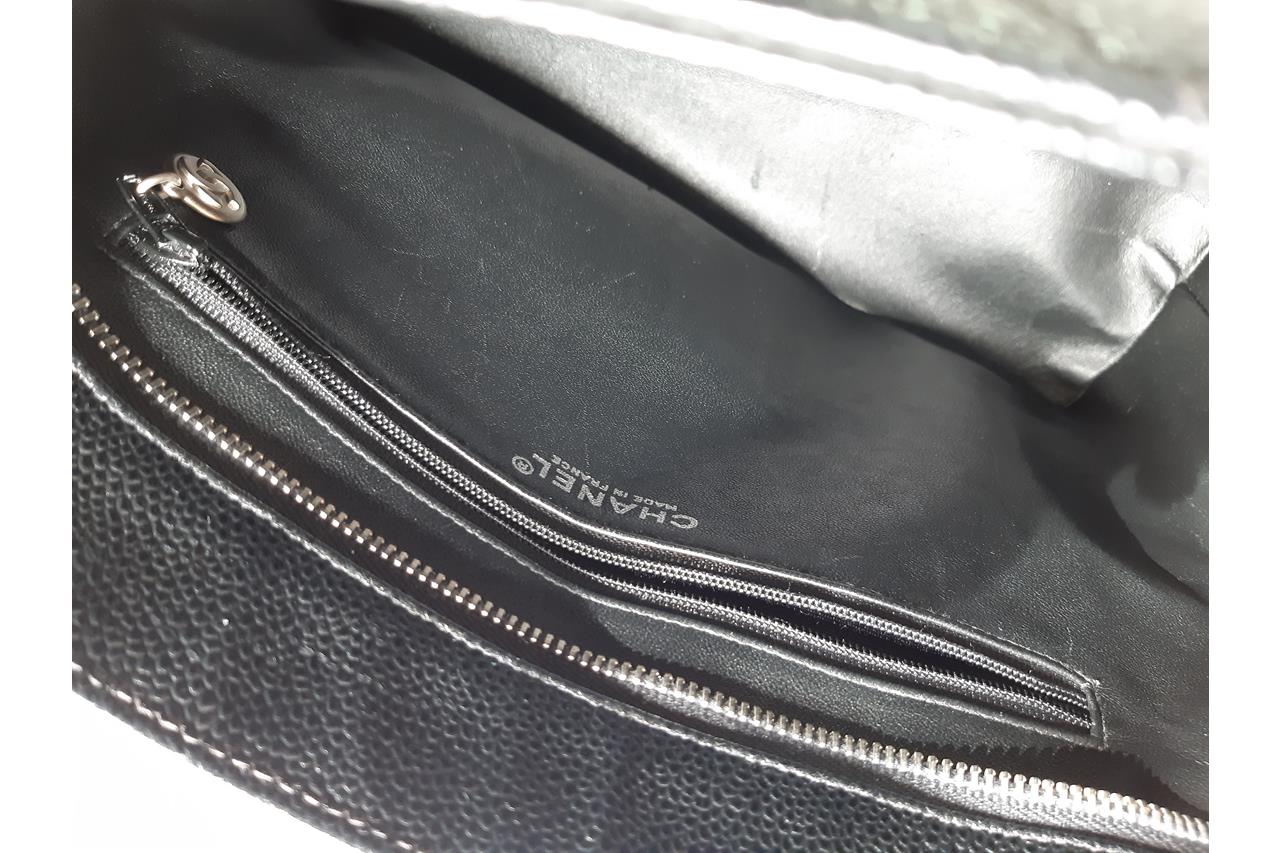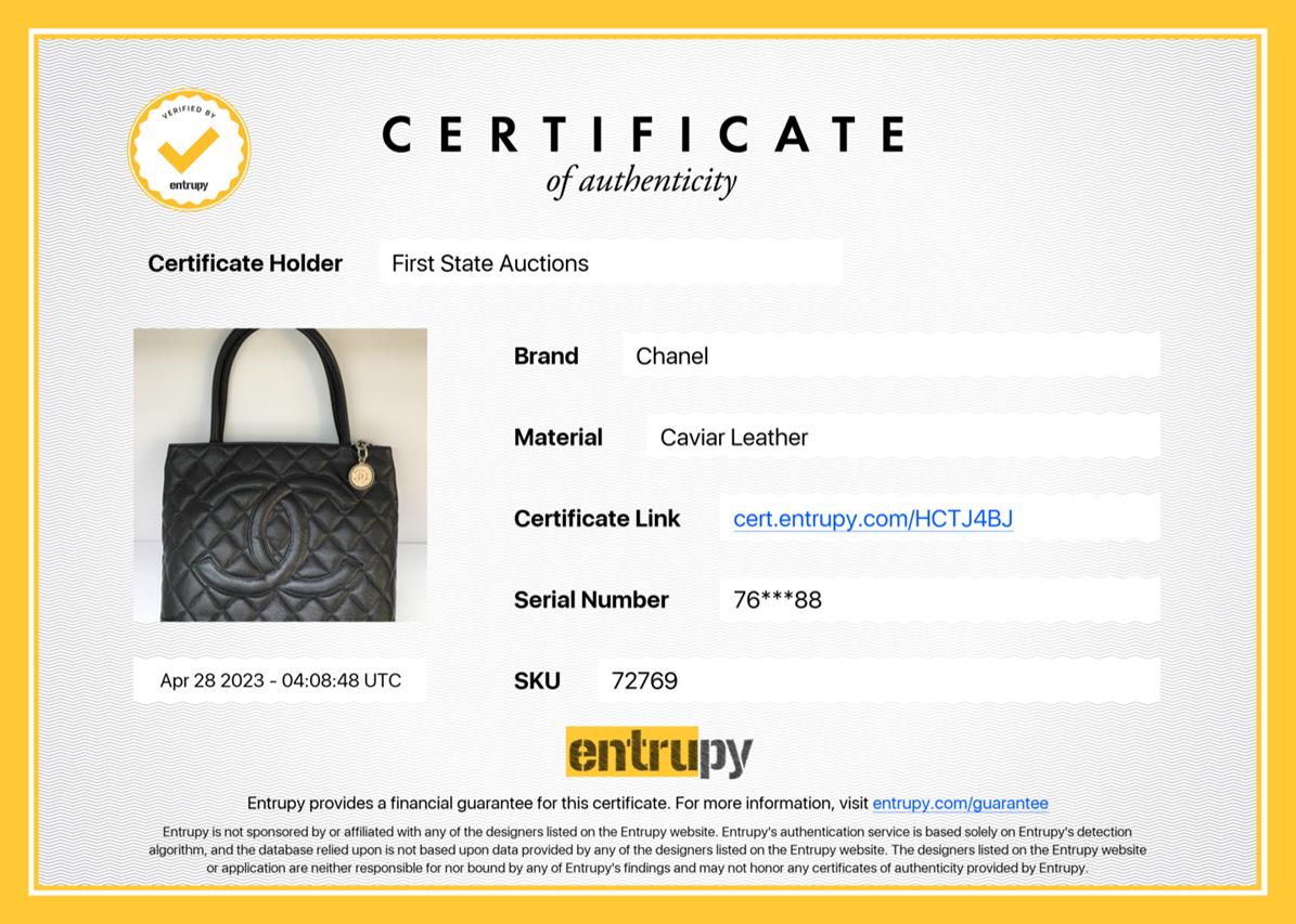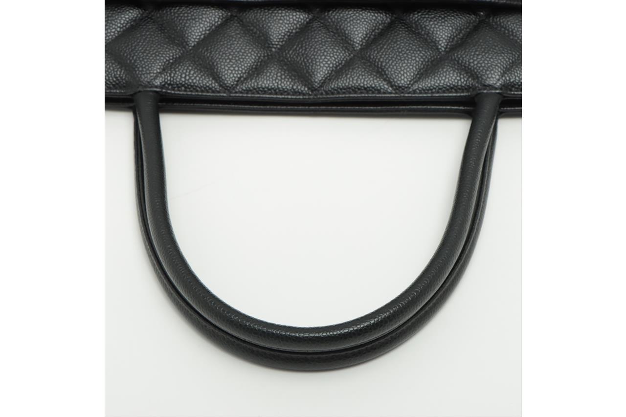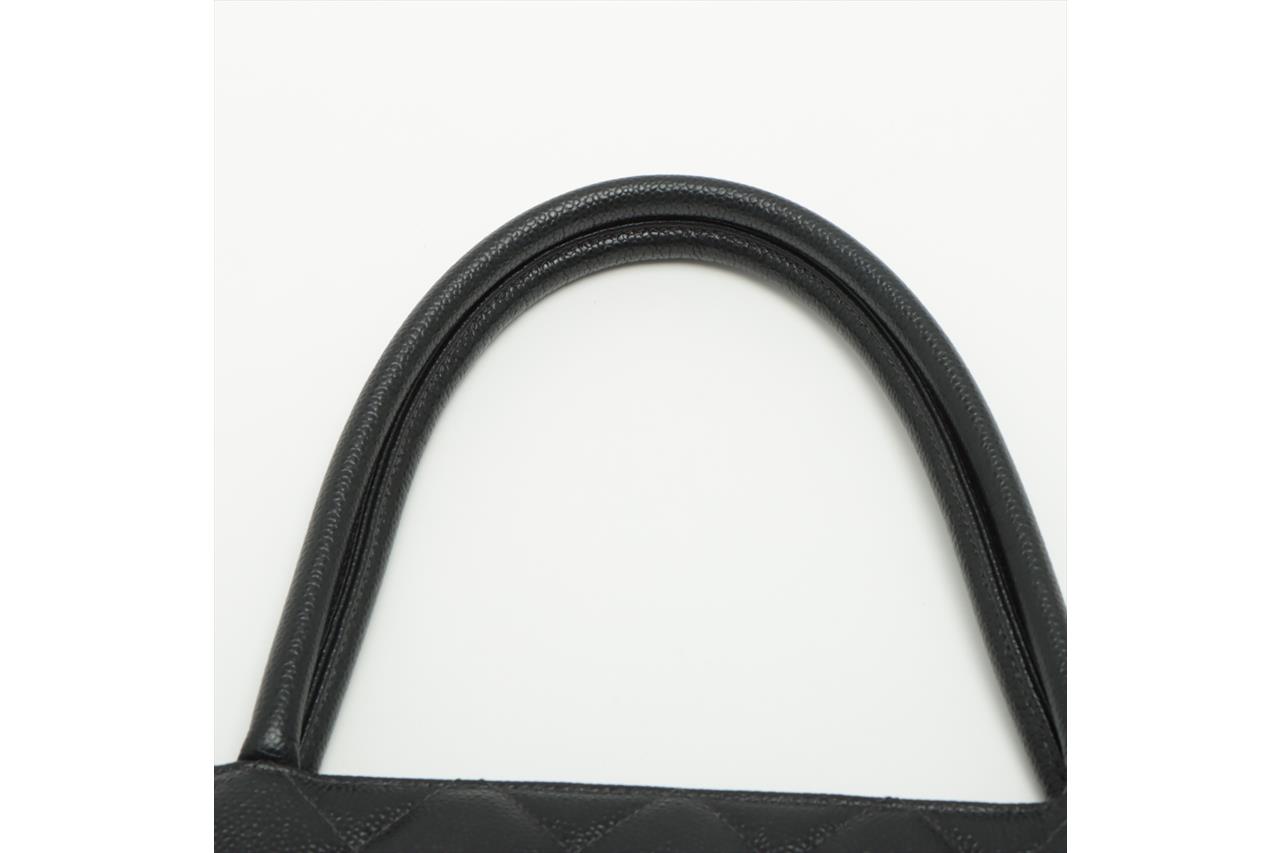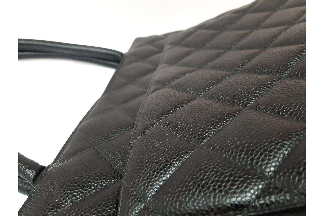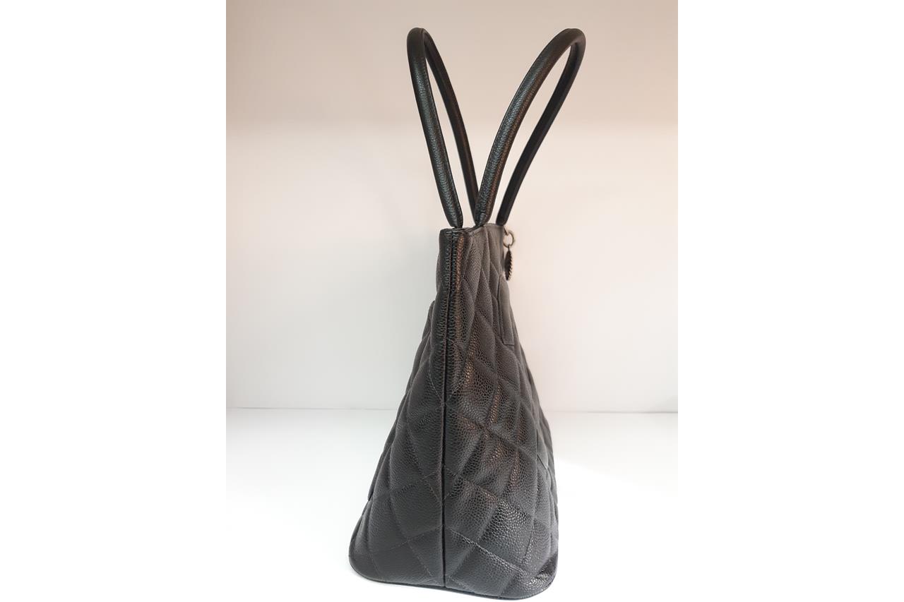 Chanel Medallion tote bag in black diamond quilted caviar Leather. Featuring signature interlocking CC logo at front, an exterior pocket at the back, silver-tone hardware, top zip closure. It opens to a leather lined interior with zipped and patch pockets. Approximate dimensions: 32cm (L) x 25cm (H) x 15cm (D), and 15cm handle drop. Accompanied by Chanel certificate card and booklet. With Entrupy Certificate of Authenticity. (Pre-owned)