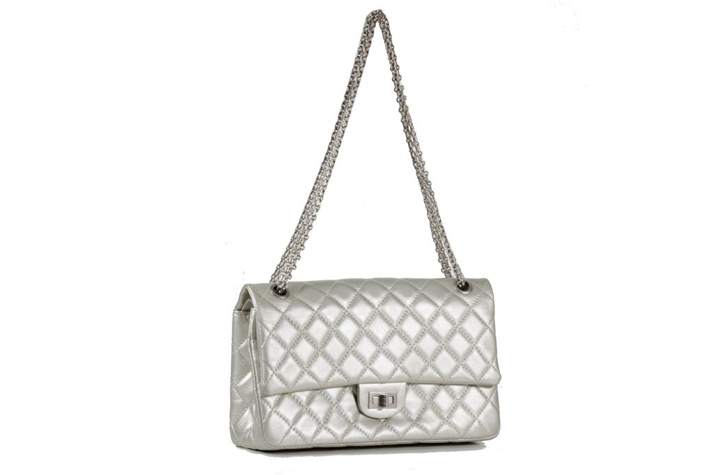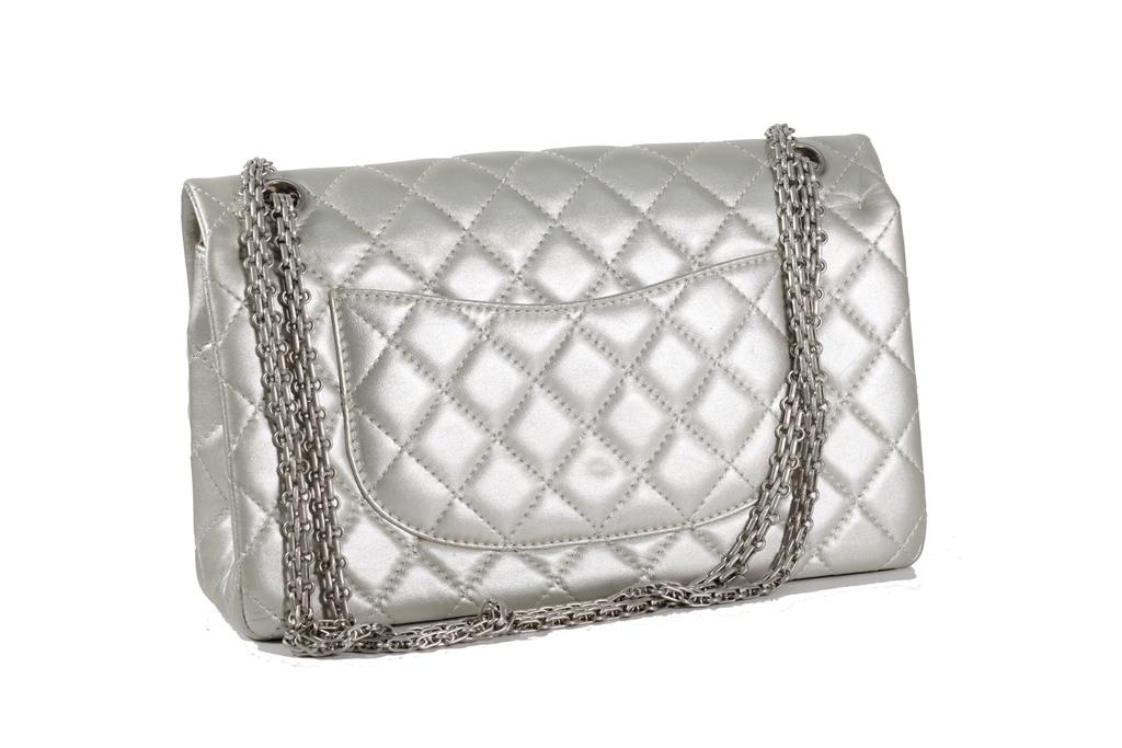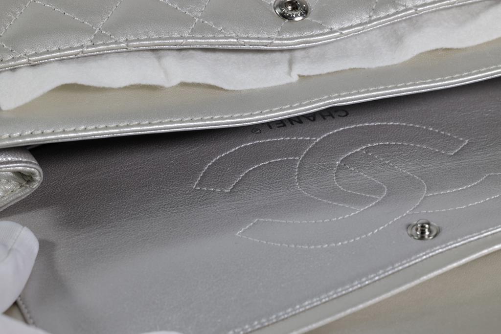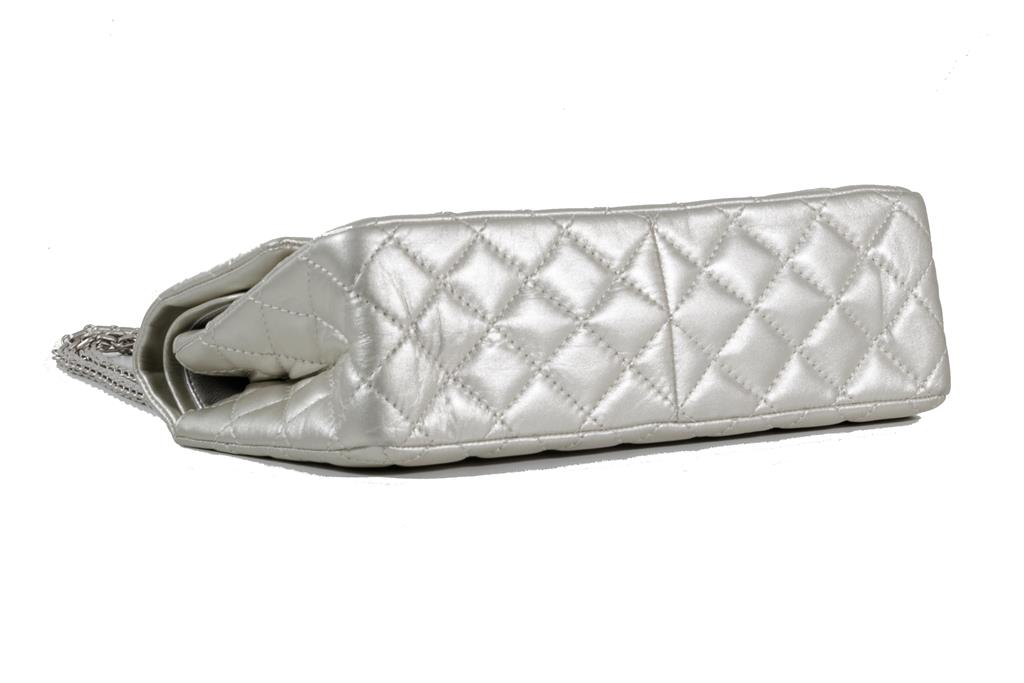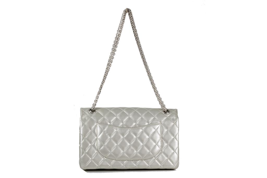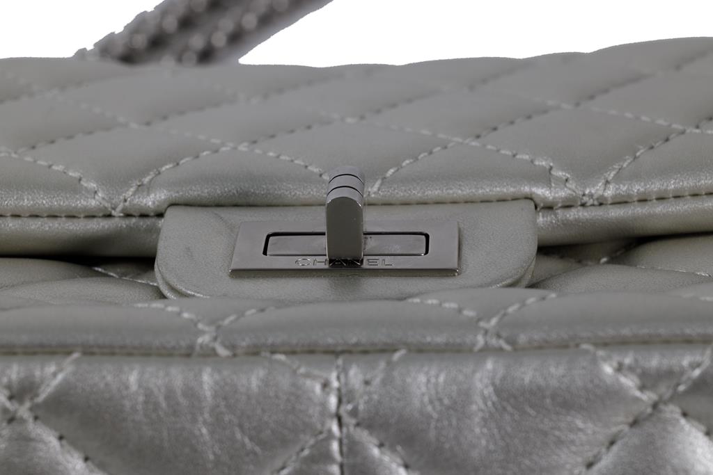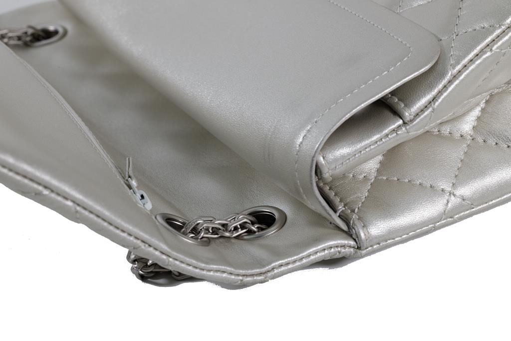 Chanel Metallic Silver Quilted Reissue 2.55 Classic Double Flap Bag. Featuring silver-tone hardware, double flap one zippered pocket underneath the flap, leather lined interior with one flat pocket, and front turn lock closure. Approximate dimensions: 27.5cm (L) x 17cm (H) x 9cm (D), and 28cm handle drop. Accompanied by Chanel Authenticity card. With Entrupy Certificate of Authenticity. (Pre-owned)