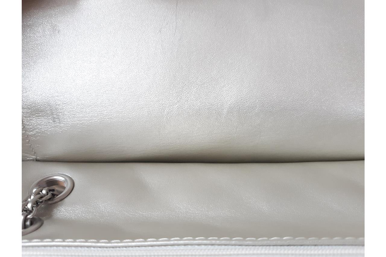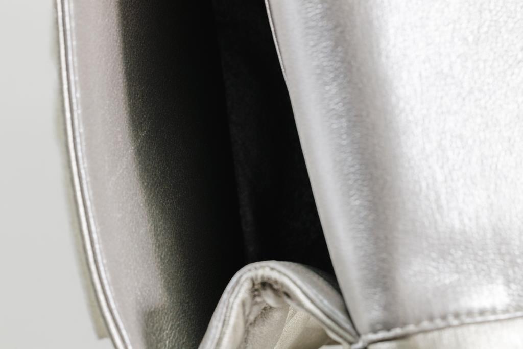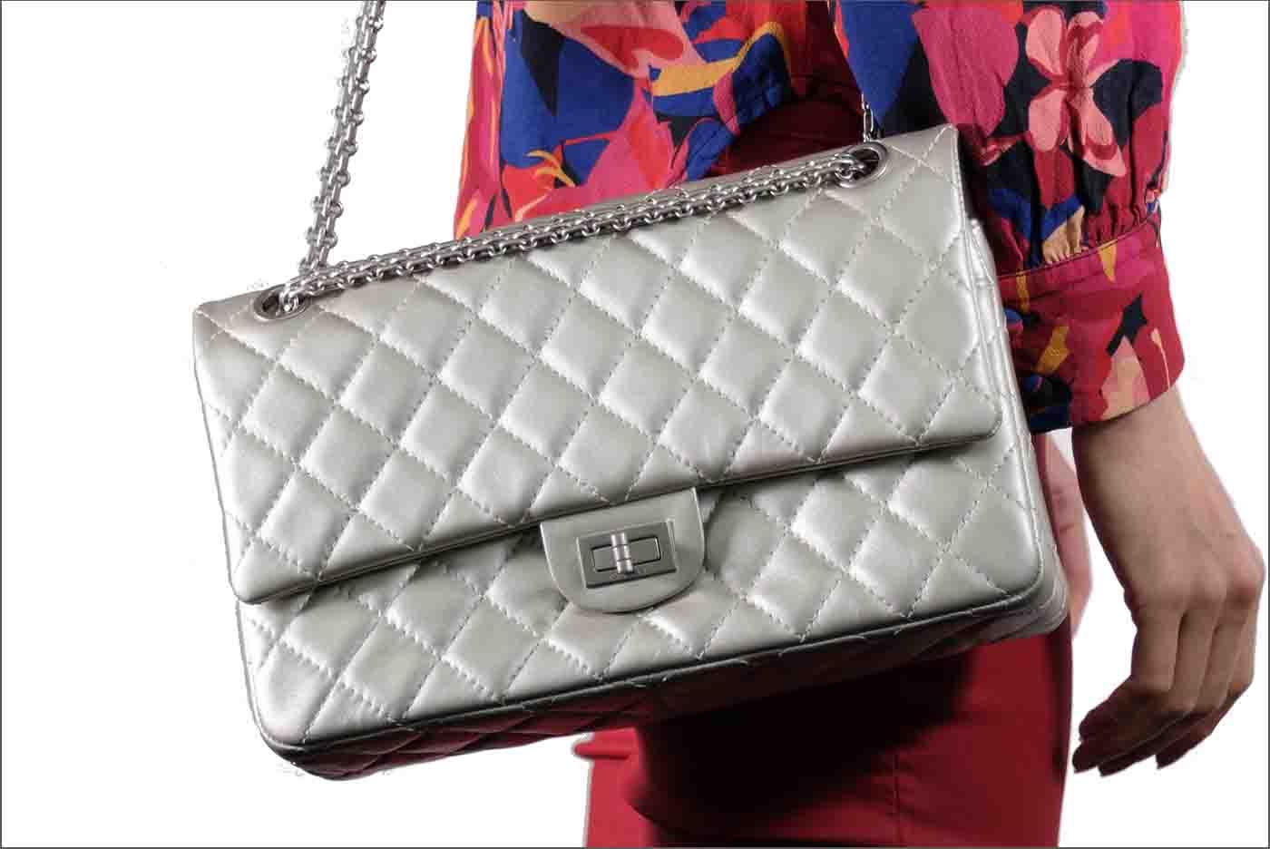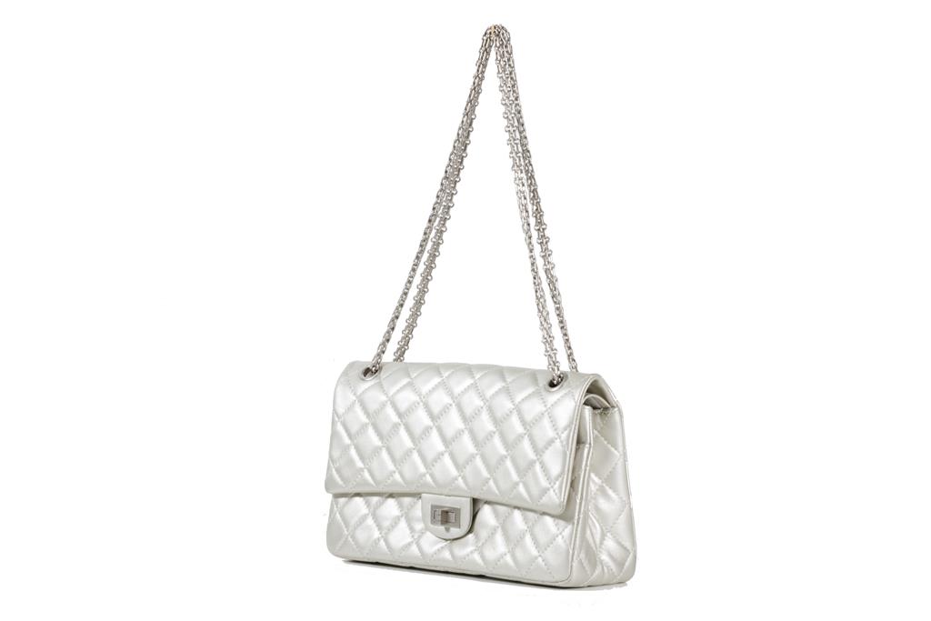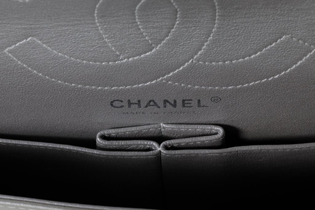 Chanel Metallic Silver Quilted Reissue 2.55 Classic Double Flap Bag. Featuring silver-tone hardware, double flap one zippered pocket underneath the flap, leather lined interior with one flat pocket, and front turn lock closure. Approximate dimensions: 27.5cm (L) x 17cm (H) x 9cm (D), and 28cm handle drop. Accompanied by Chanel Authenticity card. With Entrupy Certificate of Authenticity. (Pre-owned)