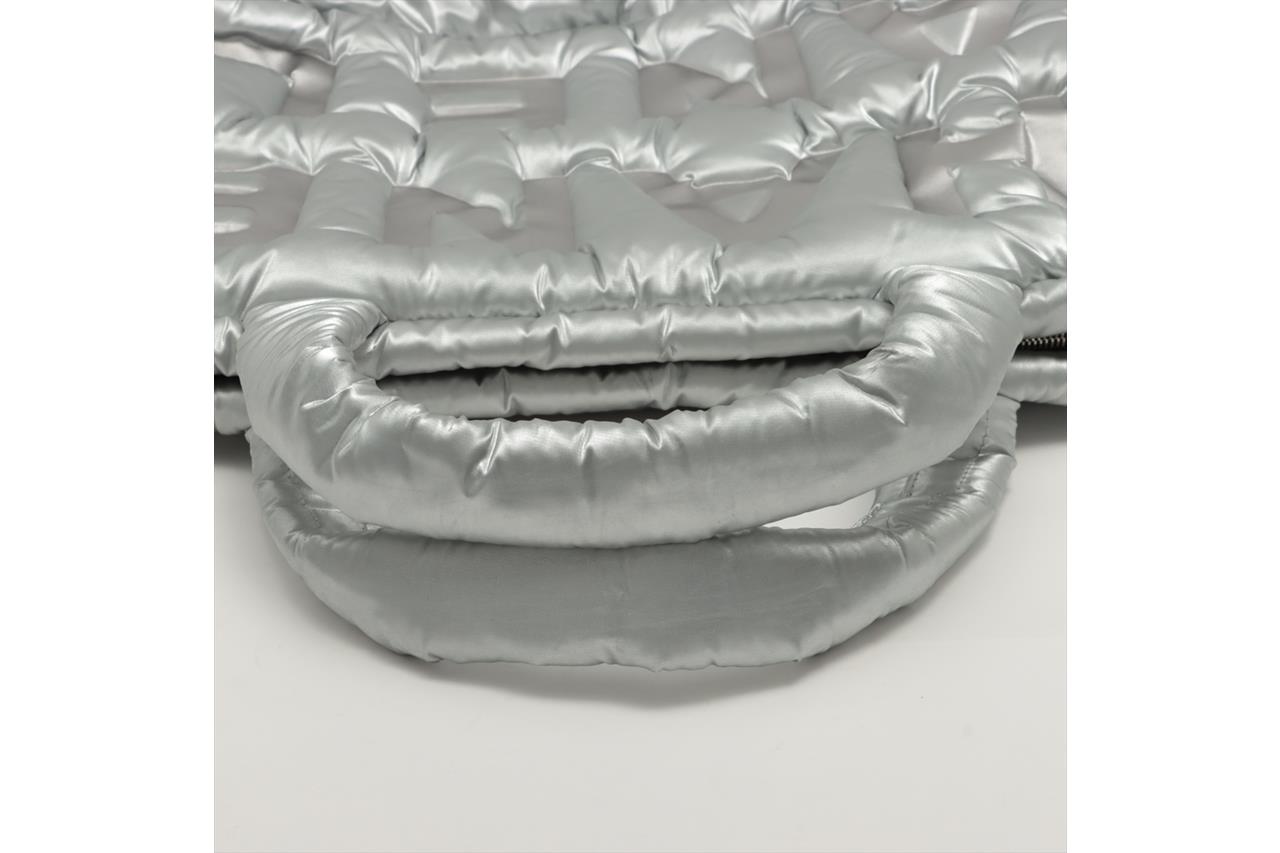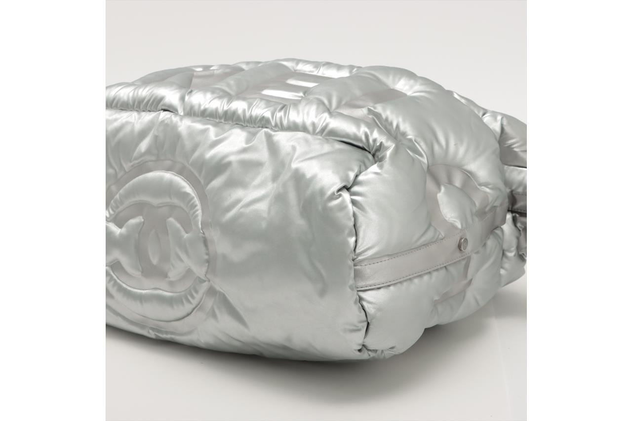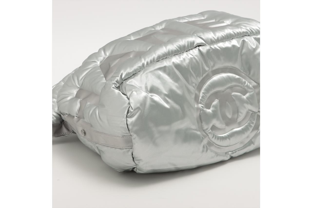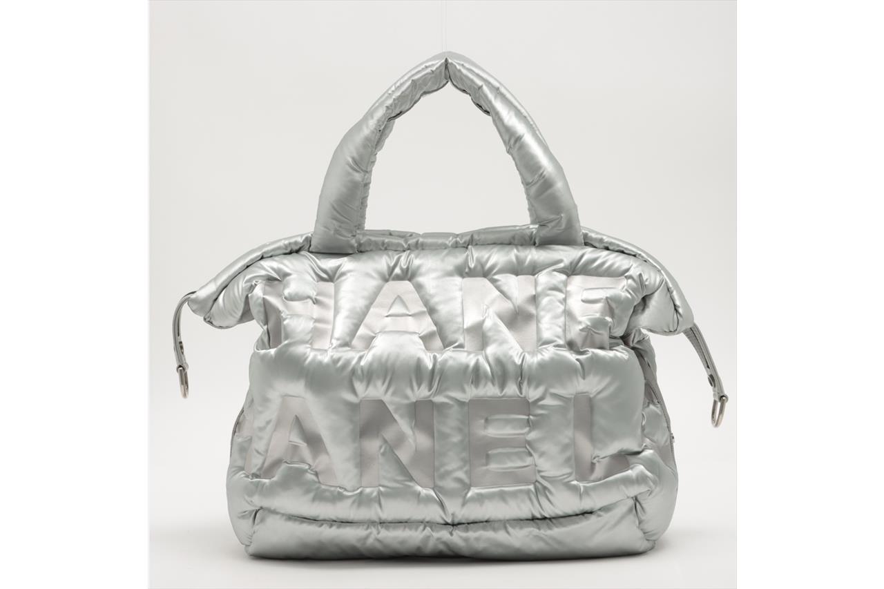 Chanel embossed Doudoune bowling bag in silver soft nylon fabric. Featuring large embossed CHANEL letters, polished silver tone hardware. The zipper pull opens to a navy blue nylon fabric interior with a zipper pocket. Approximate dimensions: 40cm(L) x 33.5cm(H) 14.5cm(D), 13.5cm handle drop and 35cm adjustable and detachable strap height. Accompanied by Chanel card of authenticity. With Entrupy Certificate of Authenticity. (Pre-owned)