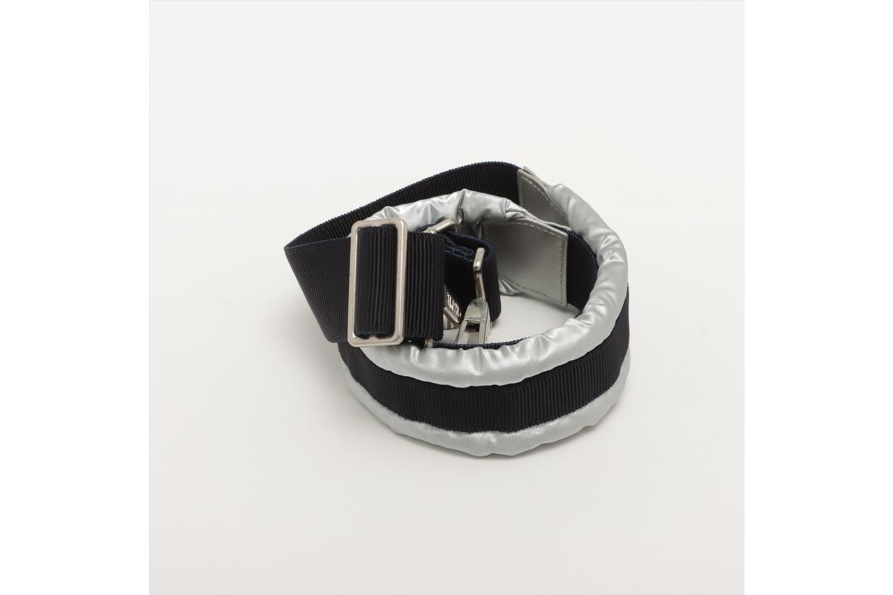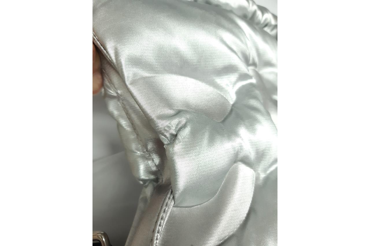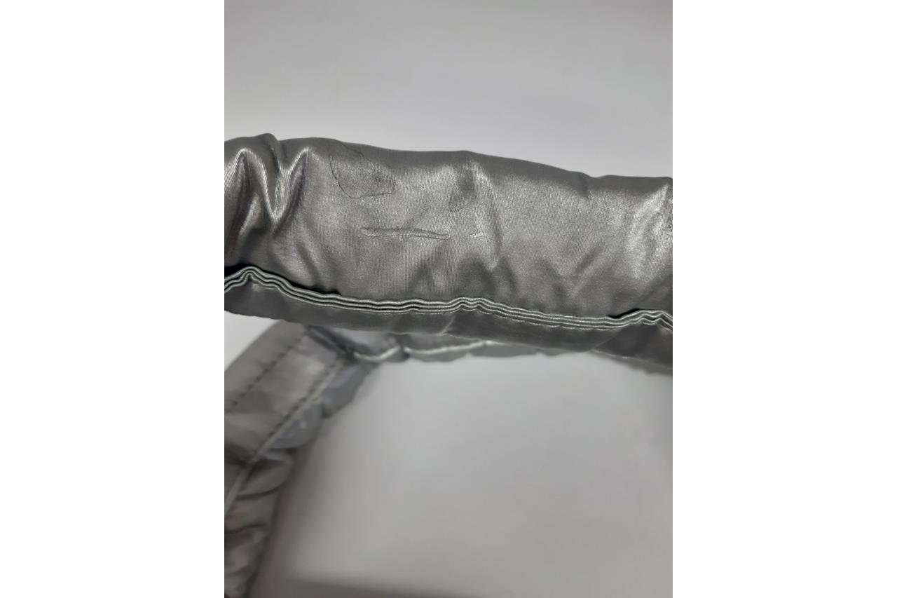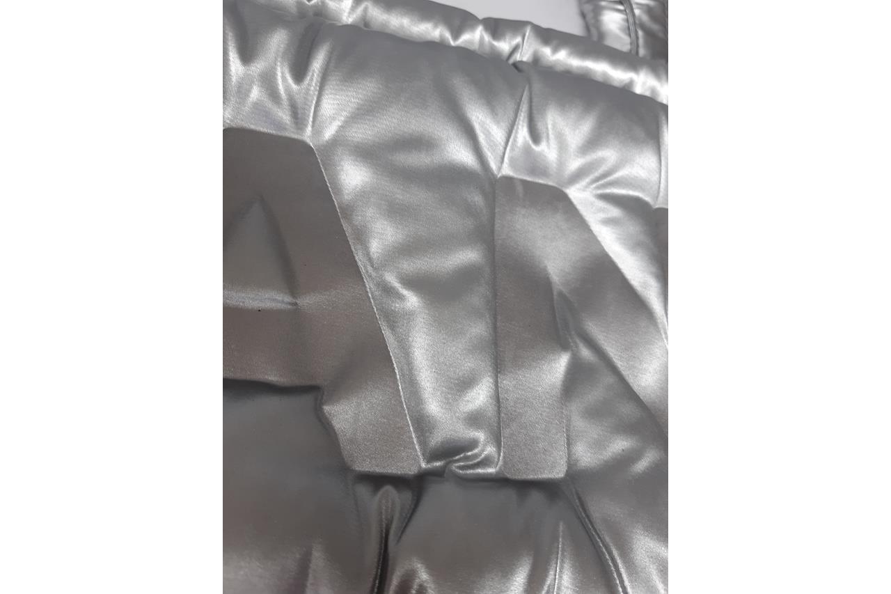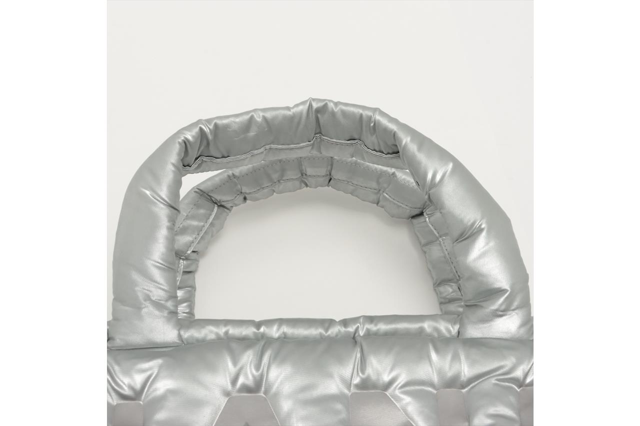 Chanel embossed Doudoune bowling bag in silver soft nylon fabric. Featuring large embossed CHANEL letters, polished silver tone hardware. The zipper pull opens to a navy blue nylon fabric interior with a zipper pocket. Approximate dimensions: 40cm(L) x 33.5cm(H) 14.5cm(D), 13.5cm handle drop and 35cm adjustable and detachable strap height. Accompanied by Chanel card of authenticity. With Entrupy Certificate of Authenticity. (Pre-owned)