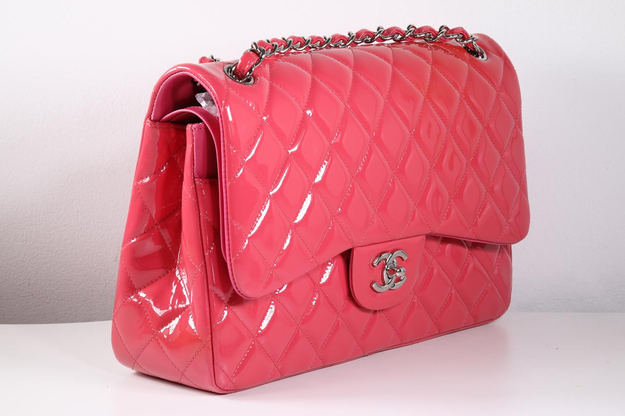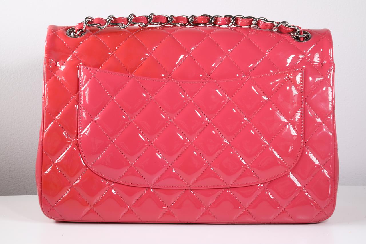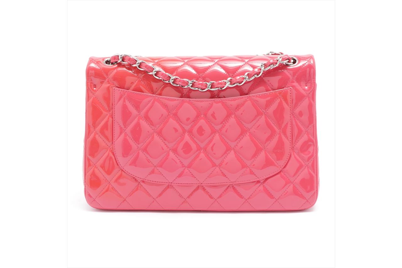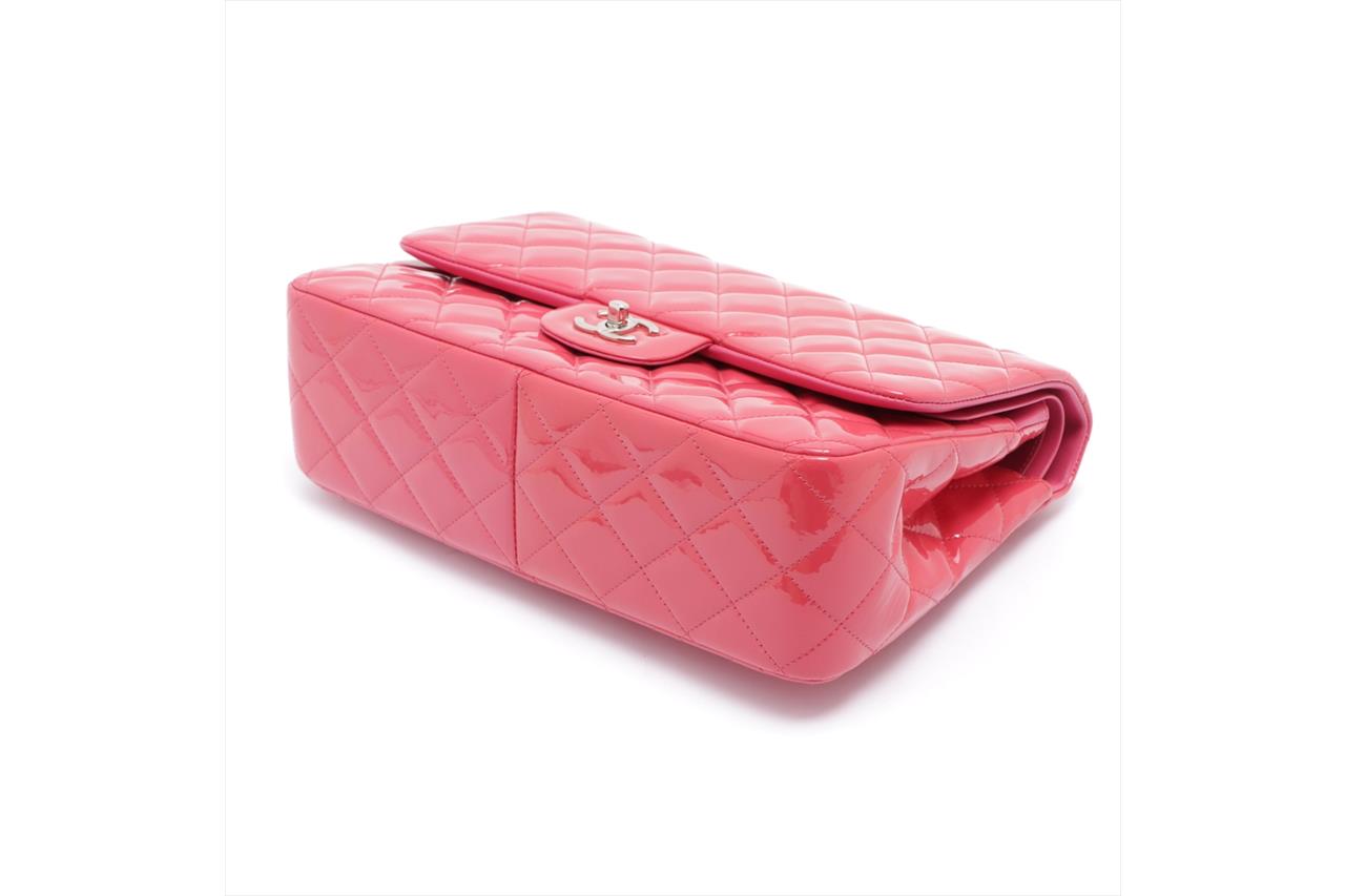 Chanel Patent Classic Jumbo Double Flap Bag. Pink Patent Leather. Silver-tone hardware. Approximate dimensions: 30cm (L) x 20cm (H) x 8cm (D). Accompanied by Chanel dust bag. With Entrupy Certificate of Authenticity. (Pre-owned).