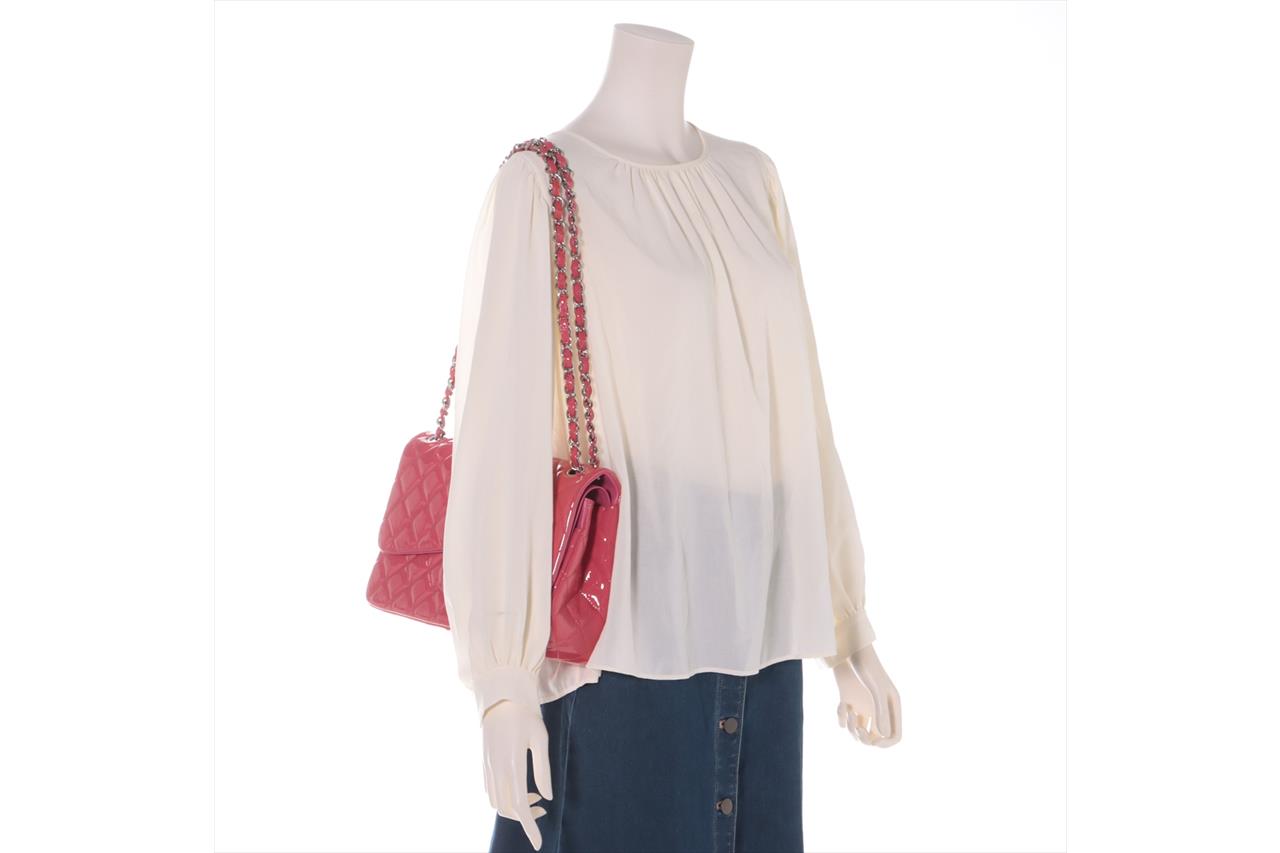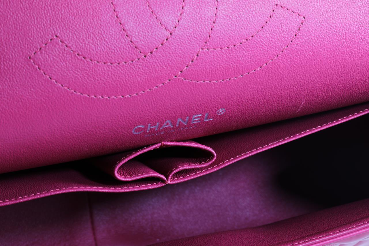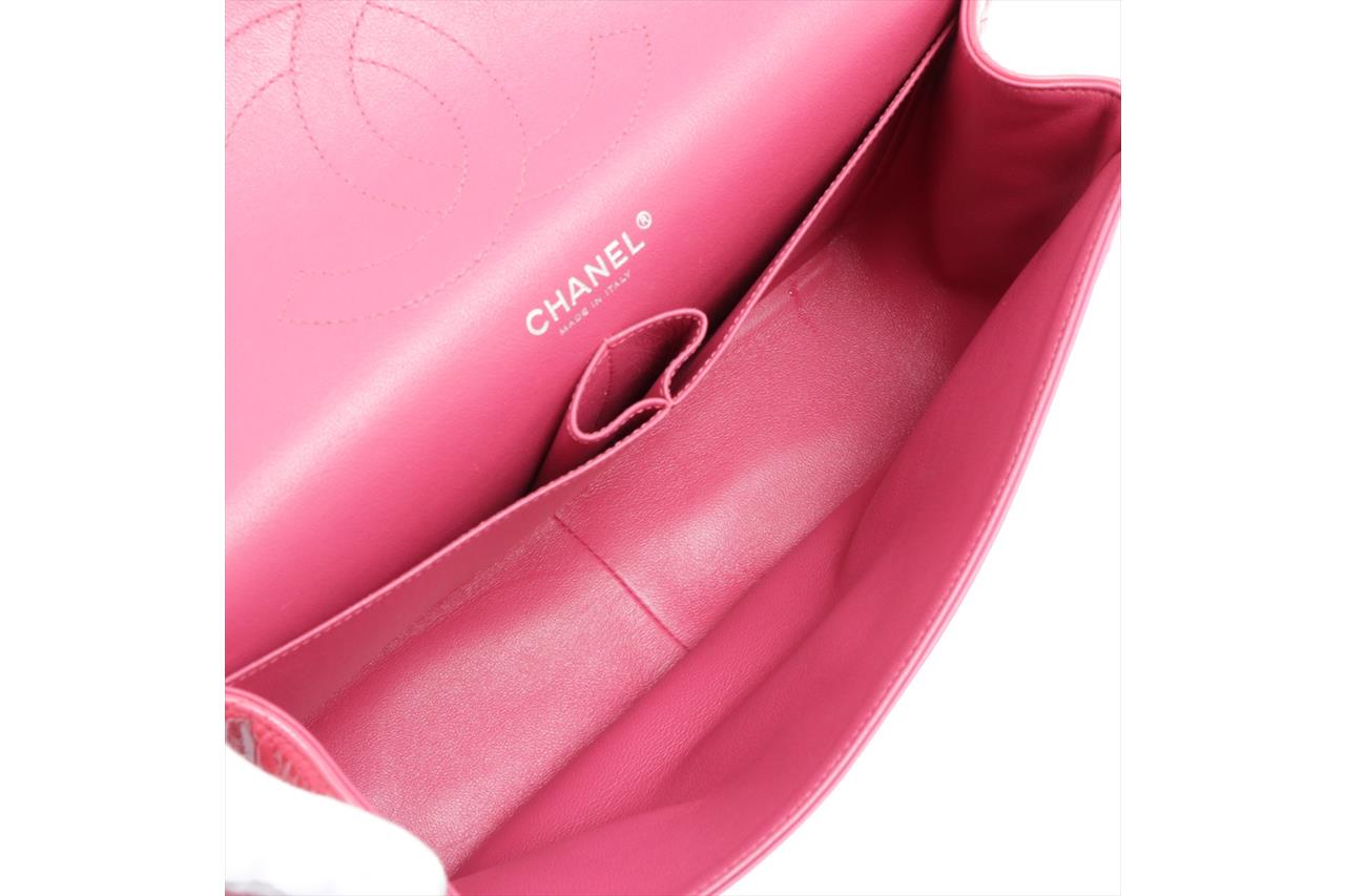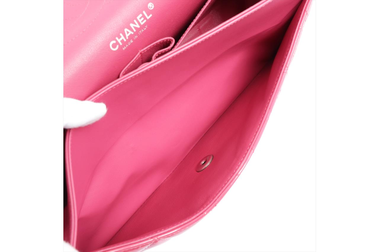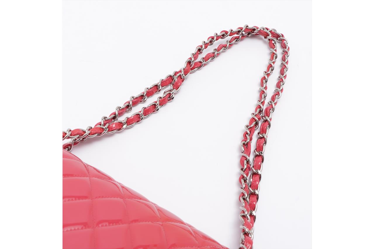 Chanel Patent Classic Jumbo Double Flap Bag. Pink Patent Leather. Silver-tone hardware. Approximate dimensions: 30cm (L) x 20cm (H) x 8cm (D). Accompanied by Chanel dust bag. With Entrupy Certificate of Authenticity. (Pre-owned).
