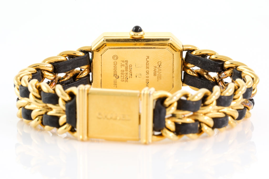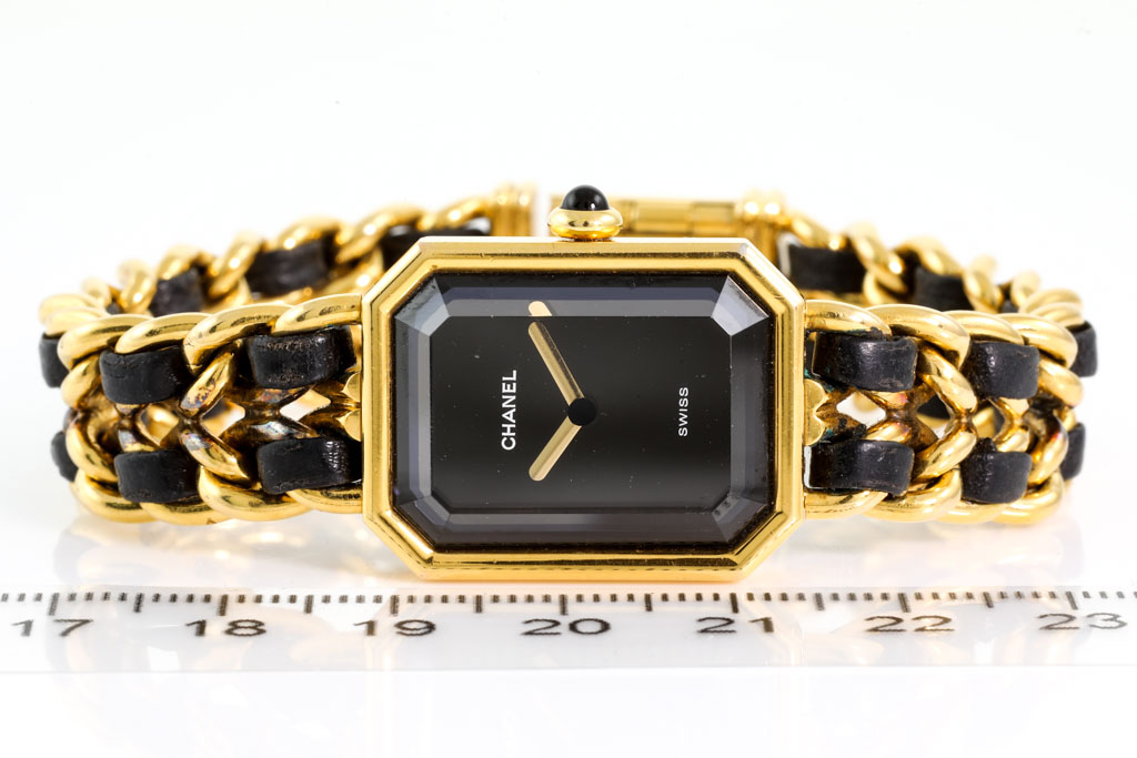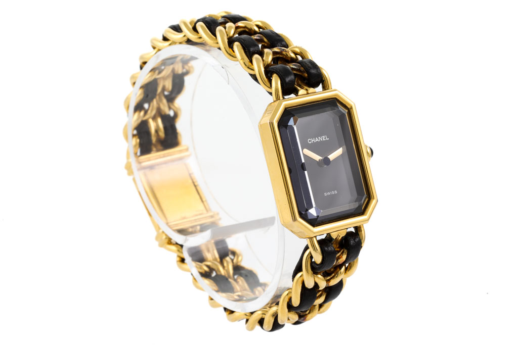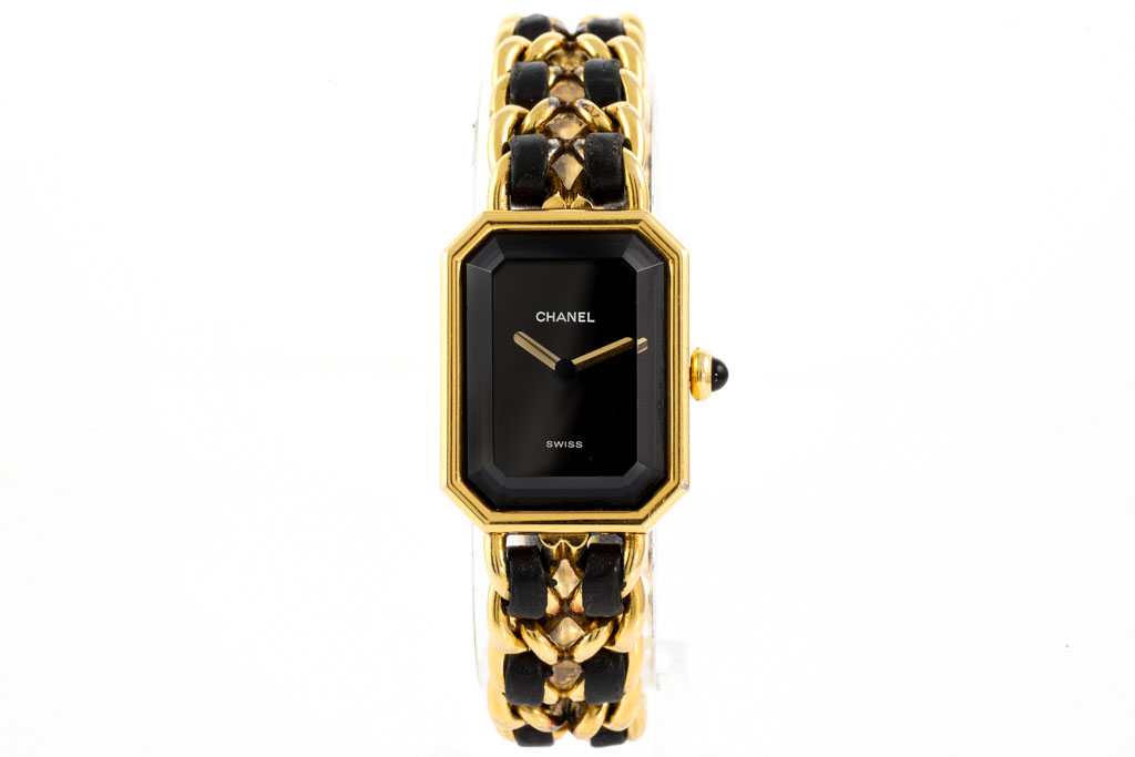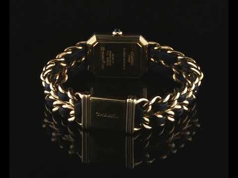 Chanel Premiere yellow gold plated stainless steel ladies quartz watch. Black dial, case diameter: 25mm x 20mm, wrist size: 15.5cm, Swiss Made. Ref# H0001. With Chanel black leather woven chain link bracelet. With Certificate of Authenticity and Chanel box. 3 month warranty. (Pre-owned)