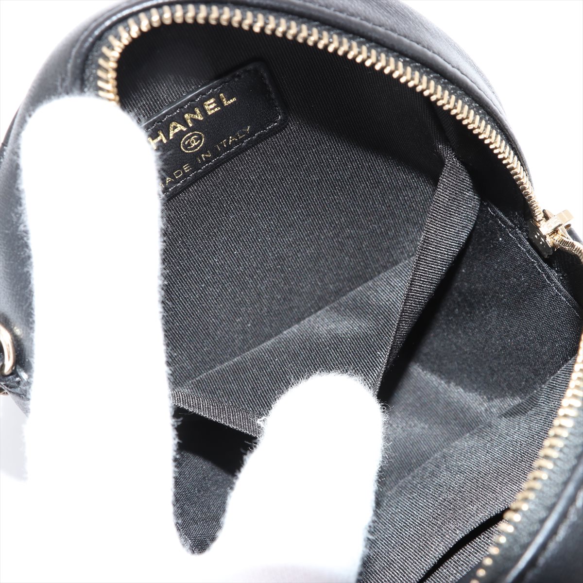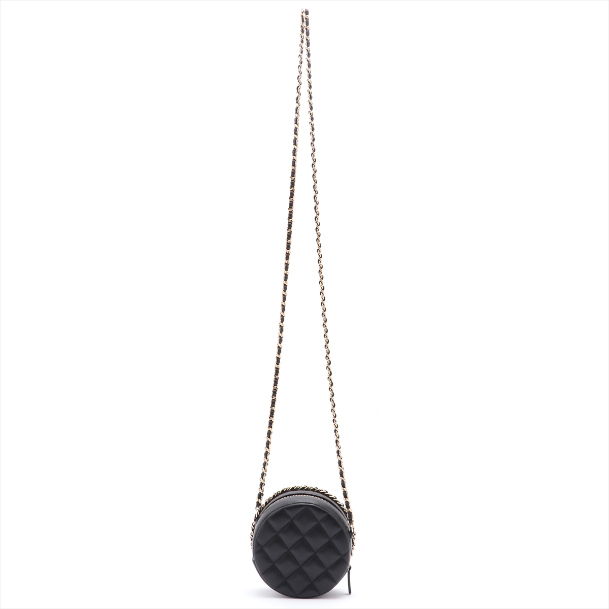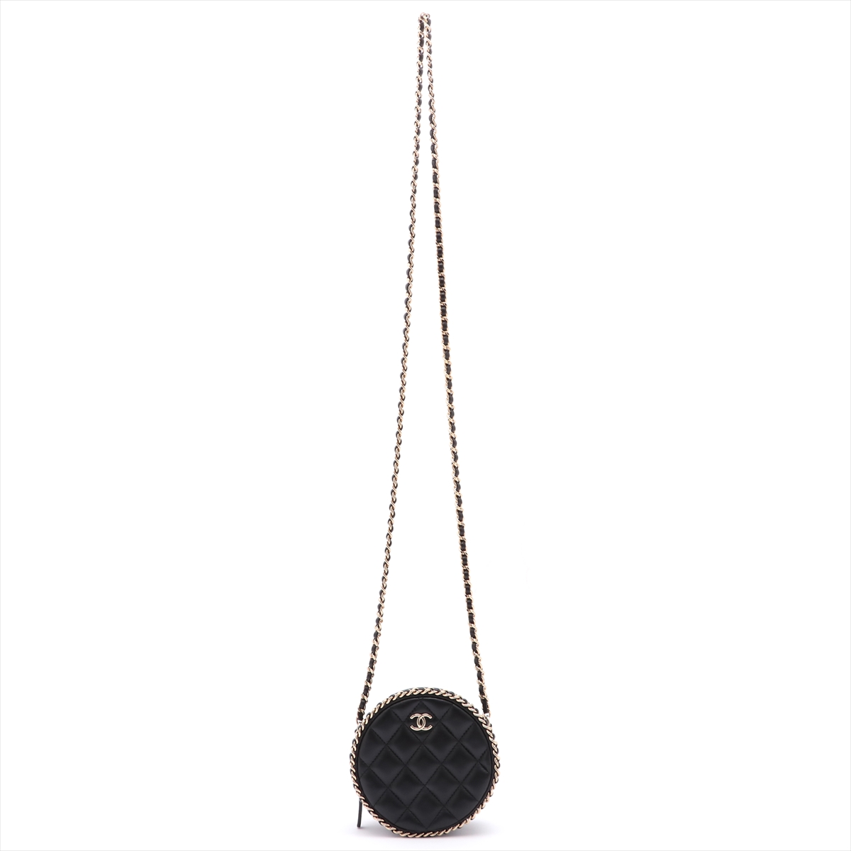 Chanel Round Mini Quilted Lambskin Chain Crossbody Bag. Black with gold-tone hardware. Approximate dimensions: 12cm x 12cm x 5cm. With Entrupy Certificate of Authenticity, Chanel Authenticity Card, Box and Small Leather Good Care Booklet. (Pre-owned)