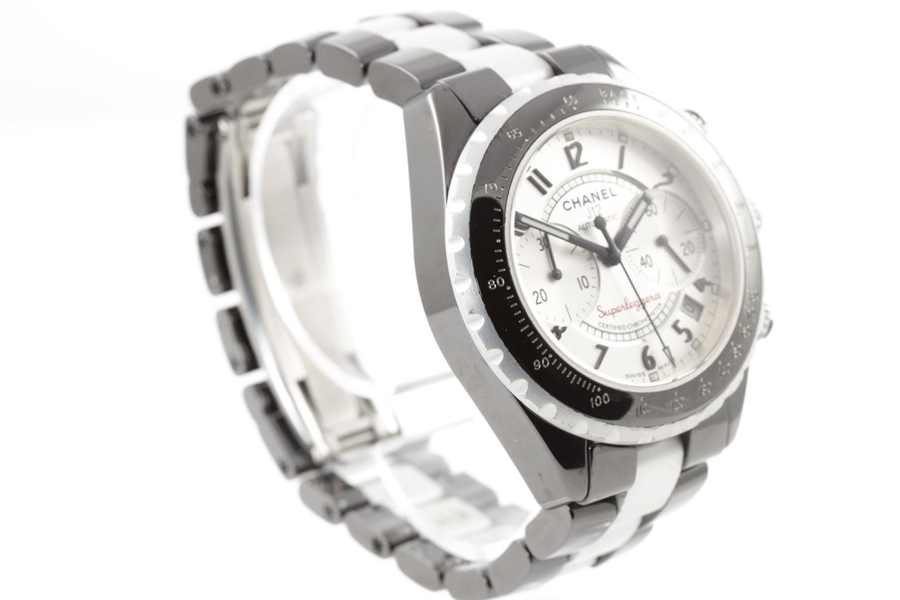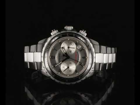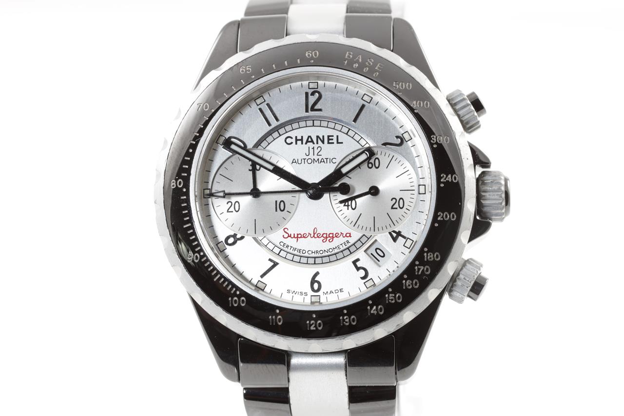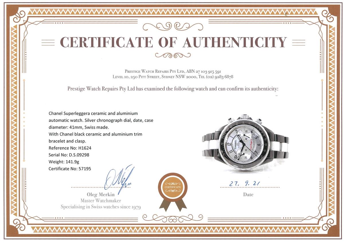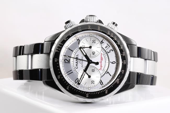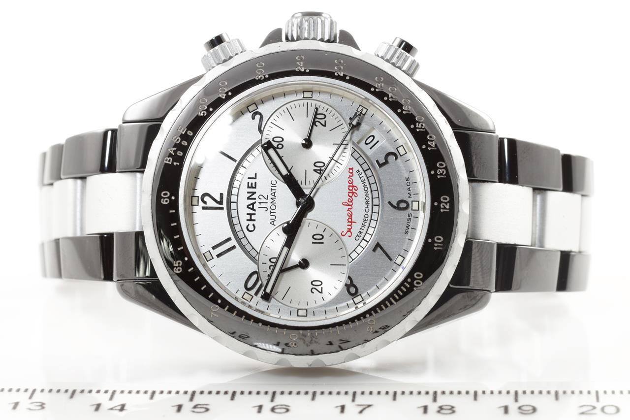 Chanel Superleggera ceramic and aluminium automatic watch. Silver chronograph dial, date, case diameter: 41mm, wrist size: 18cm, Swiss made. Ref# H1624. With Chanel black ceramic and aluminium trim bracelet and clasp. With certificate of authenticity, Chanel guarantee card dated 05/11/2023 and Chanel box. 3 month FSA warranty. (Pre-owned