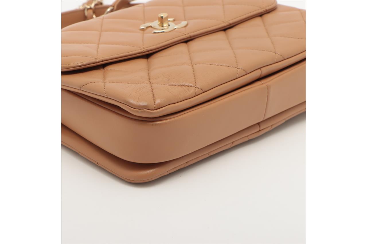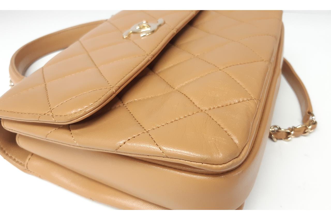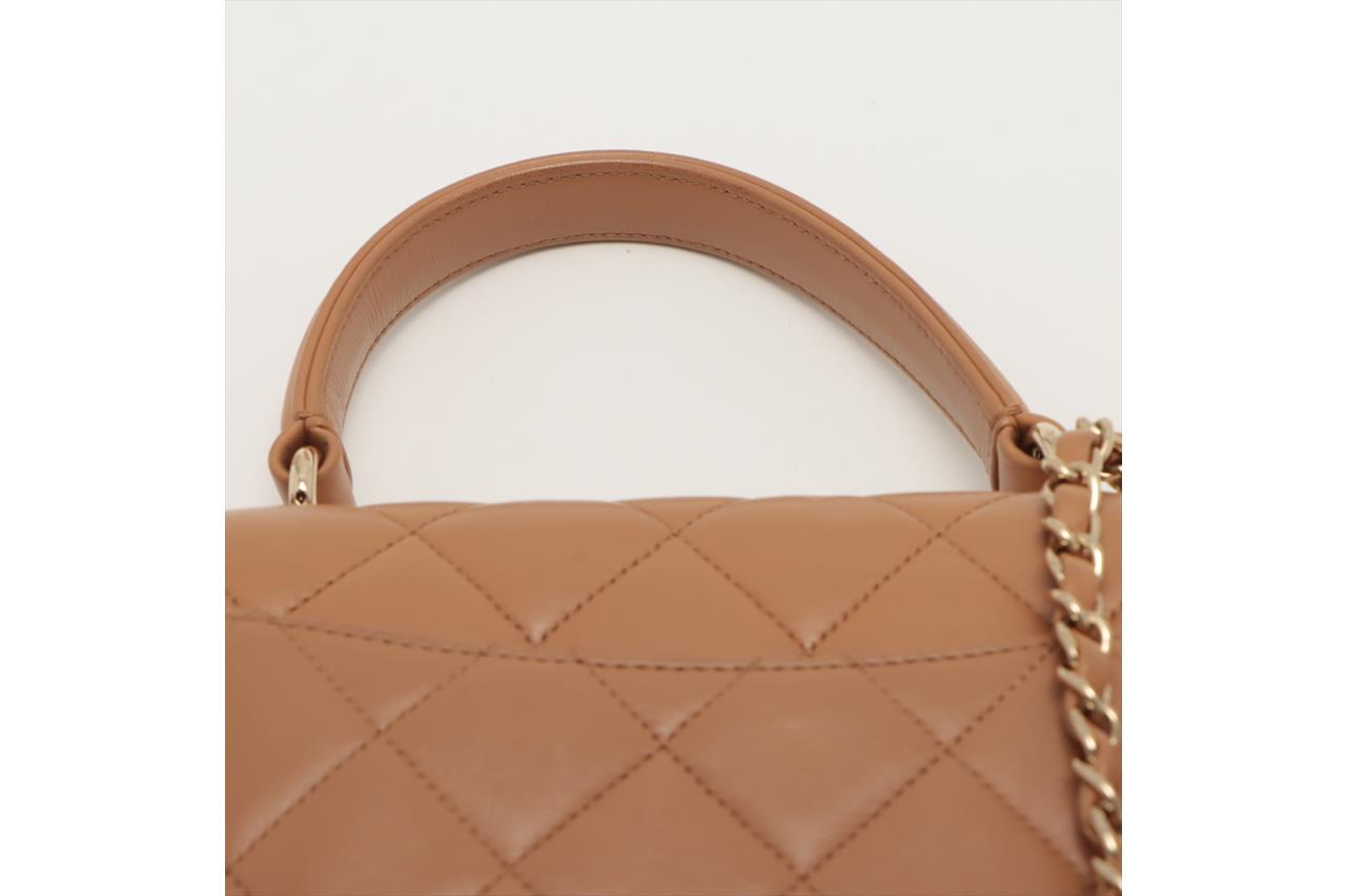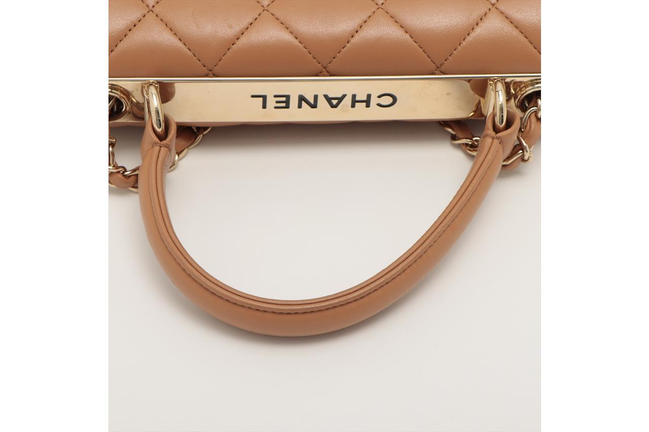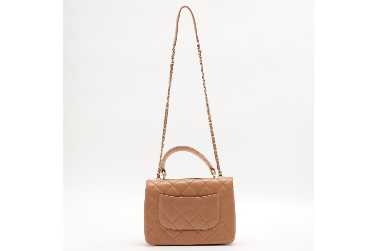 Chanel Trendy CC Top Handle Bag in brown quilted lambskin. One patch pocket at back. Gold-toned hardware, brown leather interior with 3 compartments, flap with turning lock closure on front. Approximate dimensions: 25cm(L) x 18.5cm(H) x 7cm(D), 11cm handle height, 48cm leather-chain strap height. With Entrupy Certificate of Authenticity. (Pre-owned)