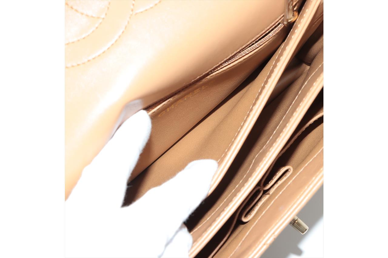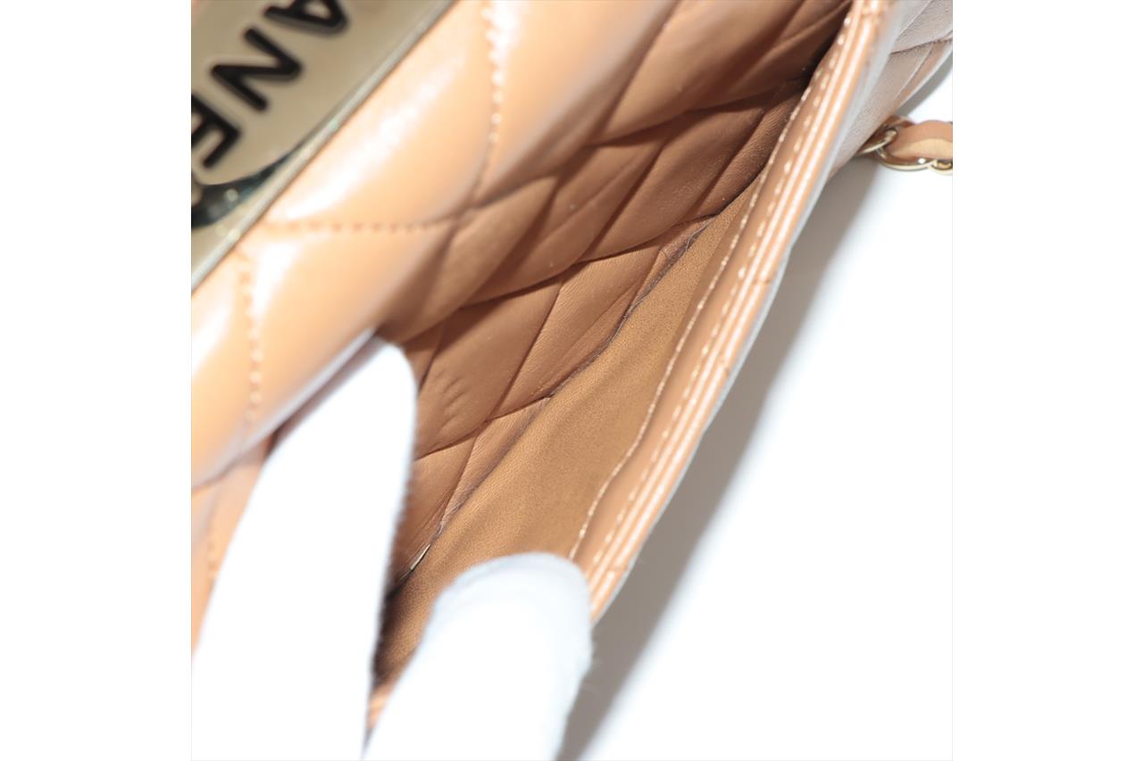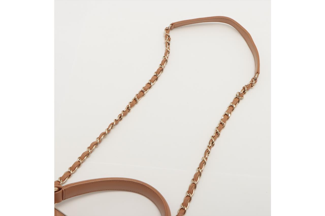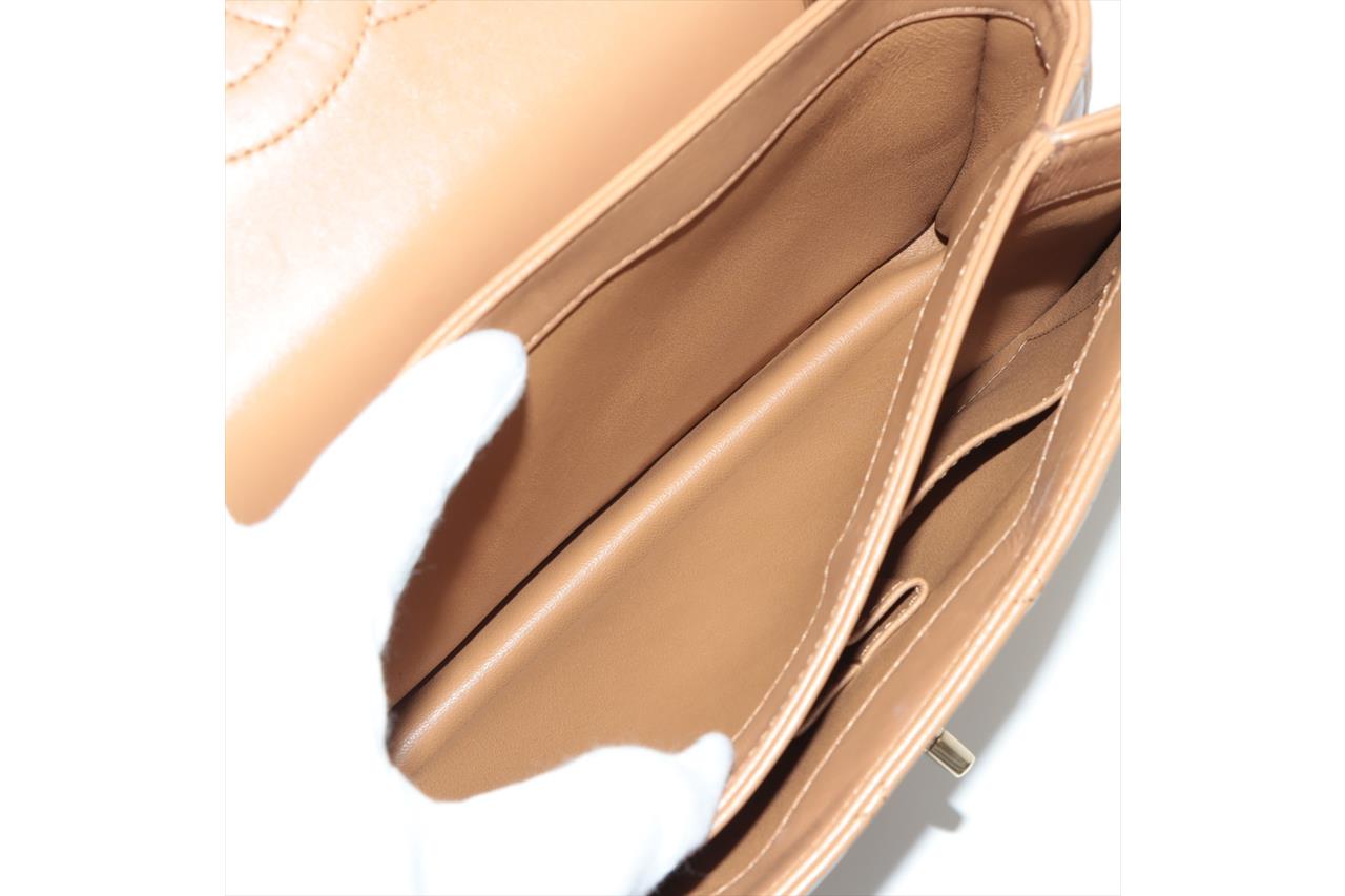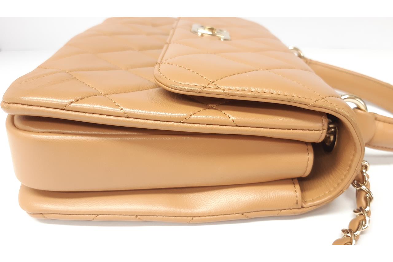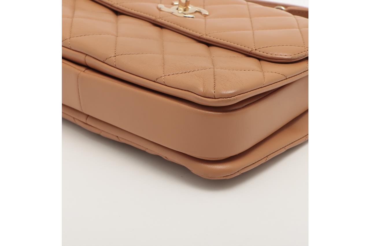 Chanel Trendy CC Top Handle Bag in brown quilted lambskin. One patch pocket at back. Gold-toned hardware, brown leather interior with 3 compartments, flap with turning lock closure on front. Approximate dimensions: 25cm(L) x 18.5cm(H) x 7cm(D), 11cm handle height, 48cm leather-chain strap height. With Entrupy Certificate of Authenticity. (Pre-owned)