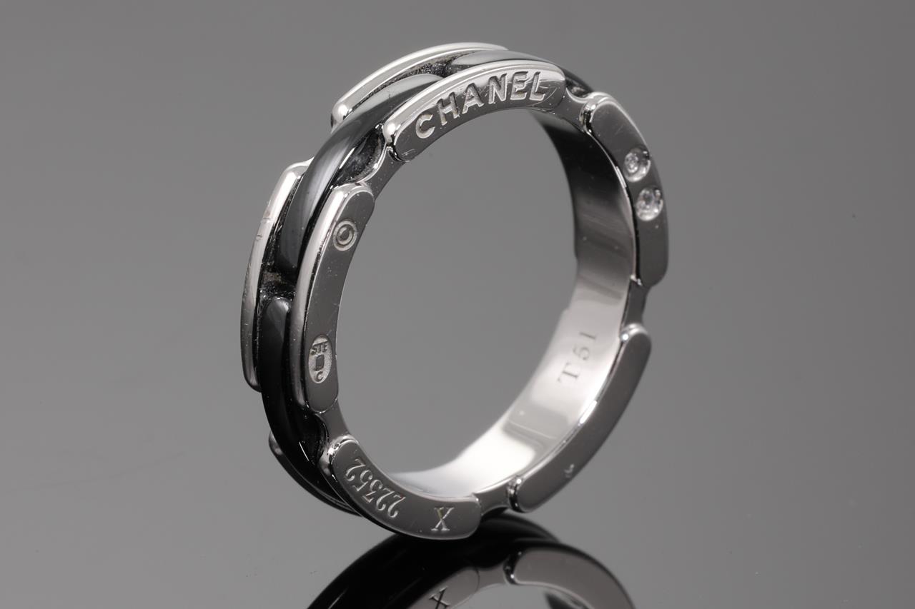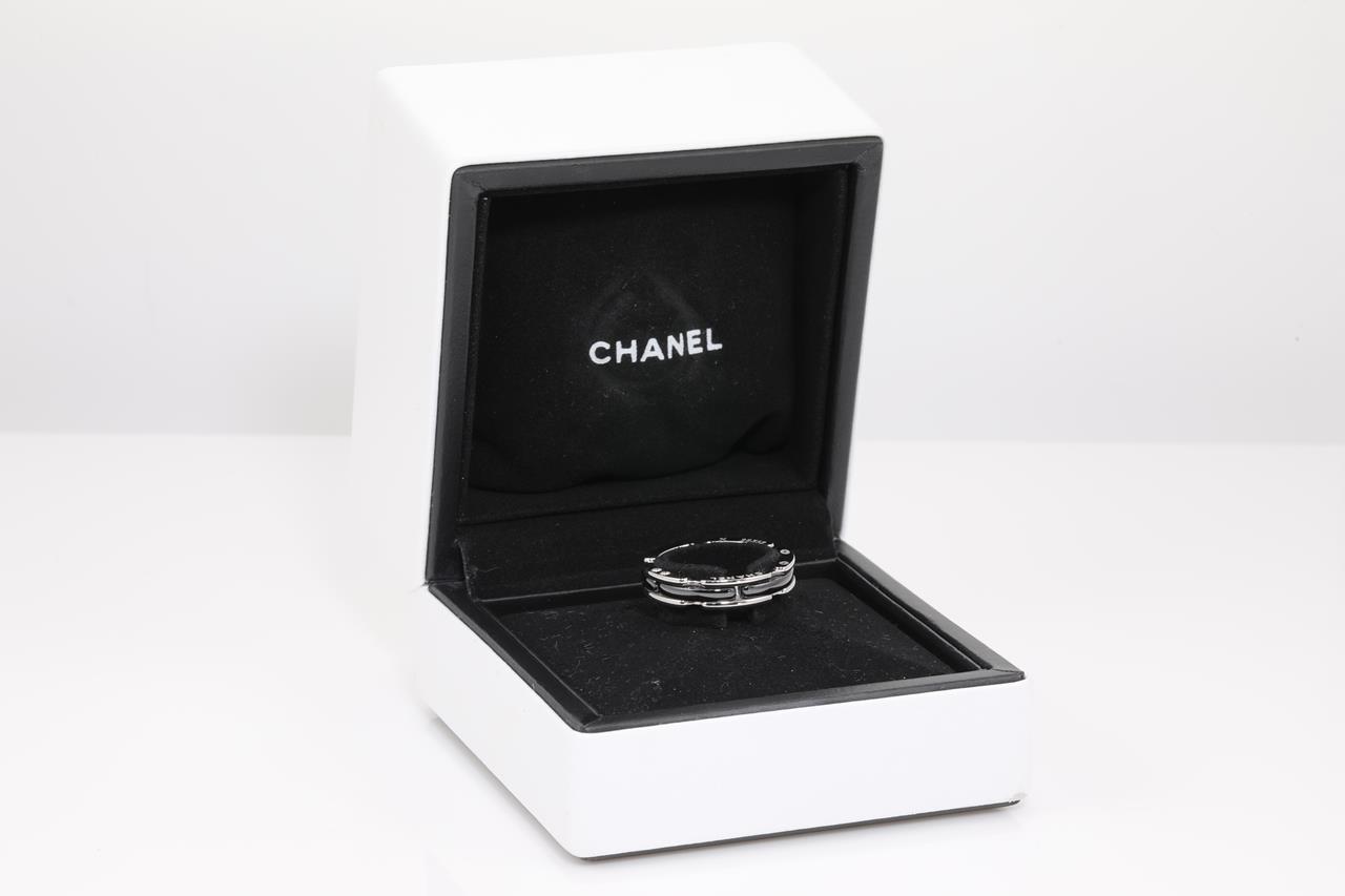 Chanel Ultra small version ring. 18ct white gold & black ceramic. Chanel stamped size T51, K - ring resizing is not recommended. Weight: 4.6g. With Chanel box. (Pre-owned)