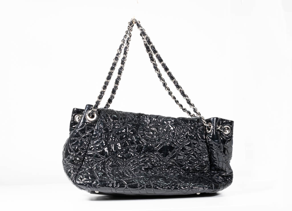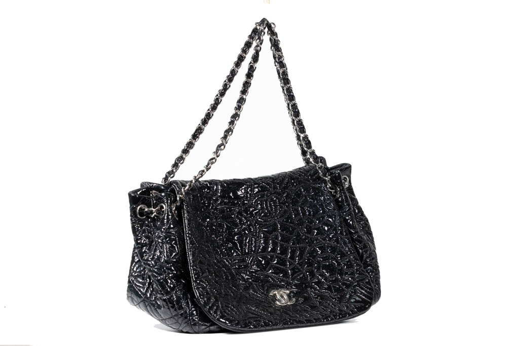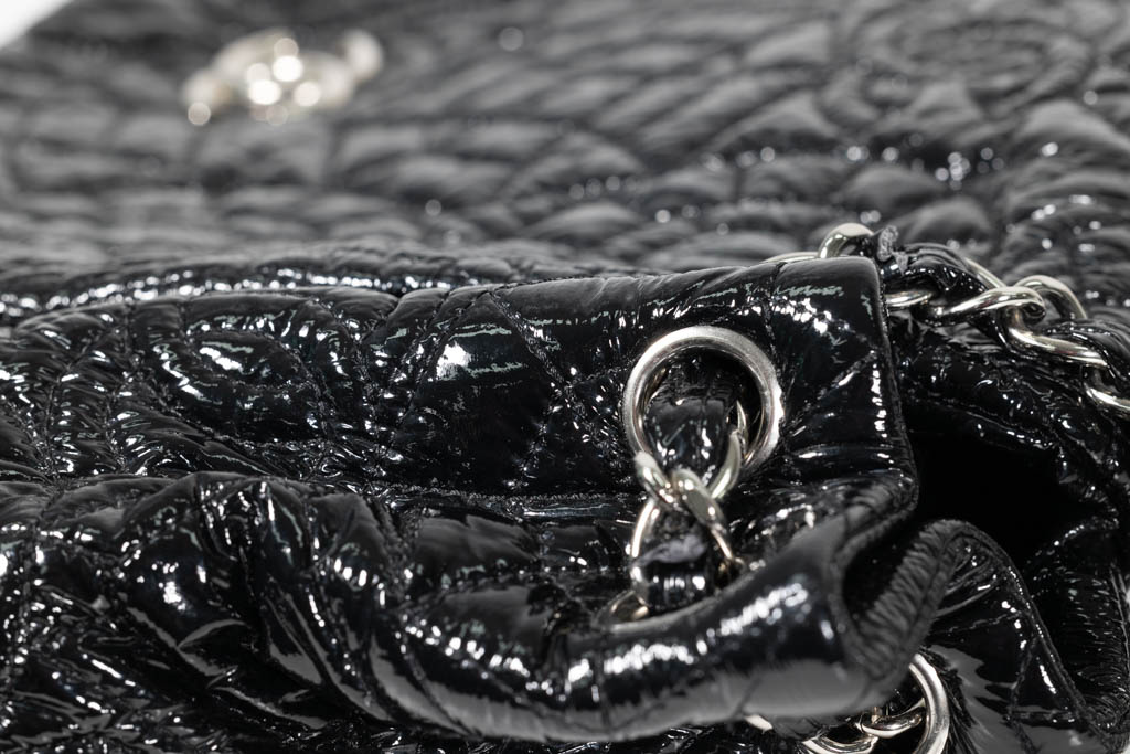 Chanel Vinyl Graphic Edge Flap Bag. Featuring black vinyl embroidery with an abstract graphic camellia flower pattern exterior, silver-tone hardware, grey satin lined interior, front flap and magnetic closure. With Entrupy Certificate of Authenticity. (Pre-owned)