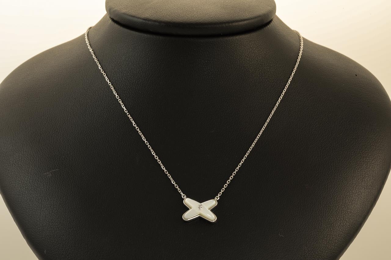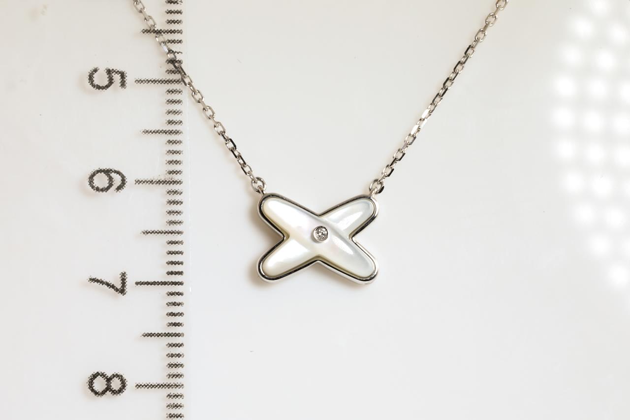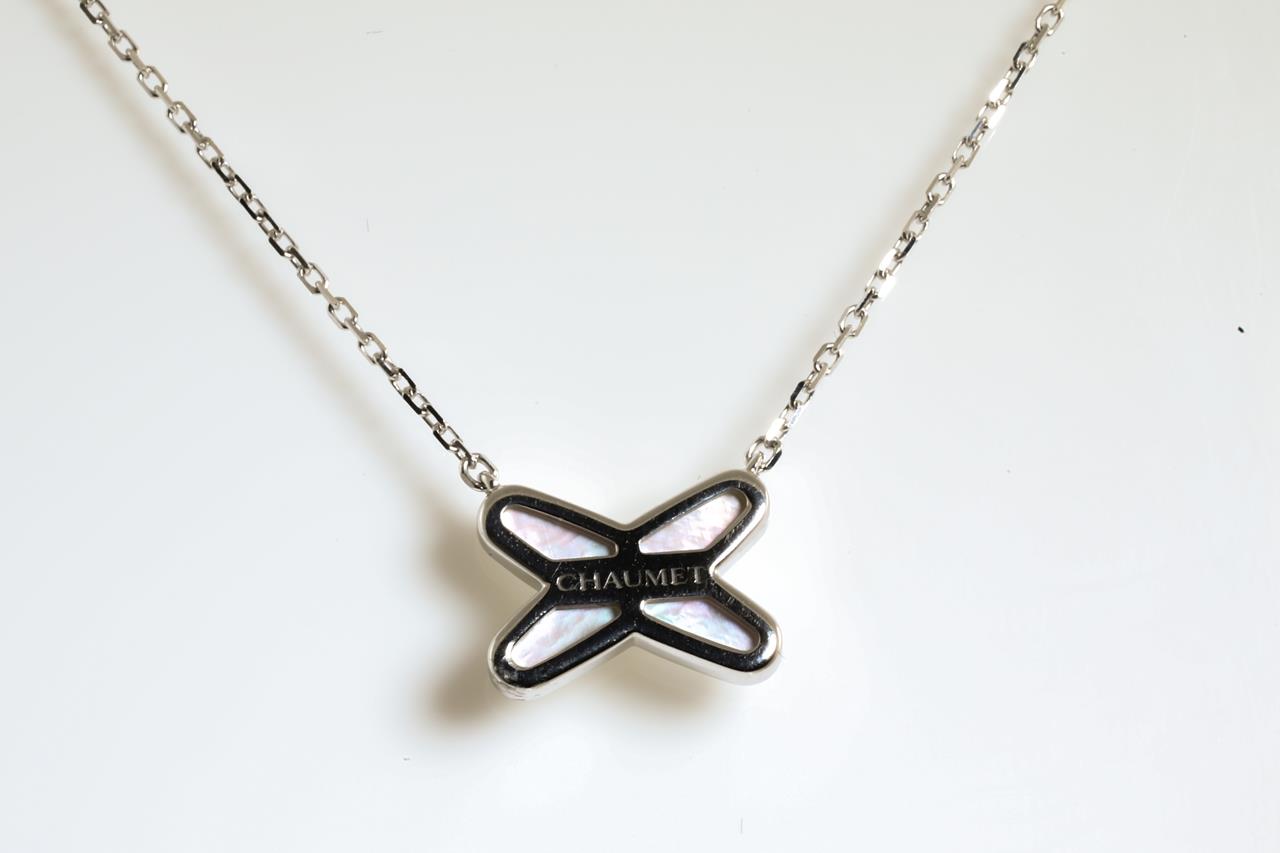 Chaumet Jeux de Liens Diamond and mother-of-pearl pendant with a Diamond of approximately 0.01ct. With Chaumet authenticity certificate #083161. 18ct white gold with attached chain. Adjustable max length: 41cm. Weight: 3.3g with Chaumet box. (Pre-owned)