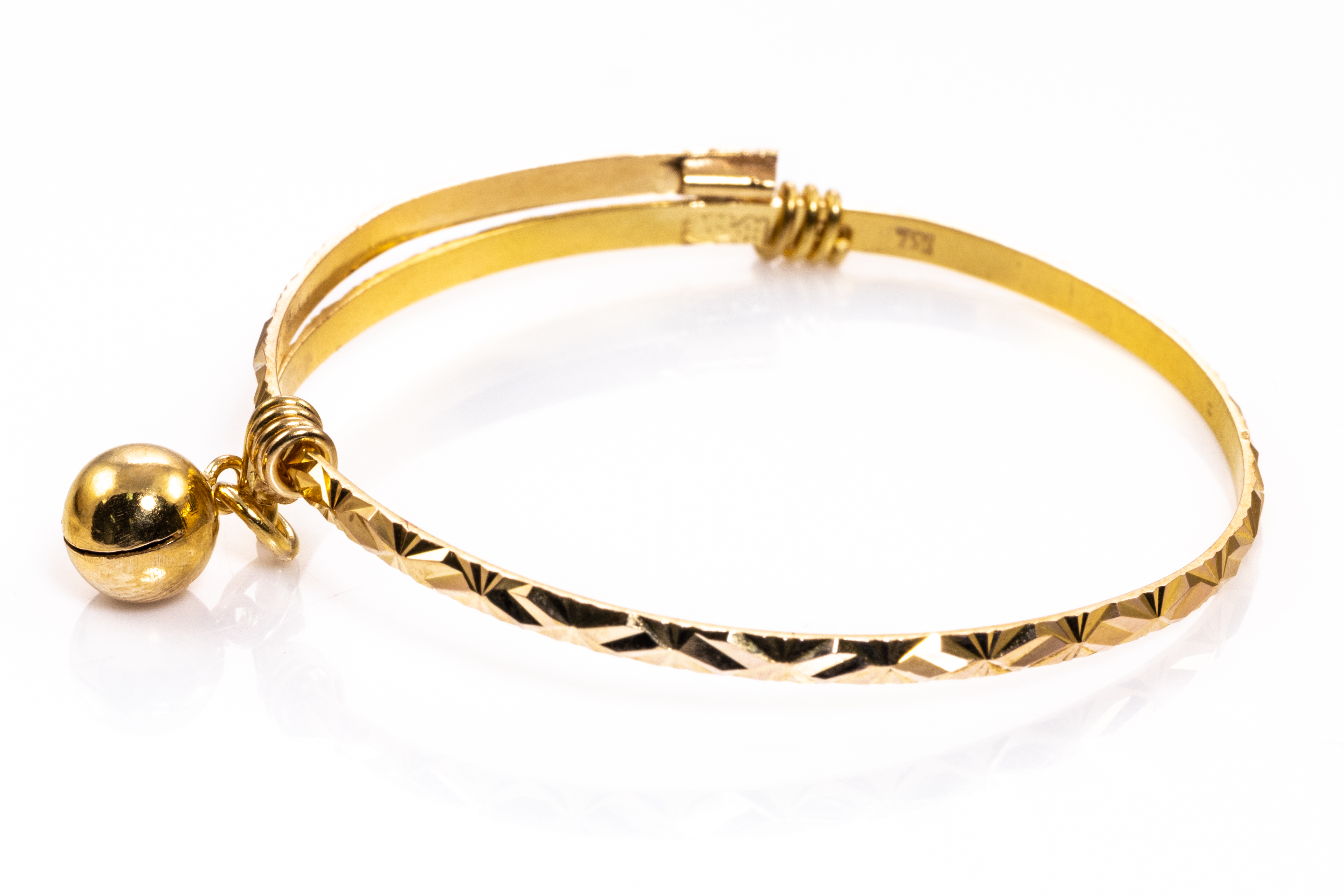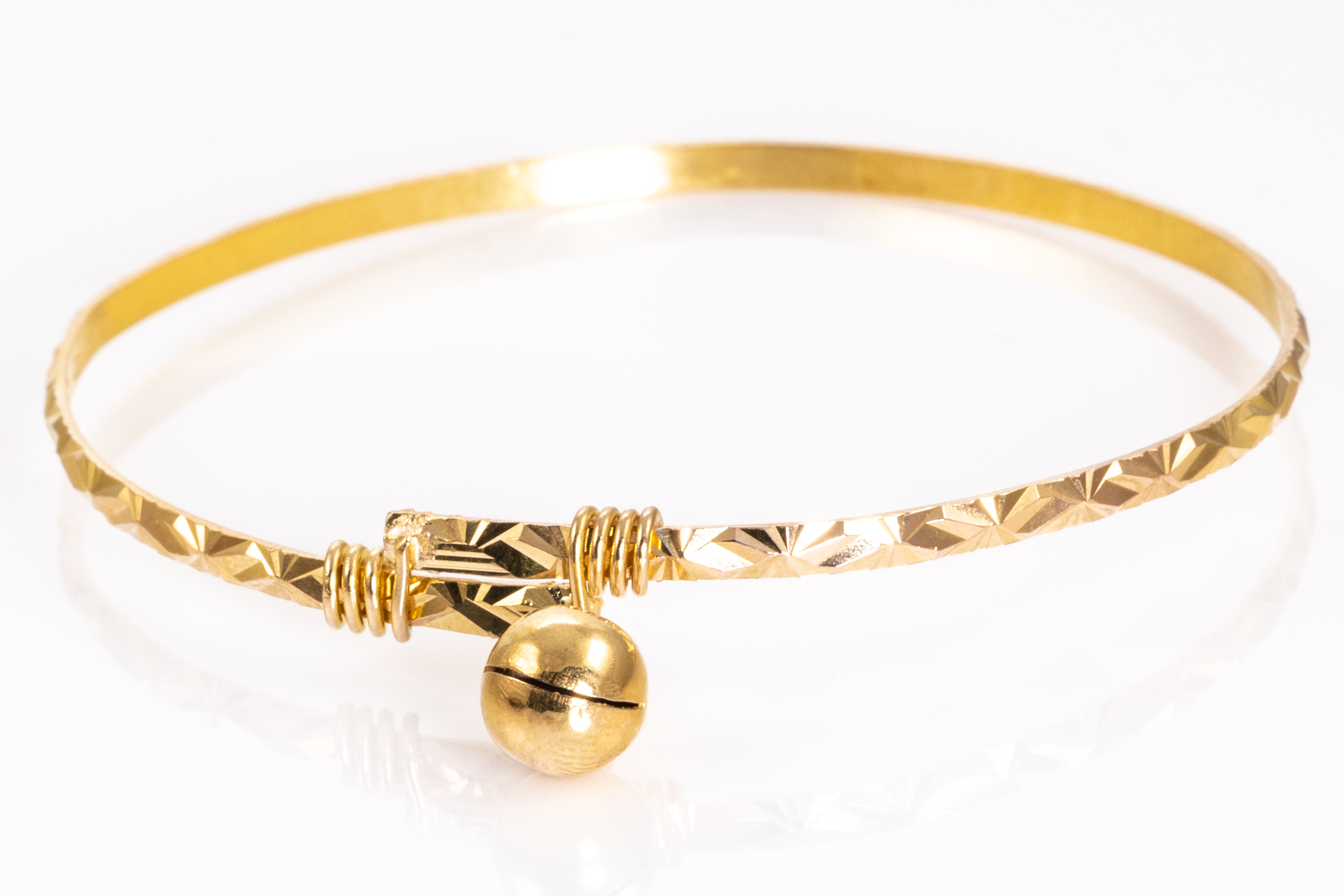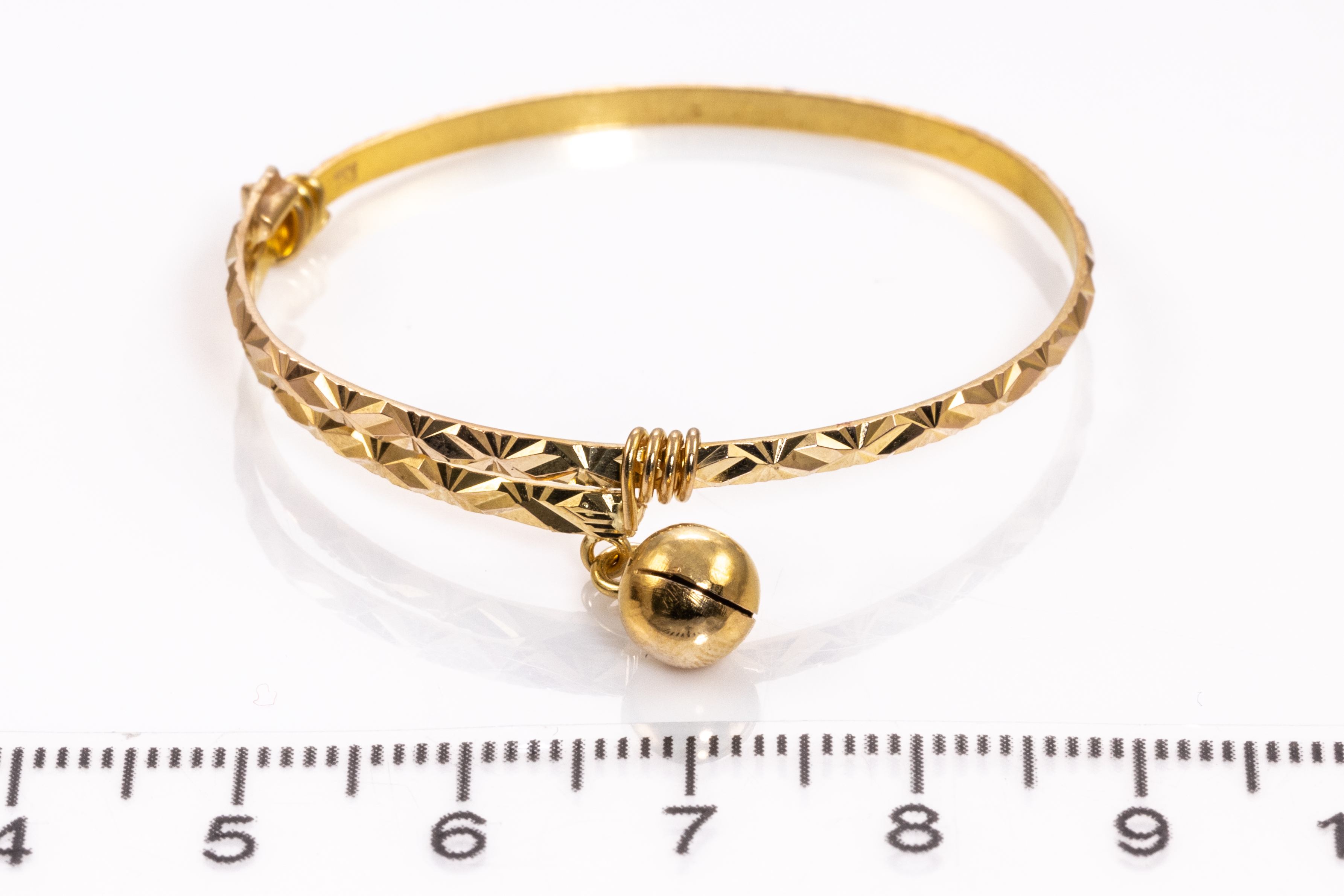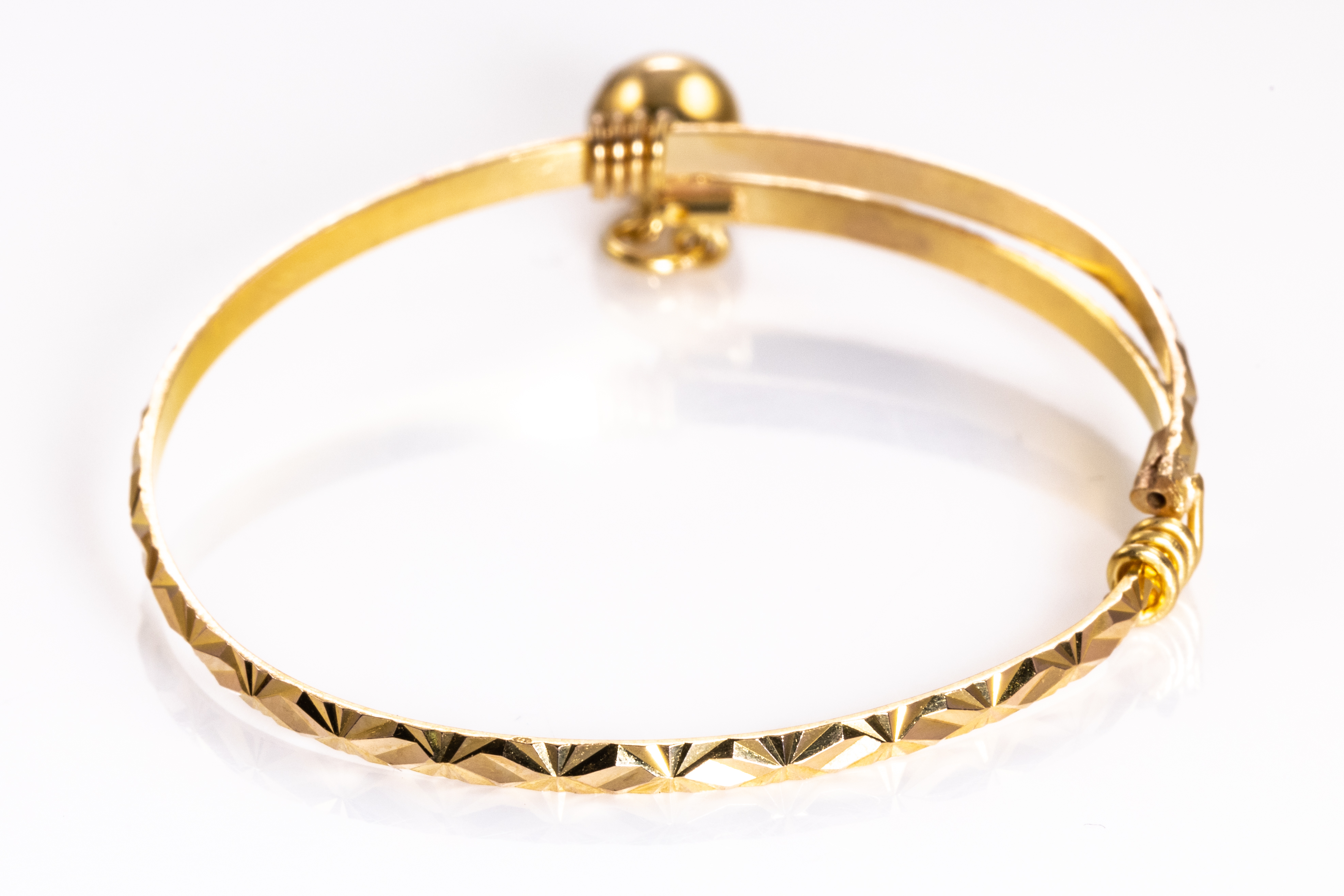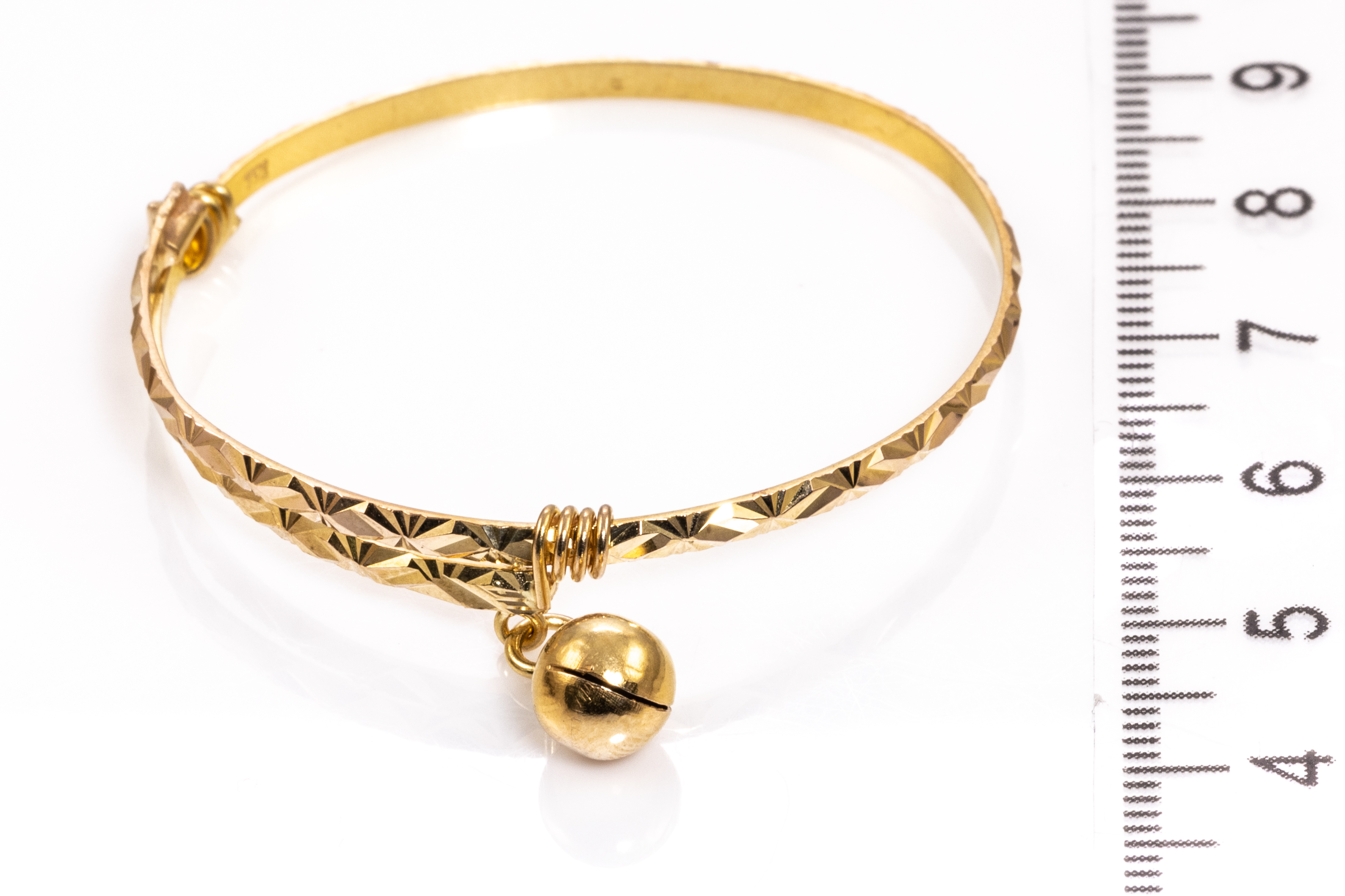 Child's expandable bangle with rattle. 18ct yellow gold. Circumference 12cm maximum. Diameter 3.8cm maximun. Width: 2.2mm. Weight 5.2g. (Pre-owned)