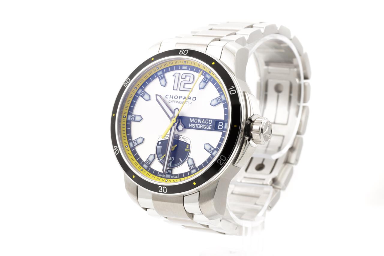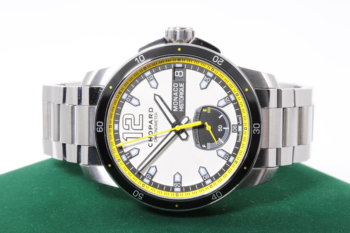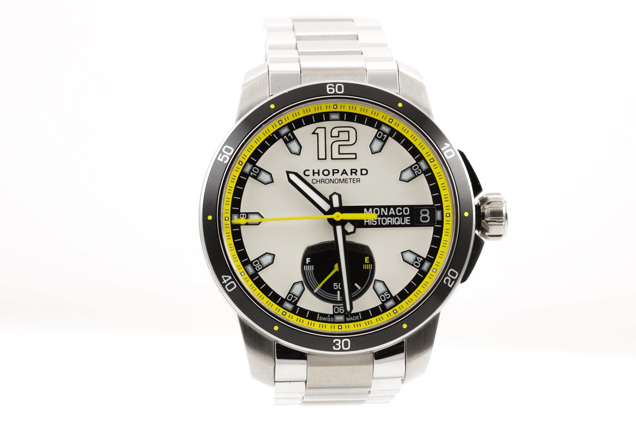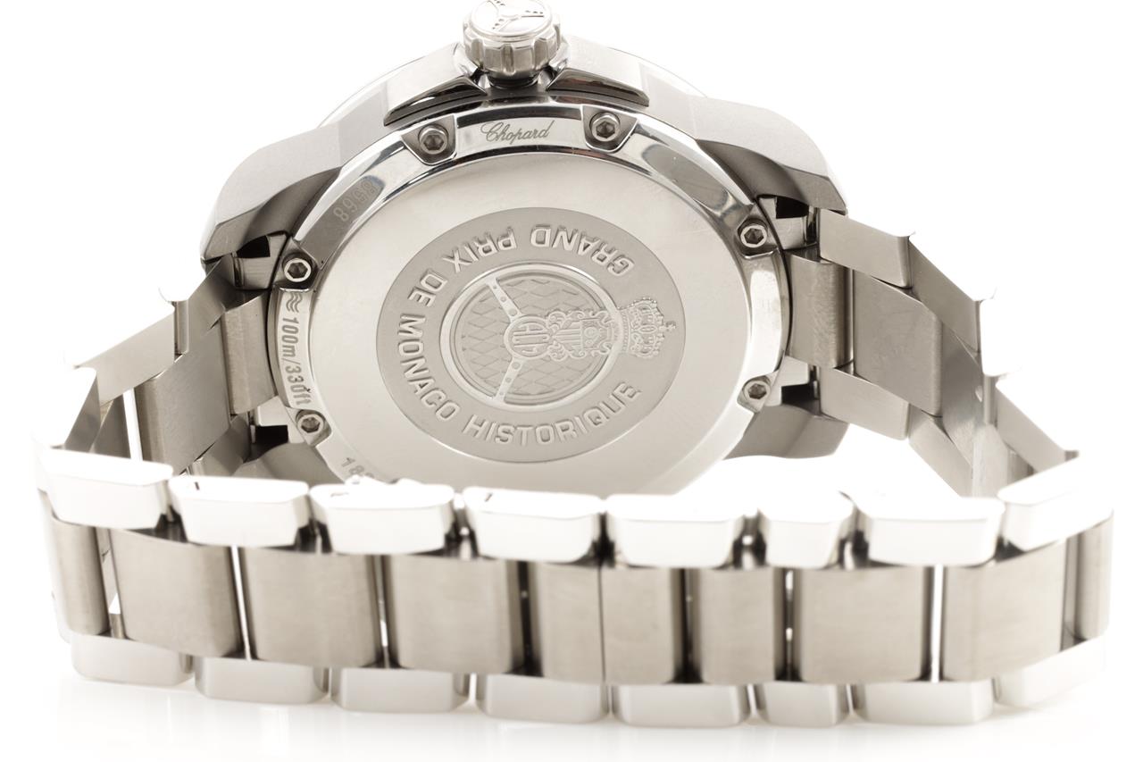 Chopard Grand Prix De Monaco Historique titanium and stainless steel automatic mens watch. Silver dial, date, case diameter: 44.5mm, wrist size: 19cm, Swiss made. Ref# 158569-3001/8568. With Chopard stainless steel bracelet and clasp. With Chopard master watchmaking tax invoice dated 2/8/21, Chopard certificate of origin dated 28/12/2019 and Chopard box. 3 month FSA warranty. (Pre-owned)