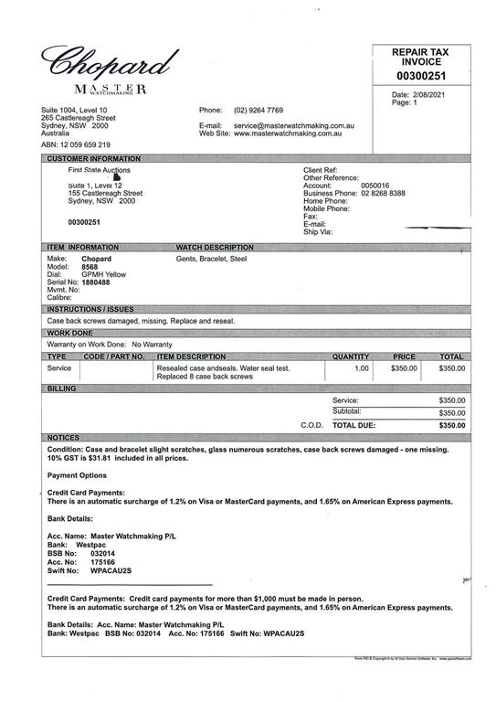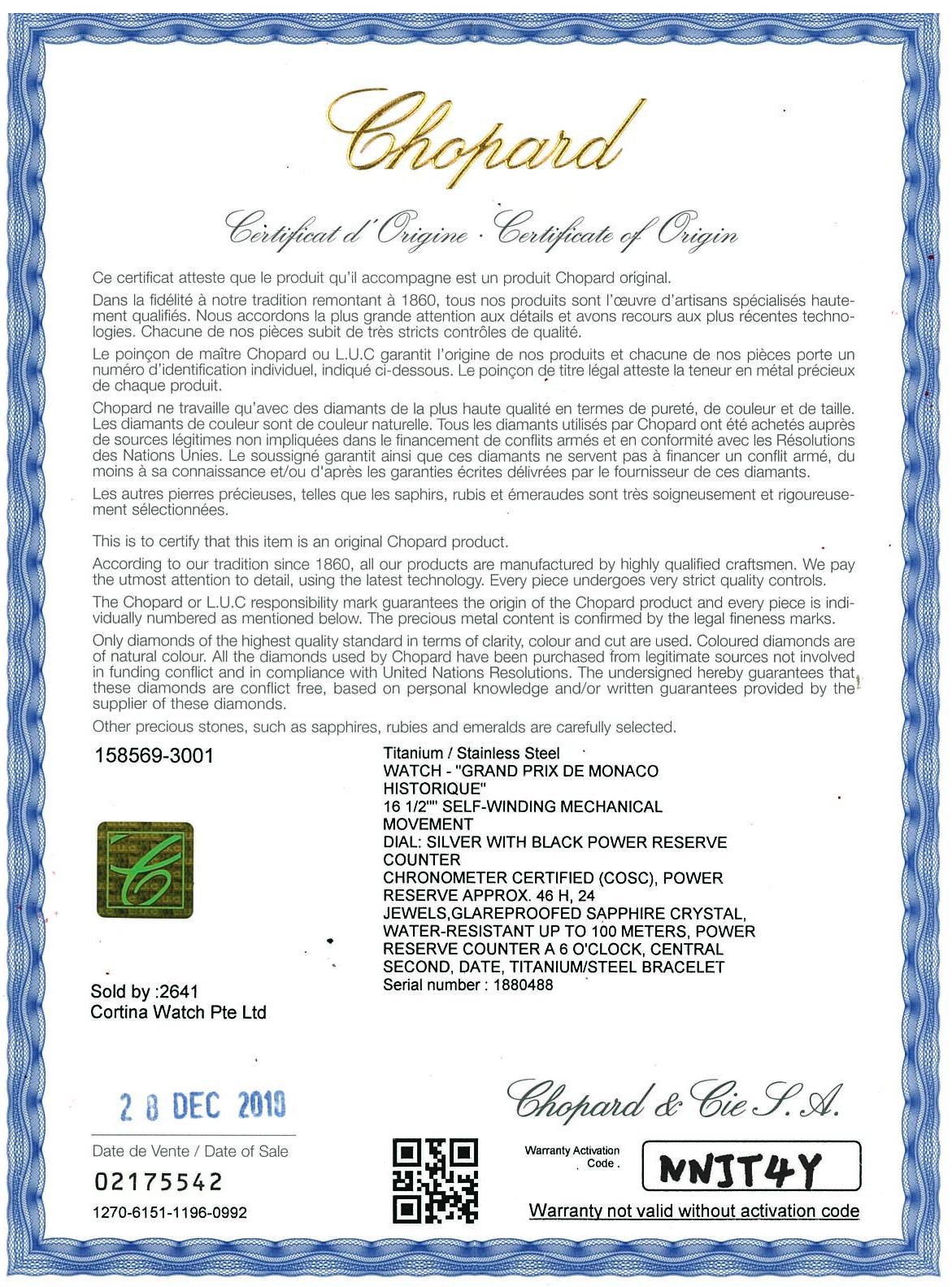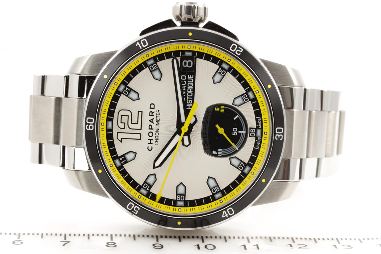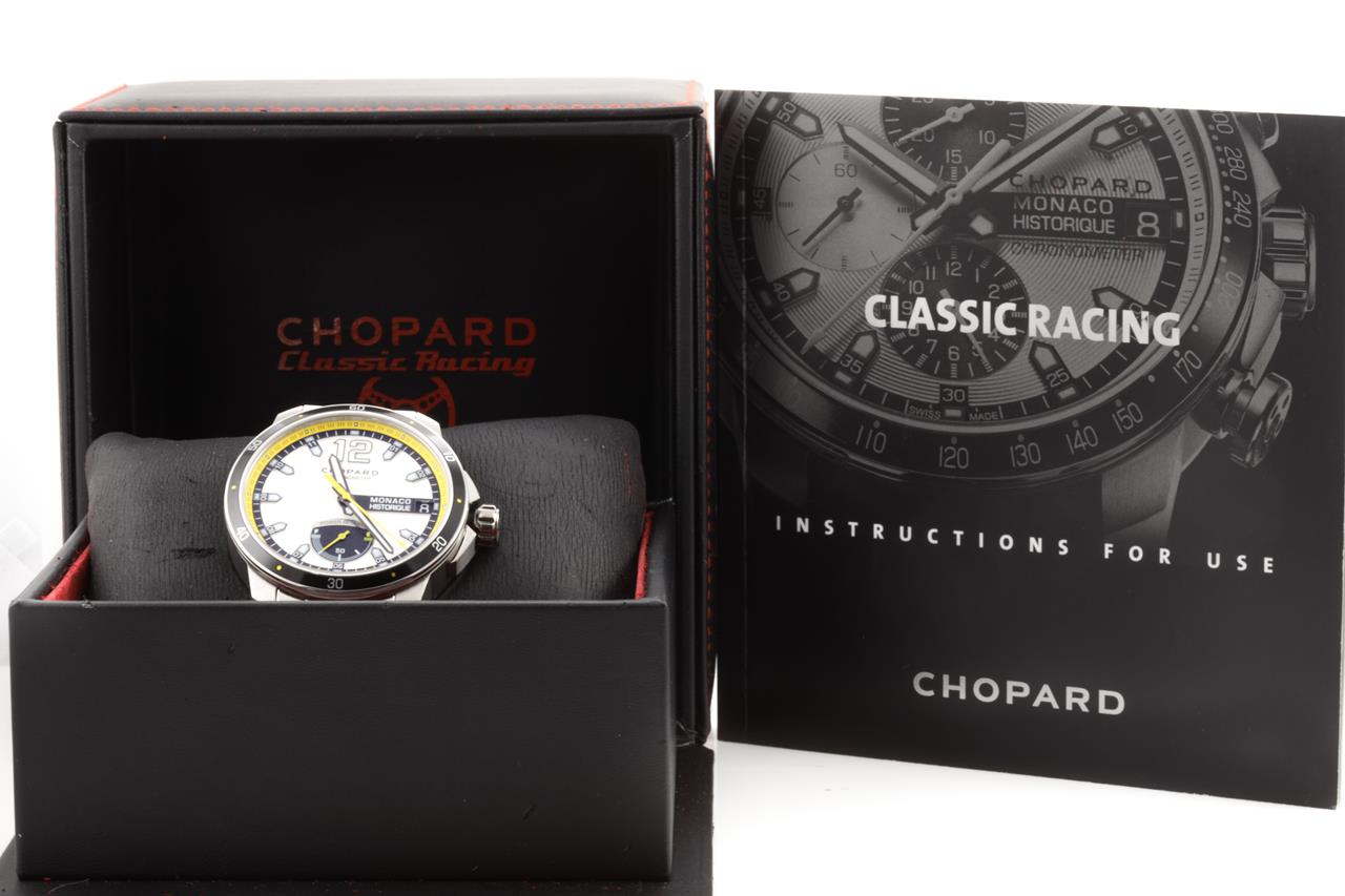 Chopard Grand Prix De Monaco Historique titanium and stainless steel automatic mens watch. Silver dial, date, case diameter: 44.5mm, wrist size: 19cm, Swiss made. Ref# 158569-3001/8568. With Chopard stainless steel bracelet and clasp. With Chopard master watchmaking tax invoice dated 2/8/21, Chopard certificate of origin dated 28/12/2019 and Chopard box. 3 month FSA warranty. (Pre-owned)