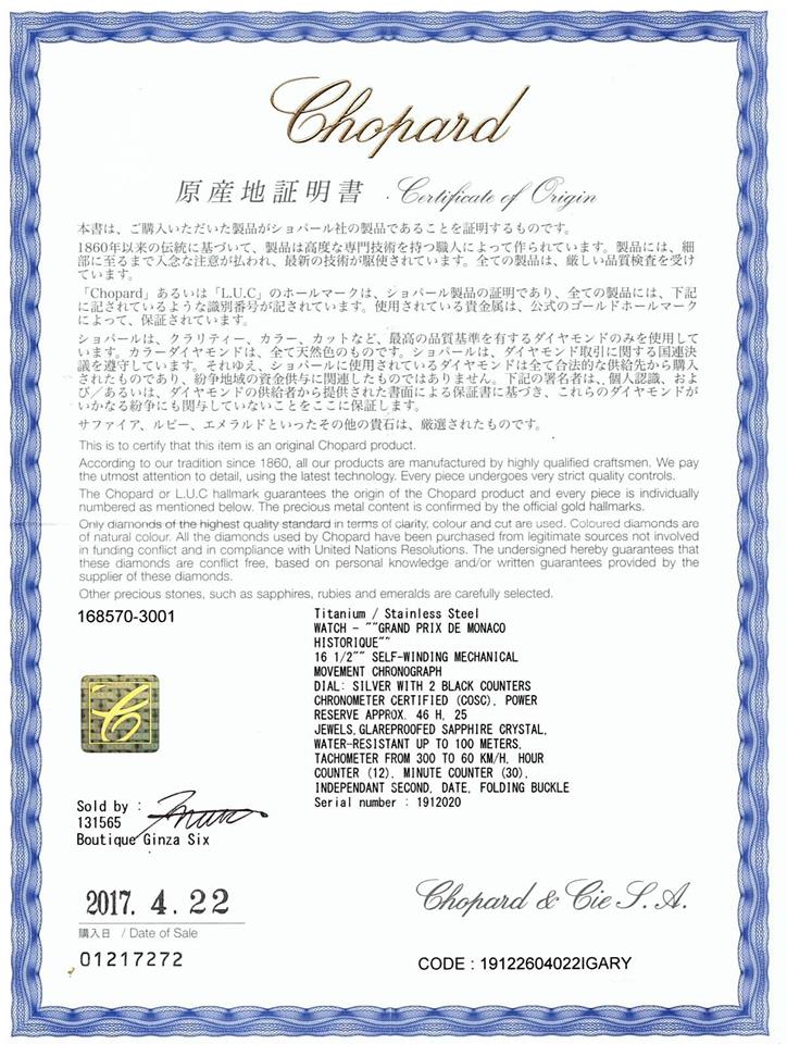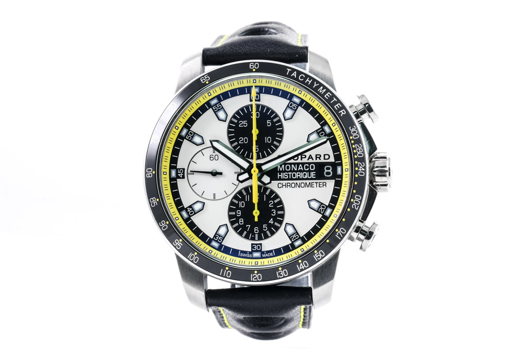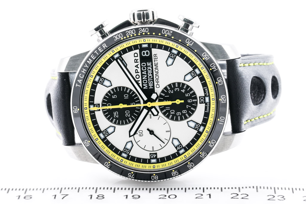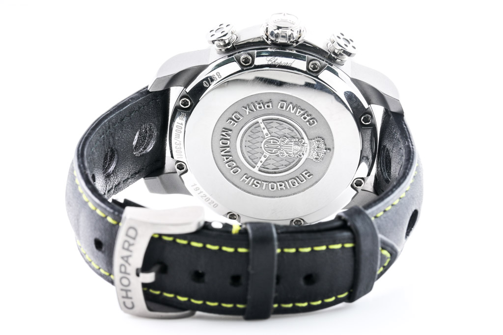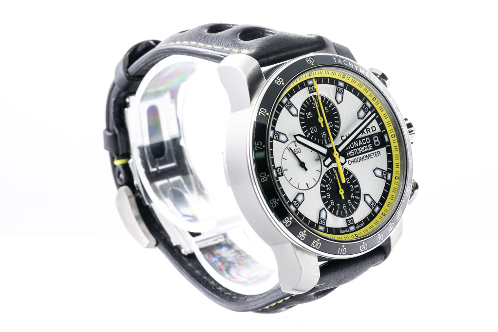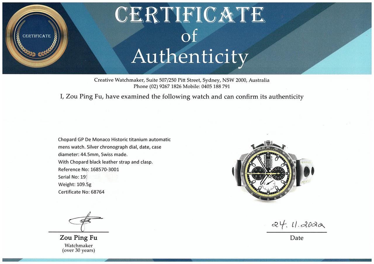 Chopard Grand Prix De Monaco Historique titanium automatic mens watch. Silver chronograph dial, date, case diameter: 44.5mm, adjustable max wrist size: 20.cm, Swiss made. Ref# 168570-3001. With Chopard black leather strap and clasp. With Certificate of Authenticity, Chopard Certificate of Origin dated 22/04/2017 and Chopard box. 3 month FSA warranty. (Pre-owned)