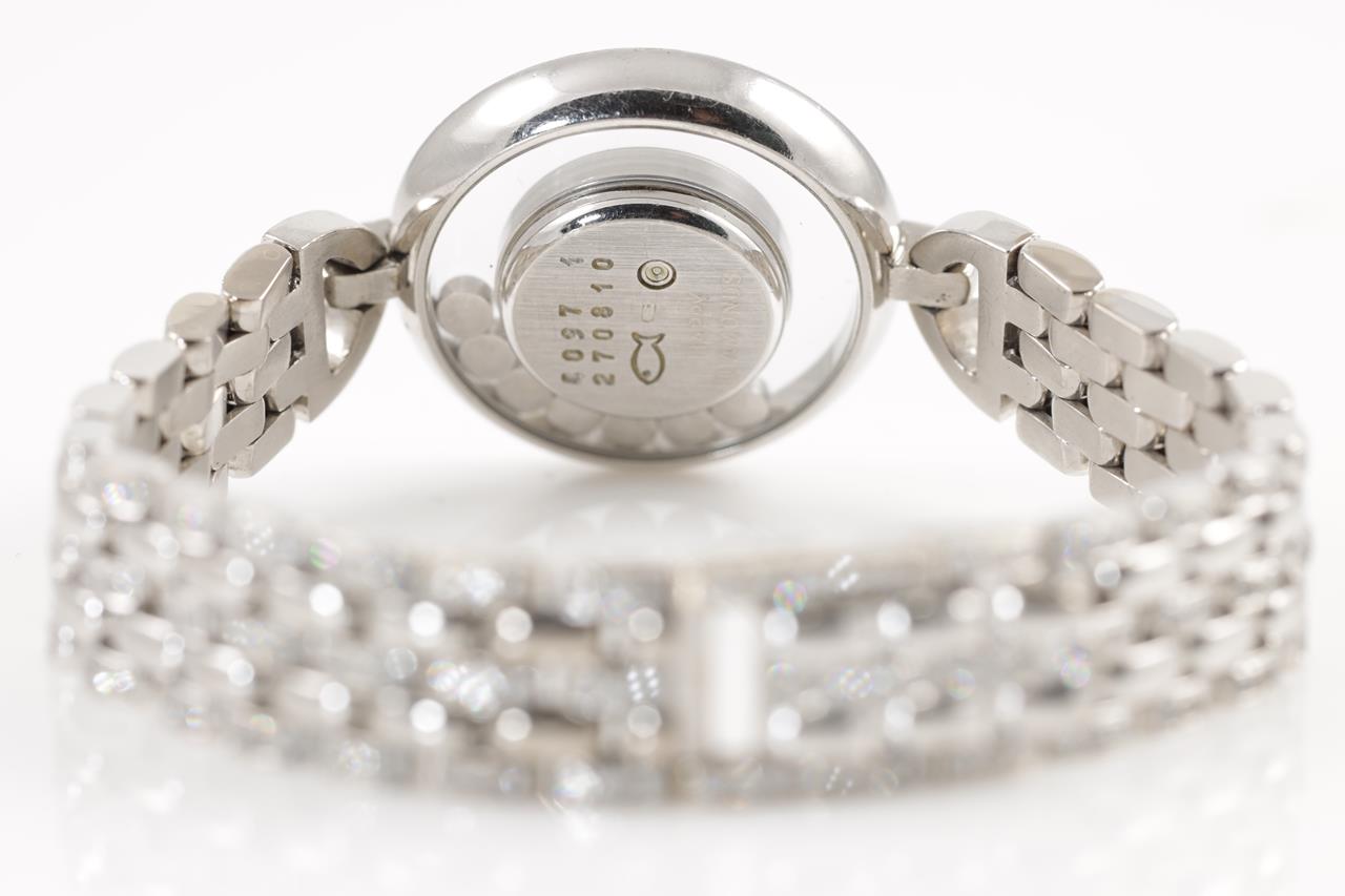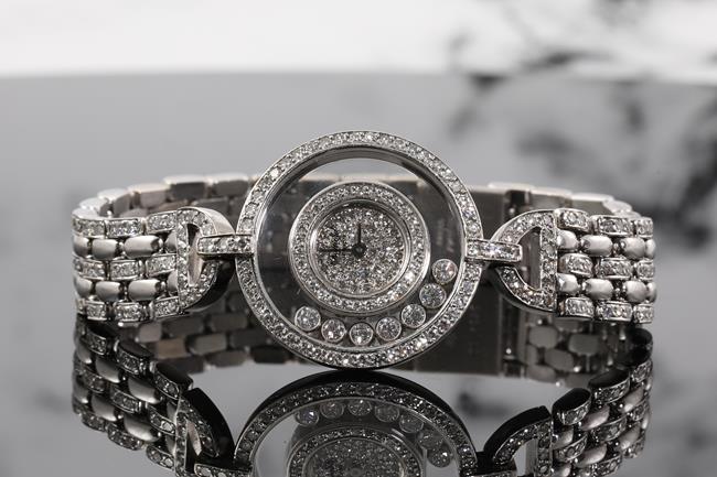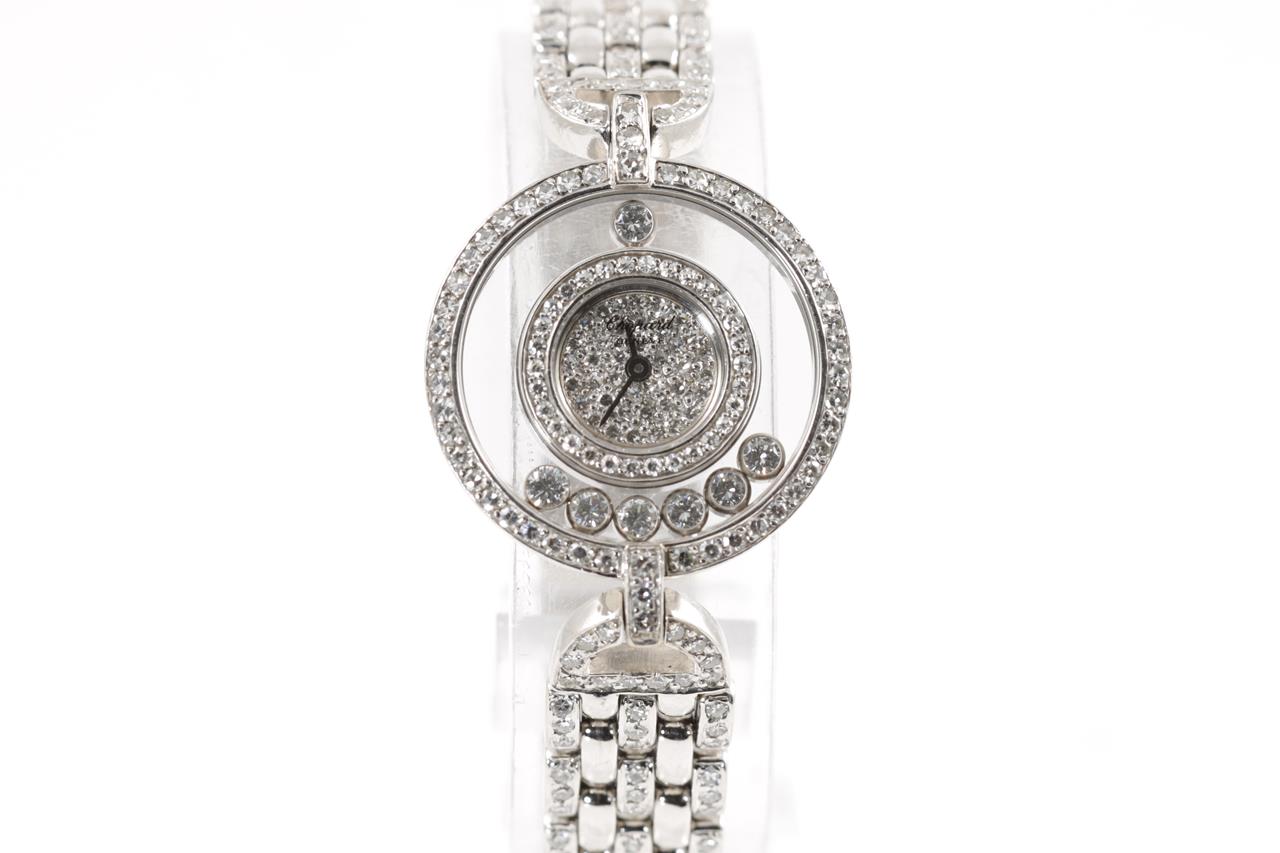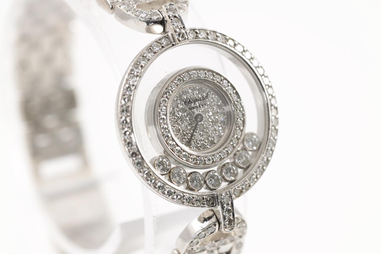 Chopard Happy Diamond 18ct white gold quartz ladies watch. Diamond set dial and bezel, 7 floating Diamonds and Diamonds on the lugs, case diameter: 24mm, length: 15cm, Swiss made. Ref# 4097. With Chopard 18ct gold with Diamonds on bracelet and clasp. With Chopard case. With certificate of authenticity. 3 month FSA warranty. (Pre-owned)