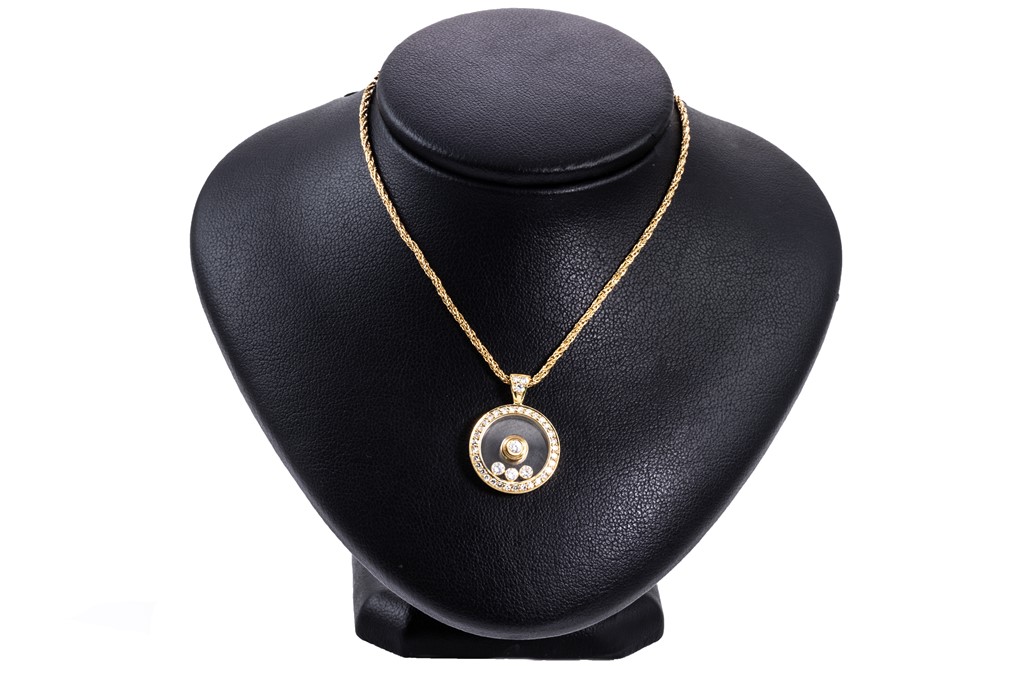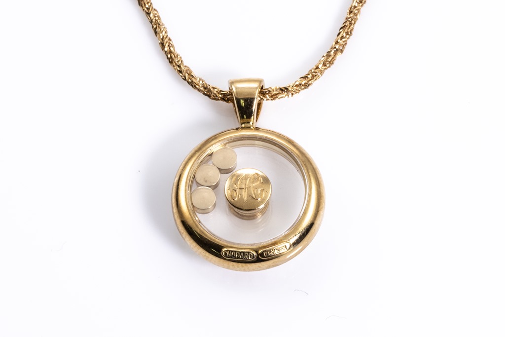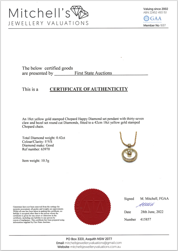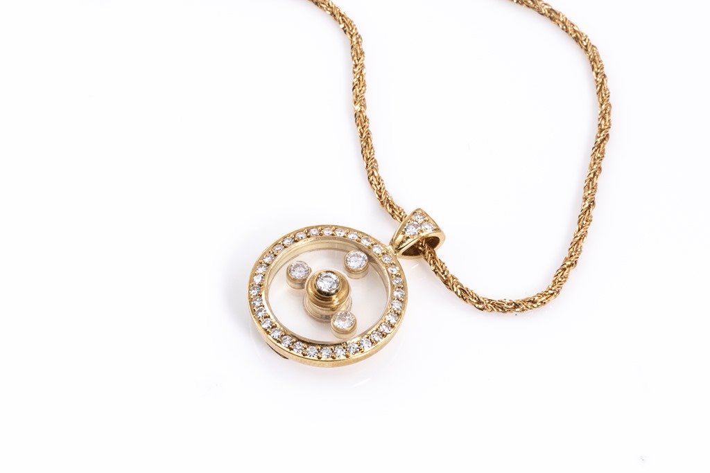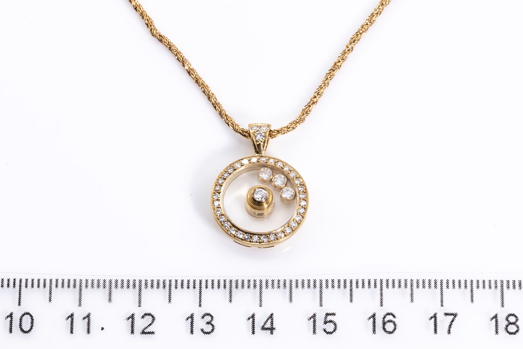 Chopard Happy Diamonds pendant with round Diamonds totalling approximately 0.42cts (Estimated grading: F VS). 18ct yellow gold with 18ct yellow gold Chopard 42cm chain. With personal engraving on back AC. Weight: 10.5g. With worn Chopard box. With certificate #415857. (Pre-owned)