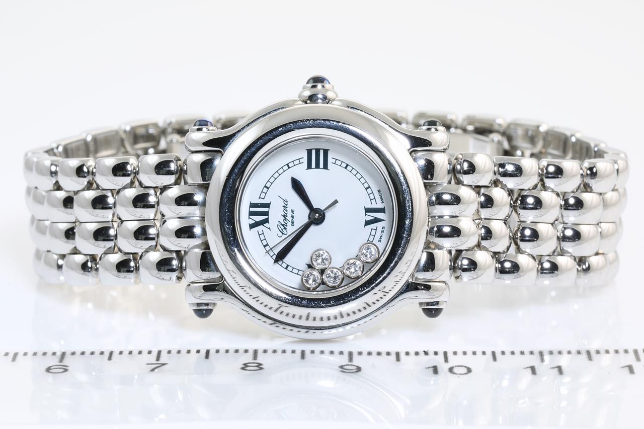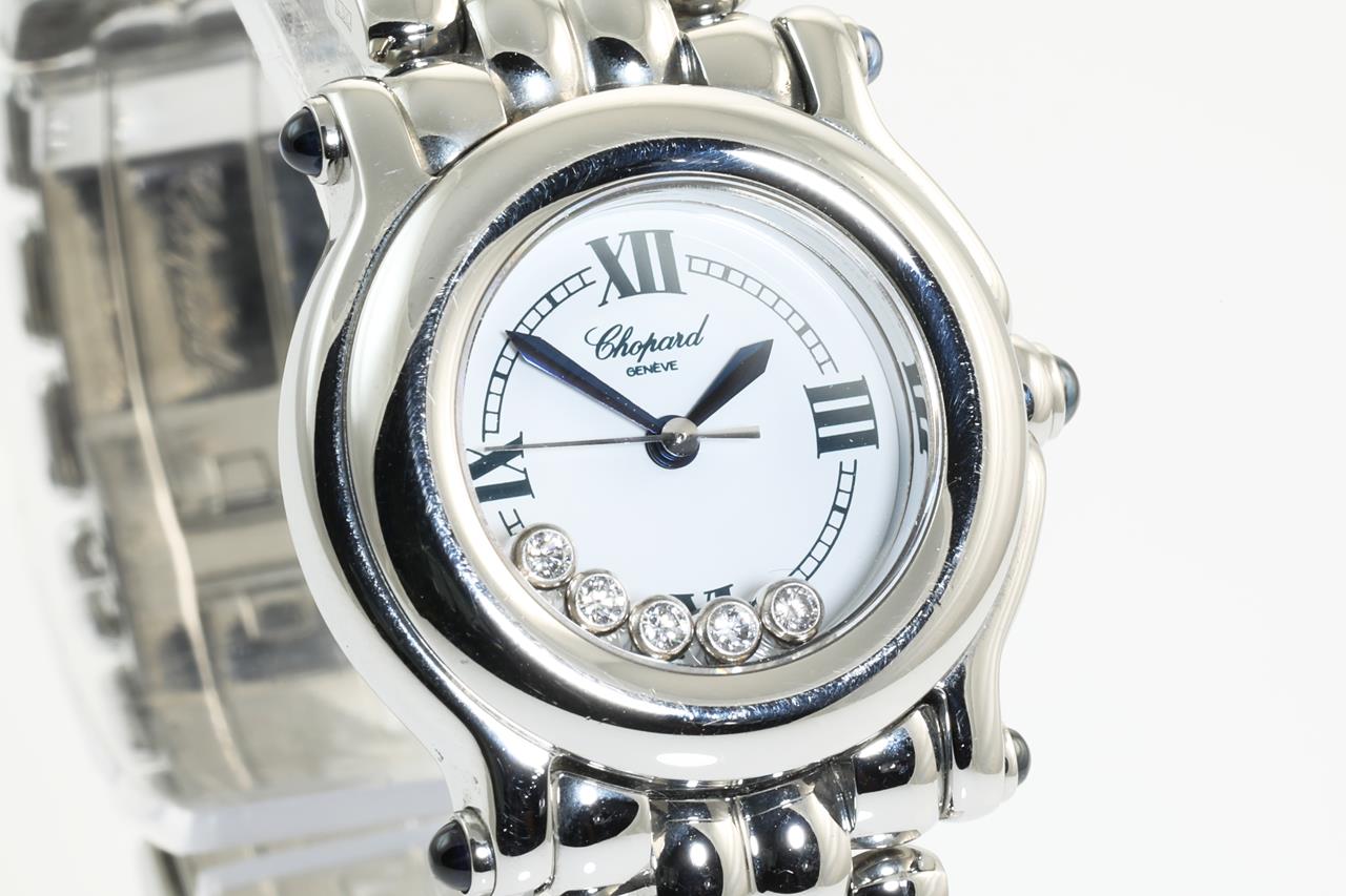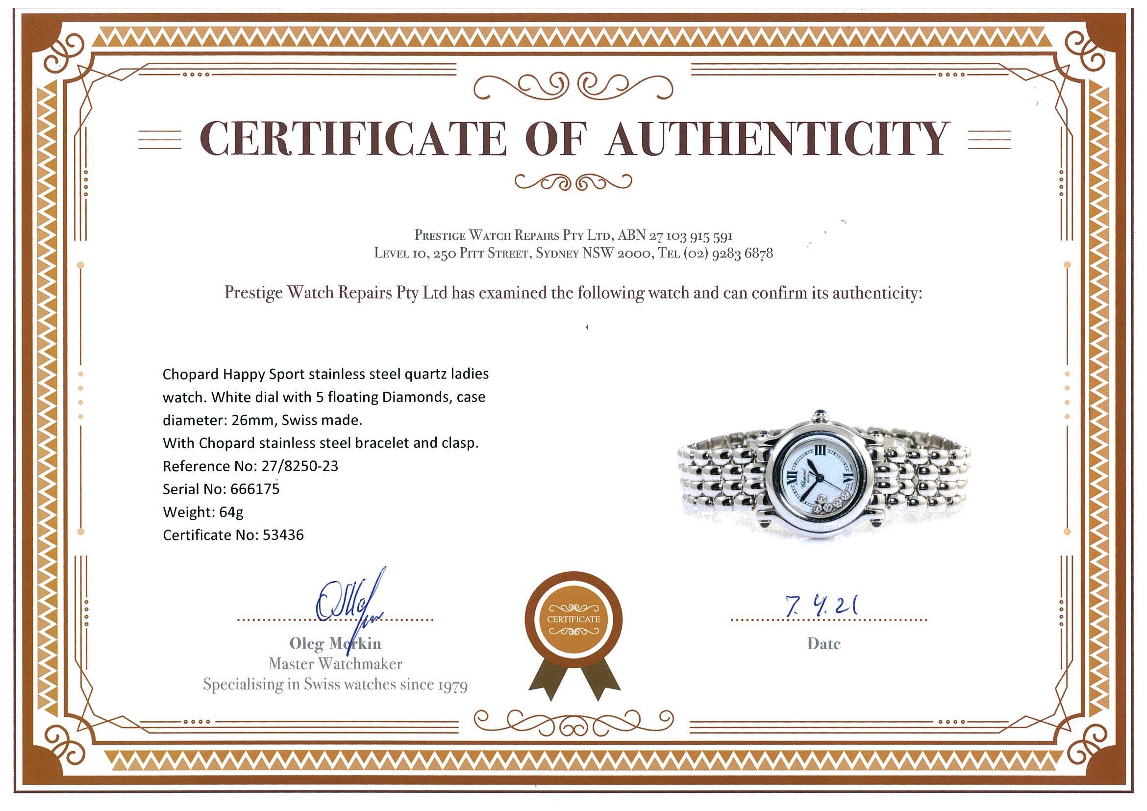 Chopard Happy Sport stainless steel quartz ladies watch. White dial with 5 floating Diamonds, case diameter: 26mm, wrist size: 16cm, Swiss made. Ref# 27/8250-23. With Chopard stainless steel bracelet and clasp. With Certificate of authenticity and Chopard box. 3 month FSA warranty. (Pre-owned)