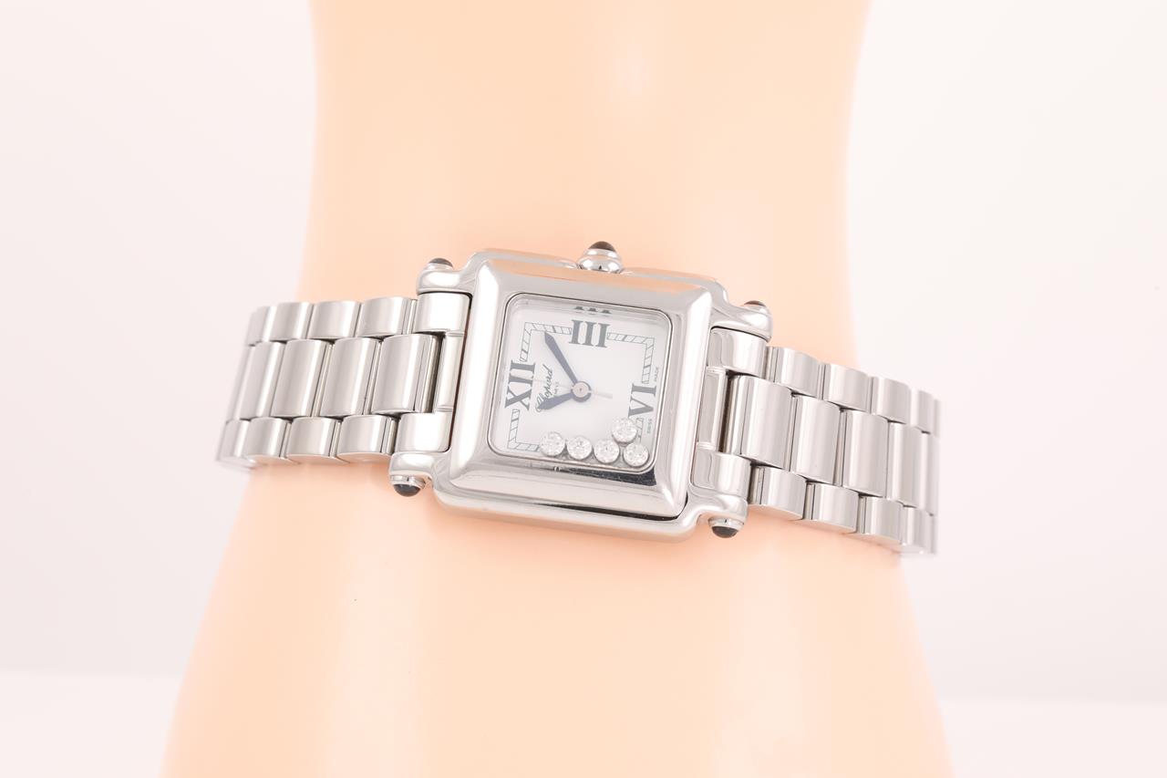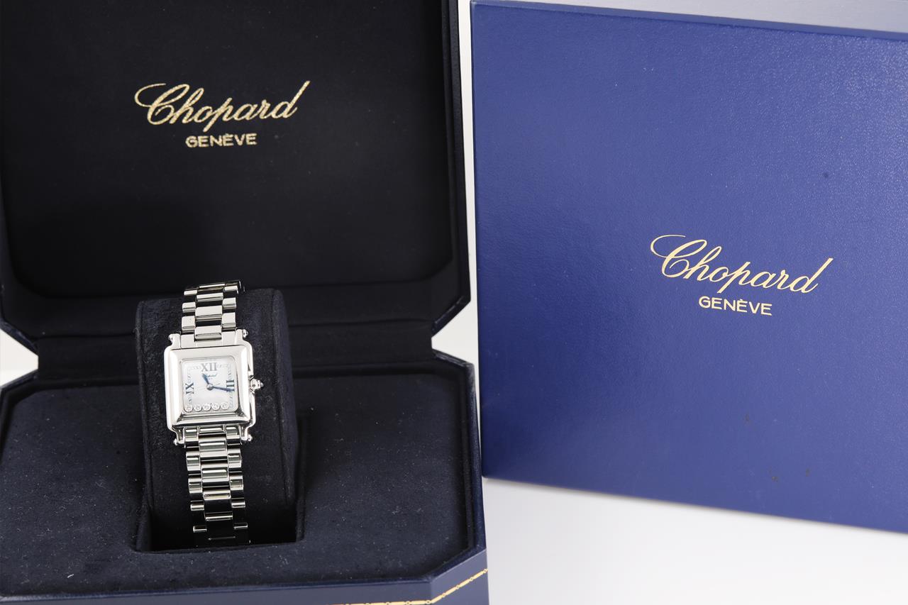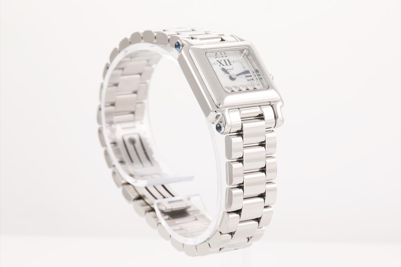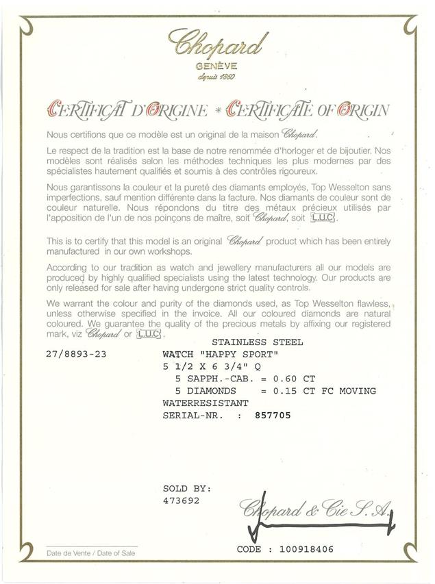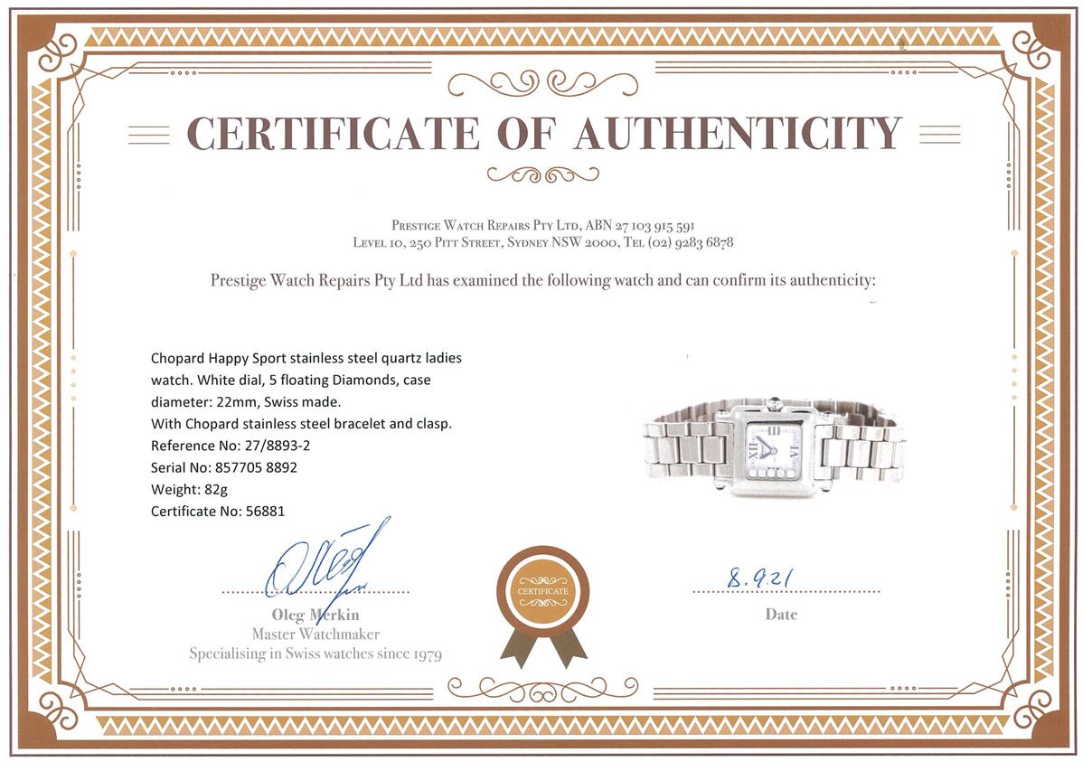Chopard Happy Sport stainless steel quartz ladies watch. White dial, 5 floating Diamonds, case diameter: 22mm, wrist size: 17cm, Swiss made. With Chopard stainless steel bracelet and clasp. Ref# 27/8893-23. With certificate of authenticity, Chopard certificate of Origin and Chopard Box. 3 month FSA warranty. (Pre-owned)