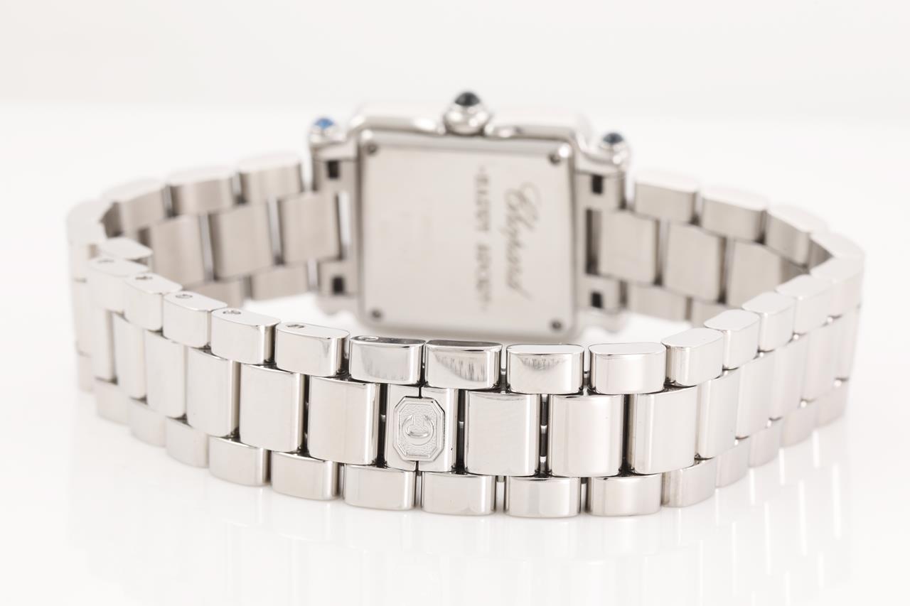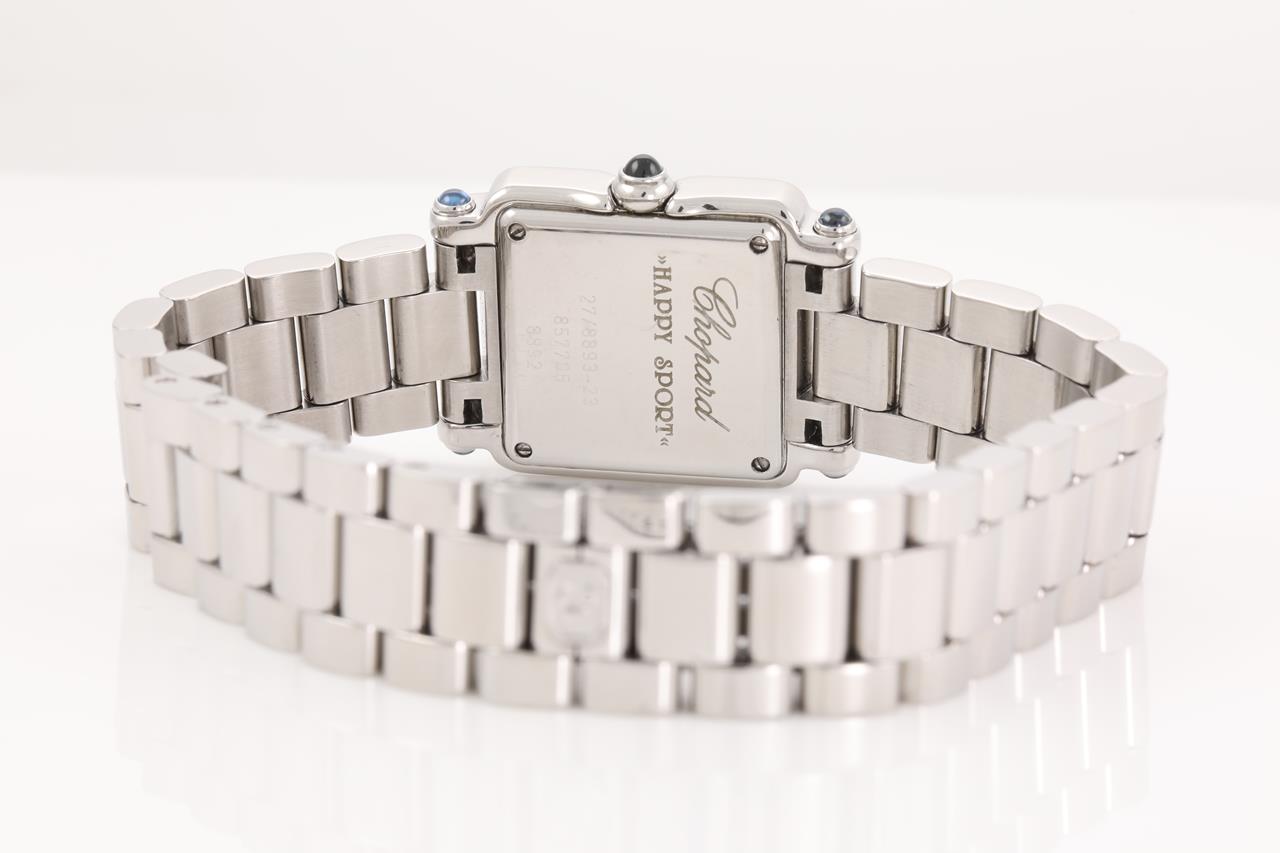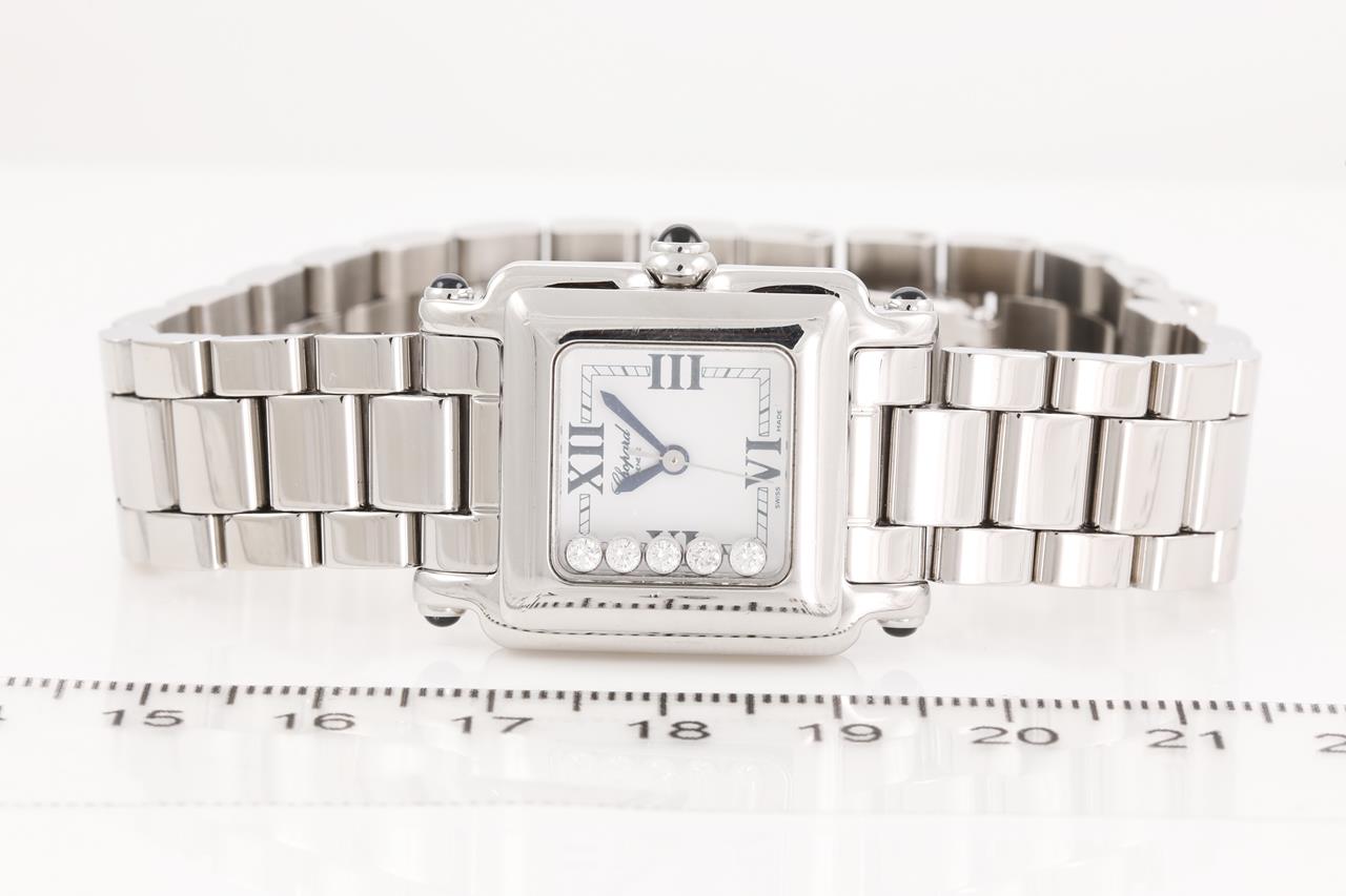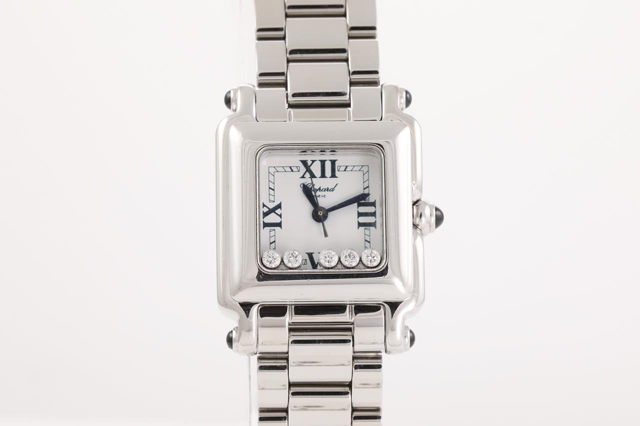 Chopard Happy Sport stainless steel quartz ladies watch. White dial, 5 floating Diamonds, case diameter: 22mm, wrist size: 17cm, Swiss made. With Chopard stainless steel bracelet and clasp. Ref# 27/8893-23. With certificate of authenticity, Chopard certificate of Origin and Chopard Box. 3 month FSA warranty. (Pre-owned)
