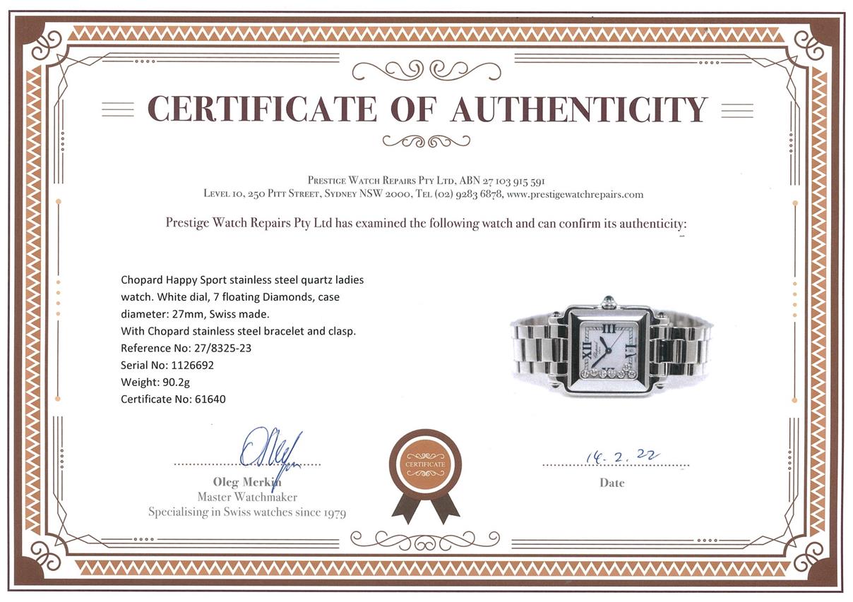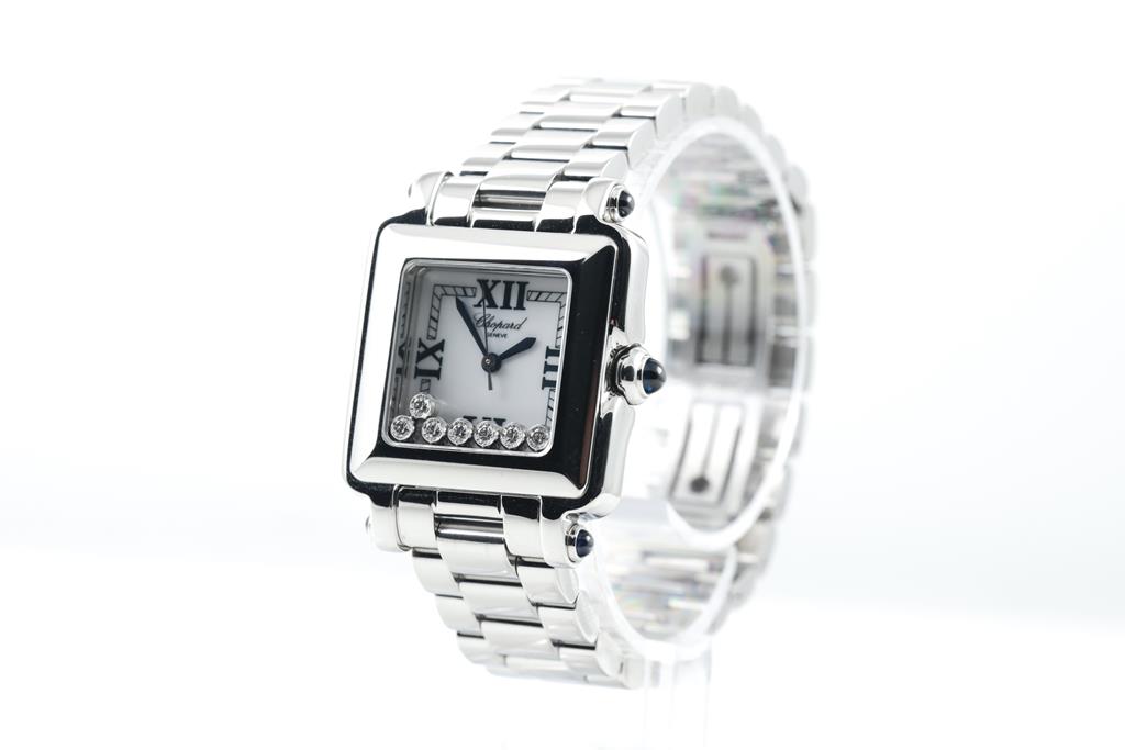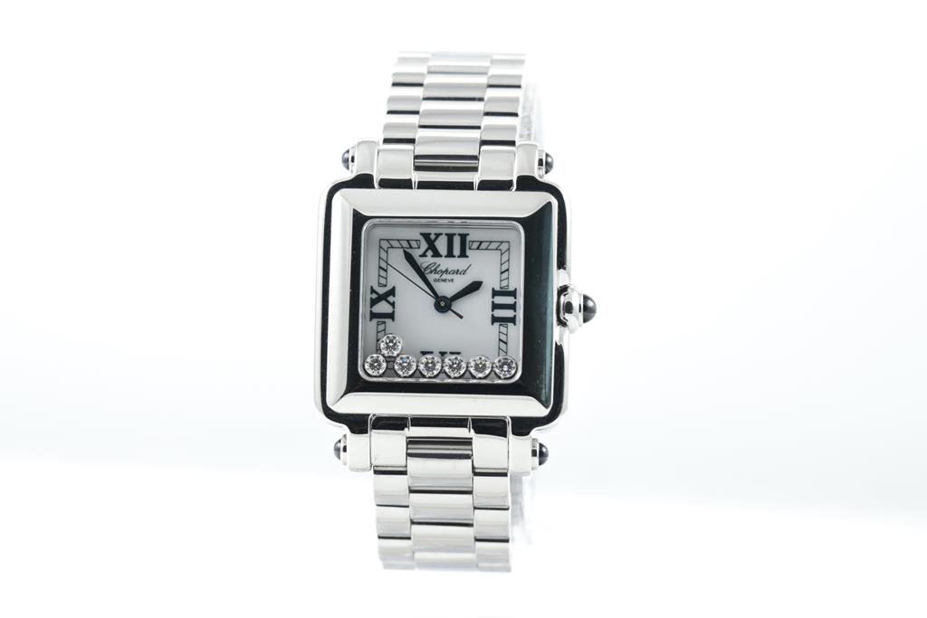 Chopard Happy Sport stainless steel quartz ladies watch. White dial, 7 floating Diamonds, case diameter: 27mm, wrist size: 16cm, Swiss made. Ref# 27/8349-23. With Chopard stainless steel bracelet and clasp. With Certificate of Authenticity, Chopard Certificate of Origin and Chopard box. 3 month FSA warranty. (Pre-owned)
