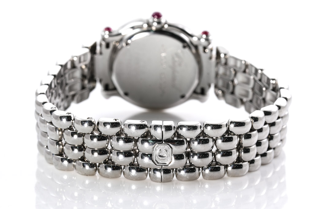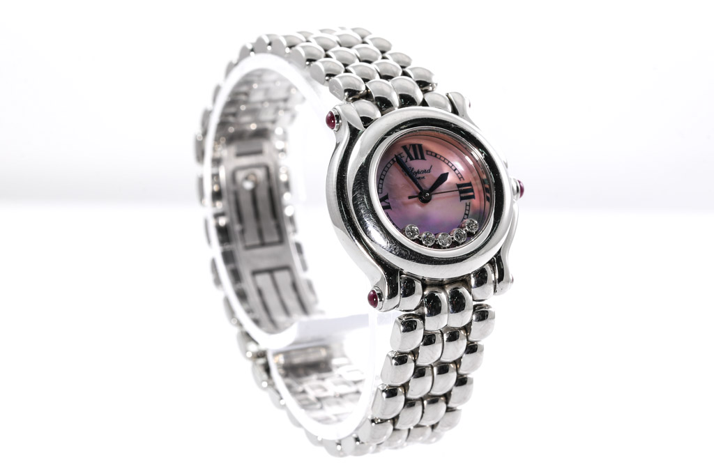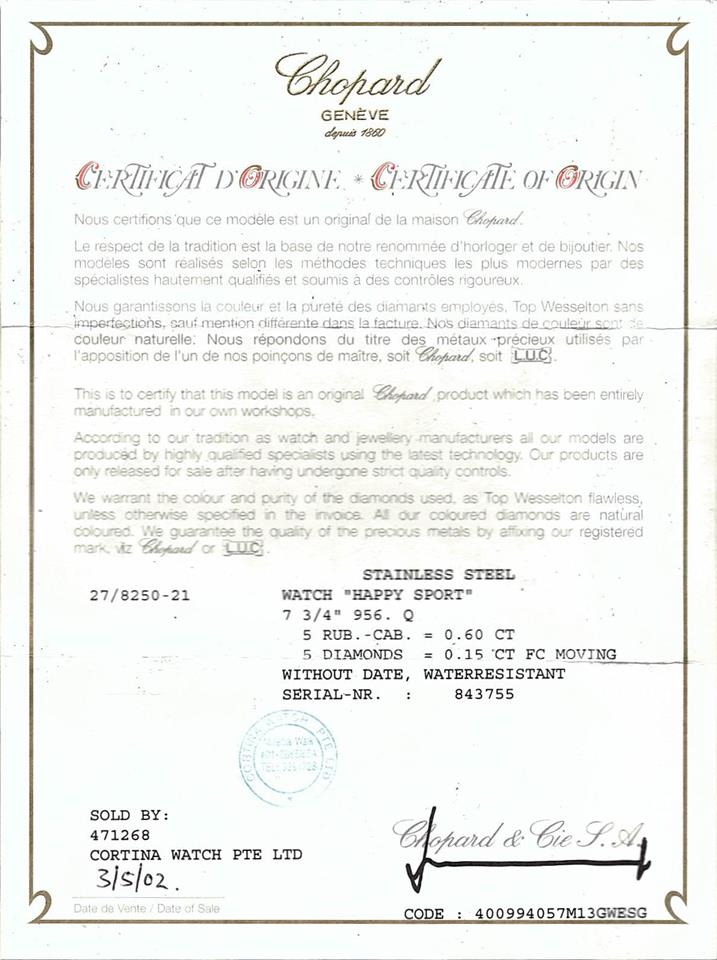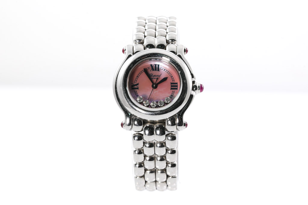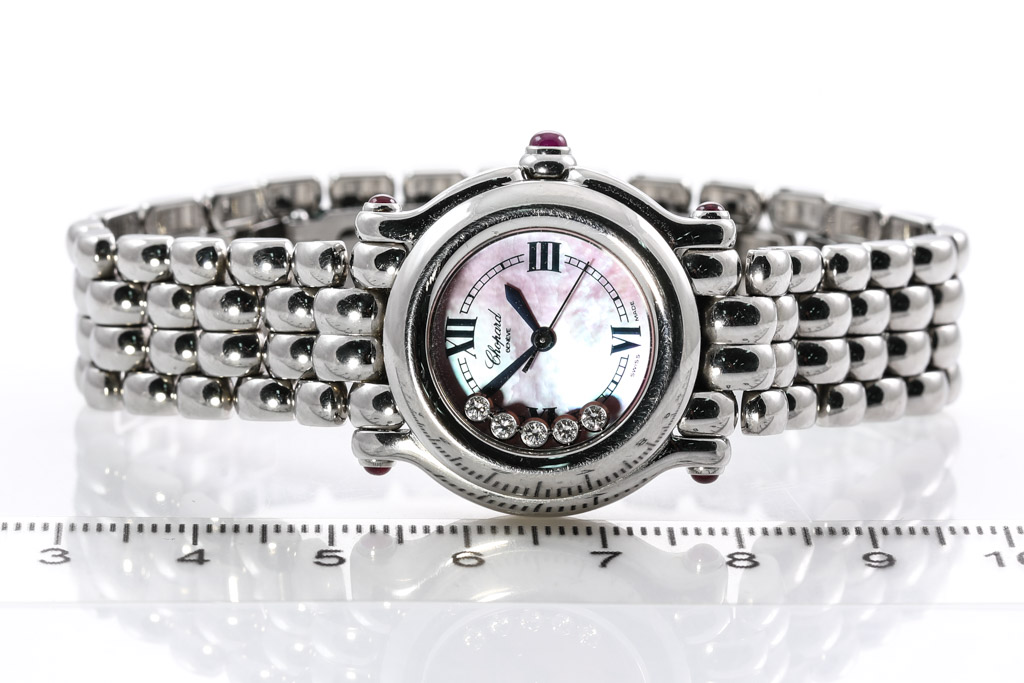 Chopard Happy Sport stainless steel quartz ladies watch. Mother of Pearl dial, 5 floating Diamonds, case diameter: 26mm, wrist size: 16cm, Swiss Made. Ref# 27/8250-21. With Chopard stainless steel bracelet and clasp. With Certificate of Authenticity, Chopard Certificate of Origin dated 03/05/2002 and Chopard box. 3 month FSA warranty (Pre-owned)